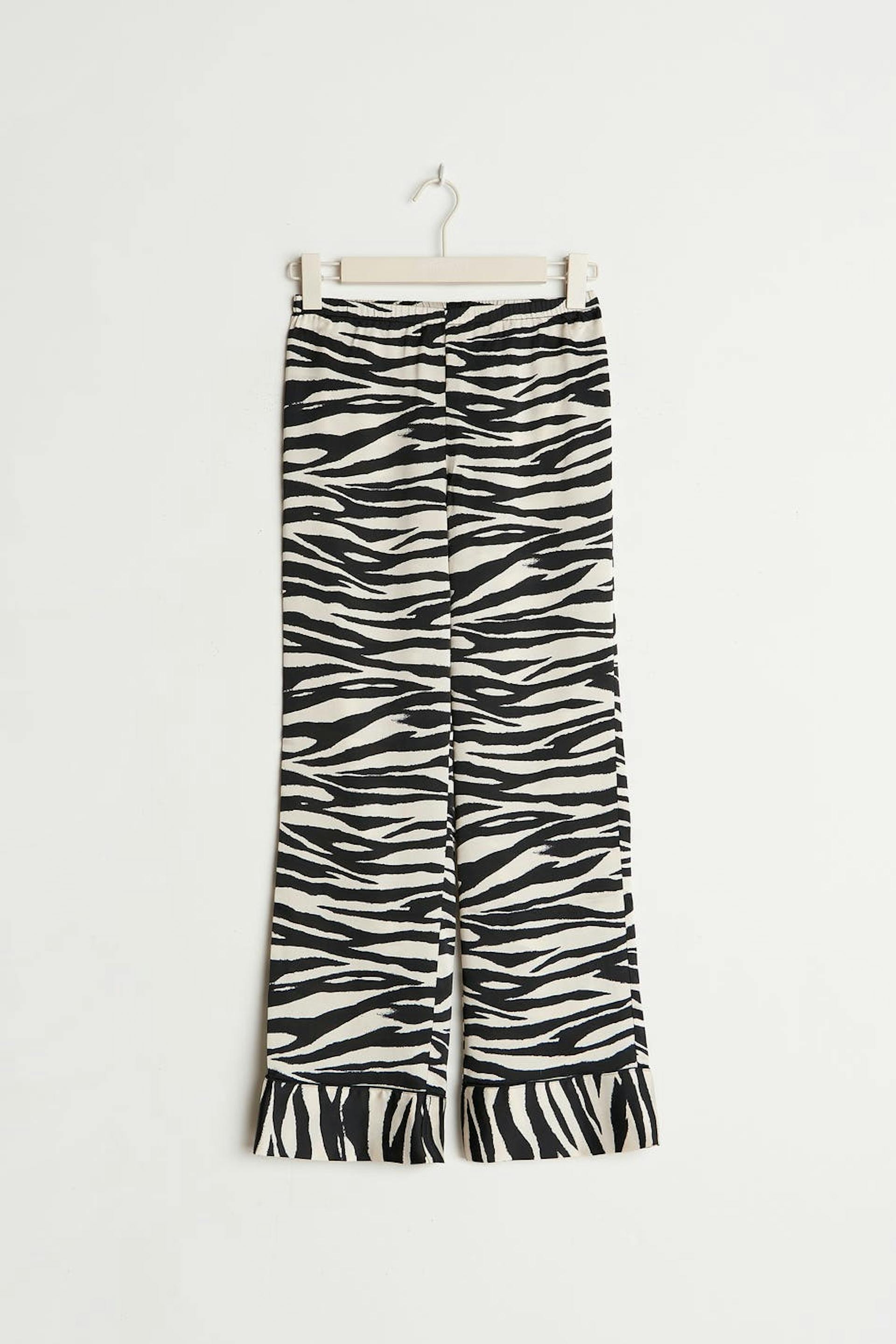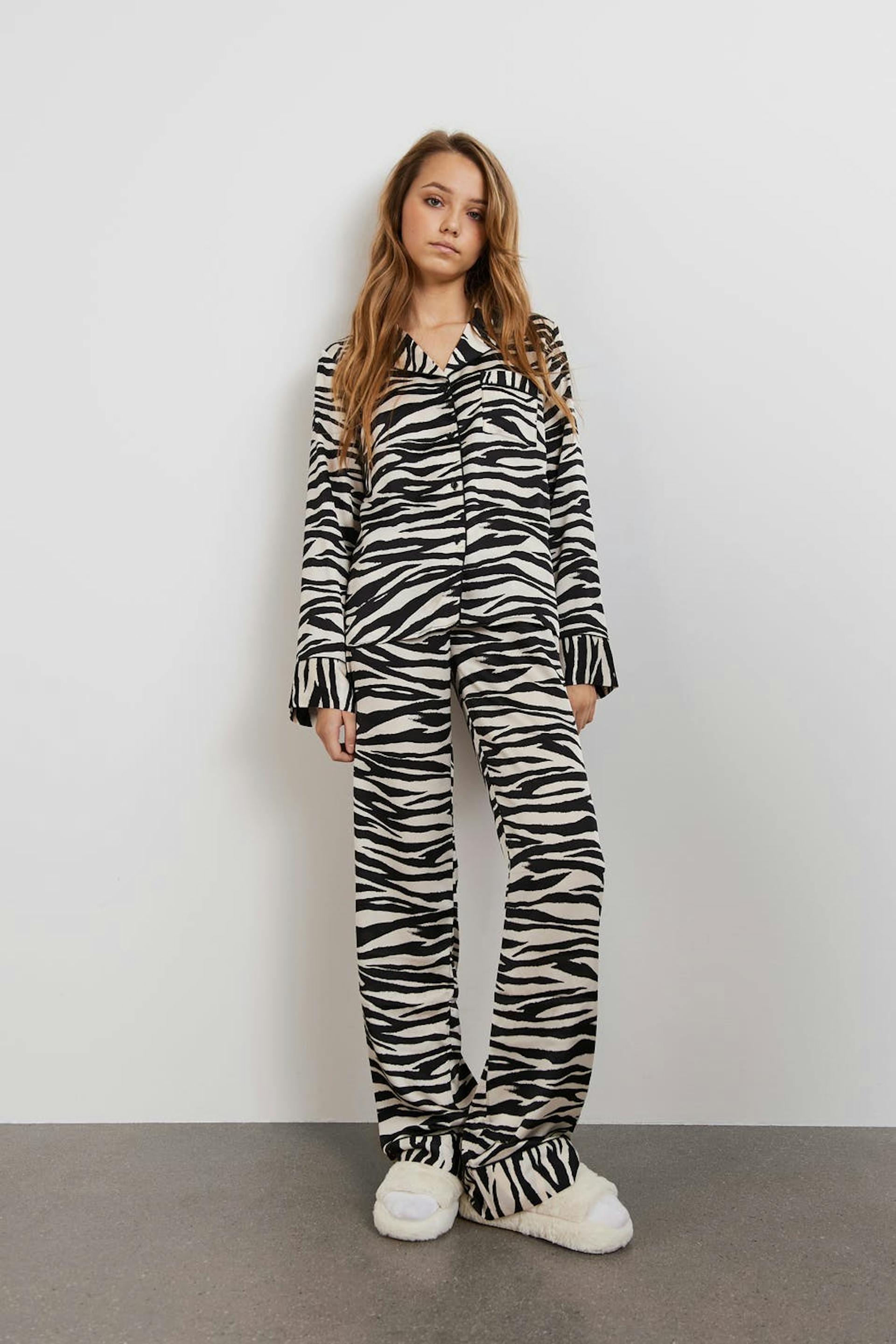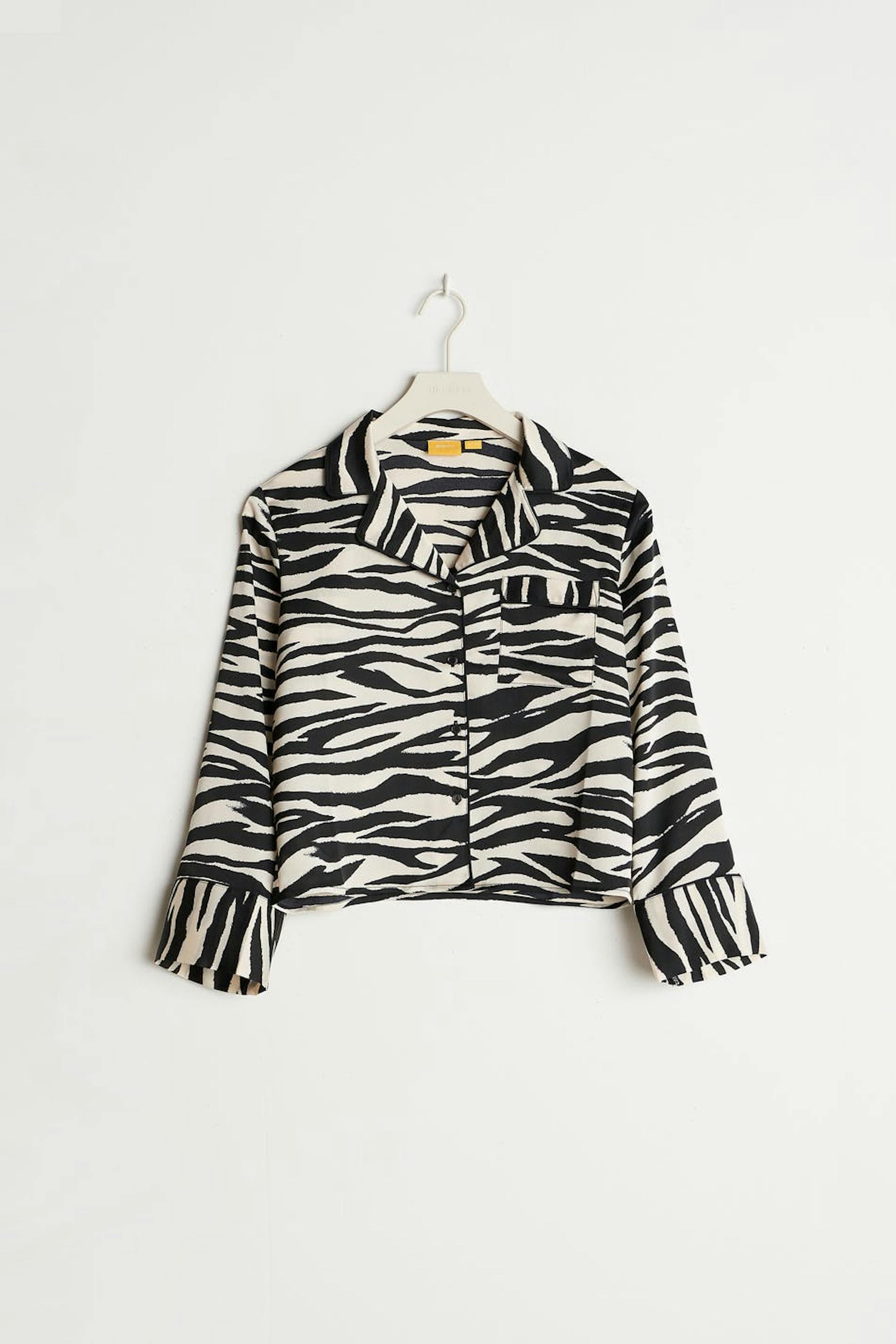 Seeprakuvioitu pyjamasetti Young Gina-tuotemerkiltä kudotulla laadulla satiinista. Pyjamasetti on musta ja siinä on paita kauluksella, rintataskulla ja nappikiinnityksellä edessä. Siinä on housut leveillä lahkeilla ja resorilla vyötäröllä.
