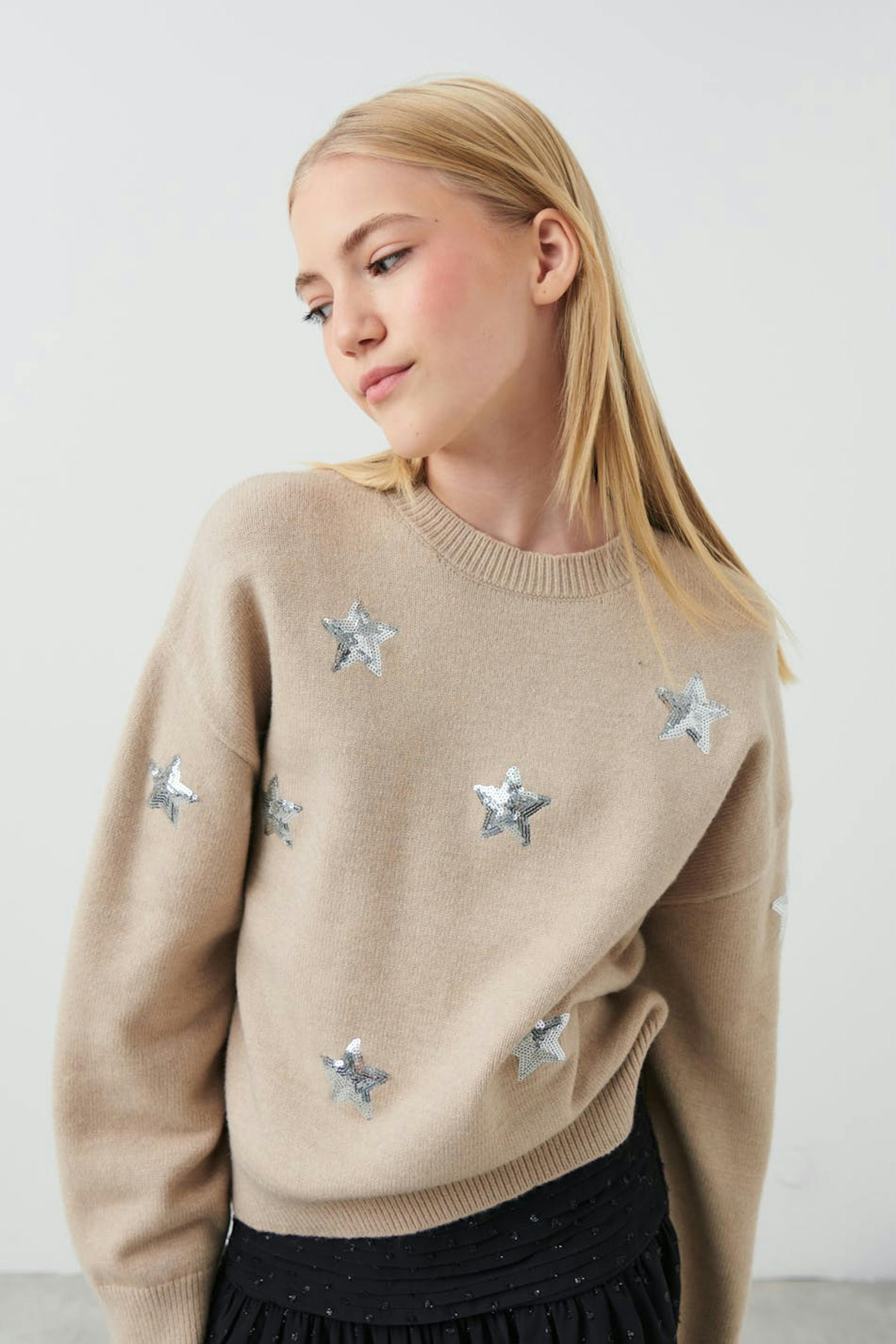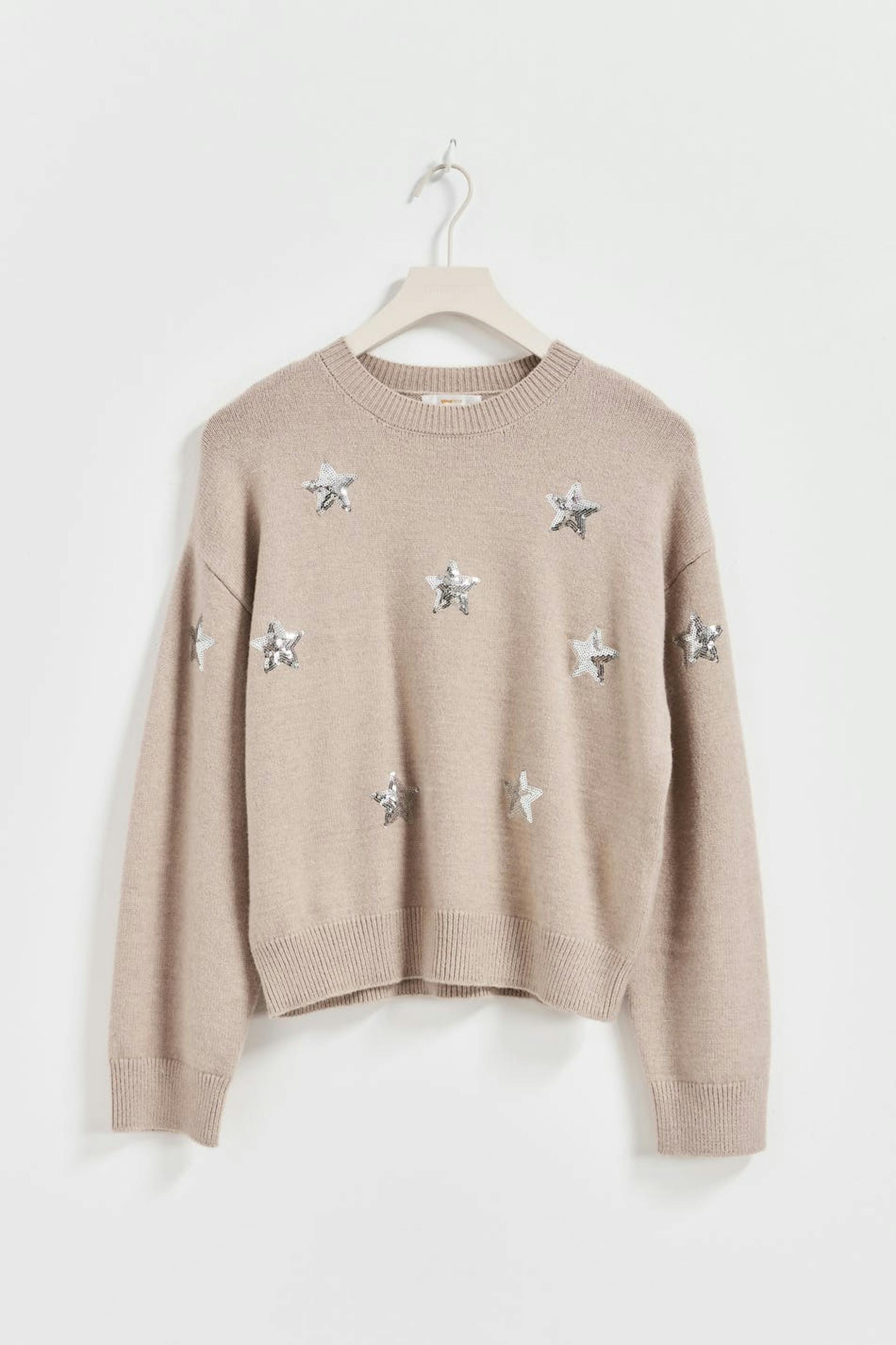Neulottu paita tähdillä. Paita on beige ja siinä on laatikkomainen malli. Siinä on leveä hiha, pyöreä pääntie ja ribbineulos hihansuissa ja pohjassa.