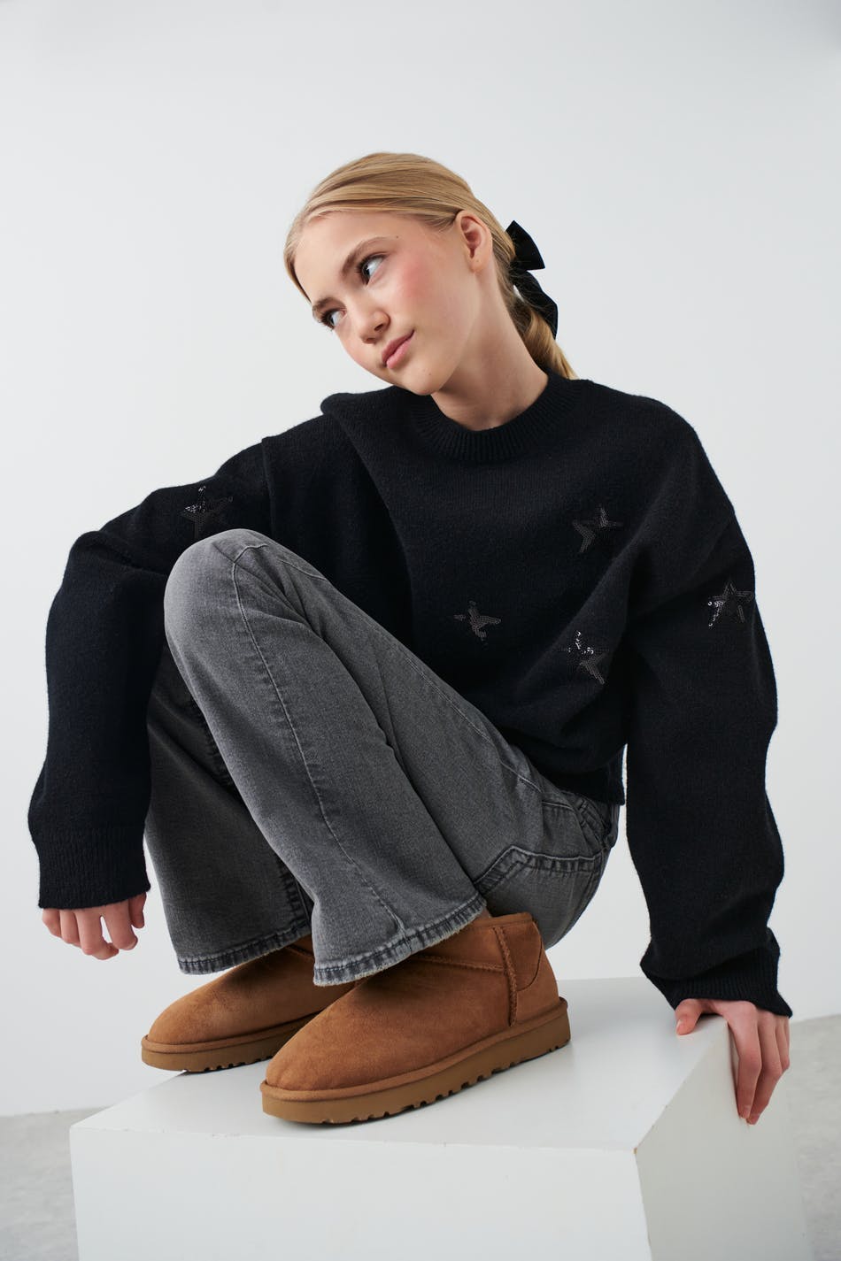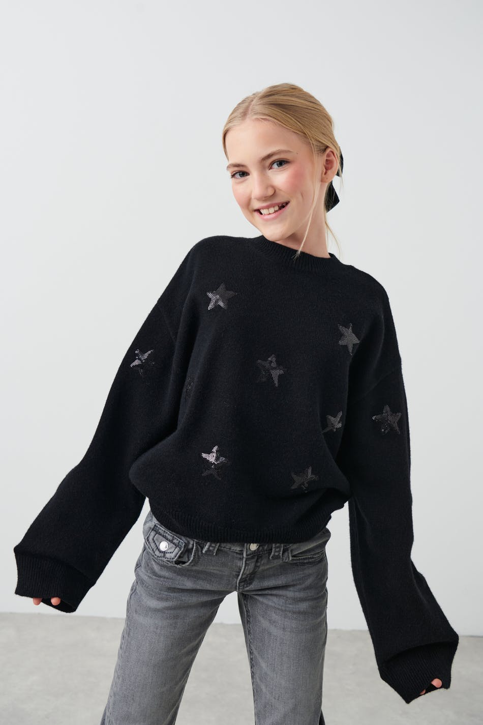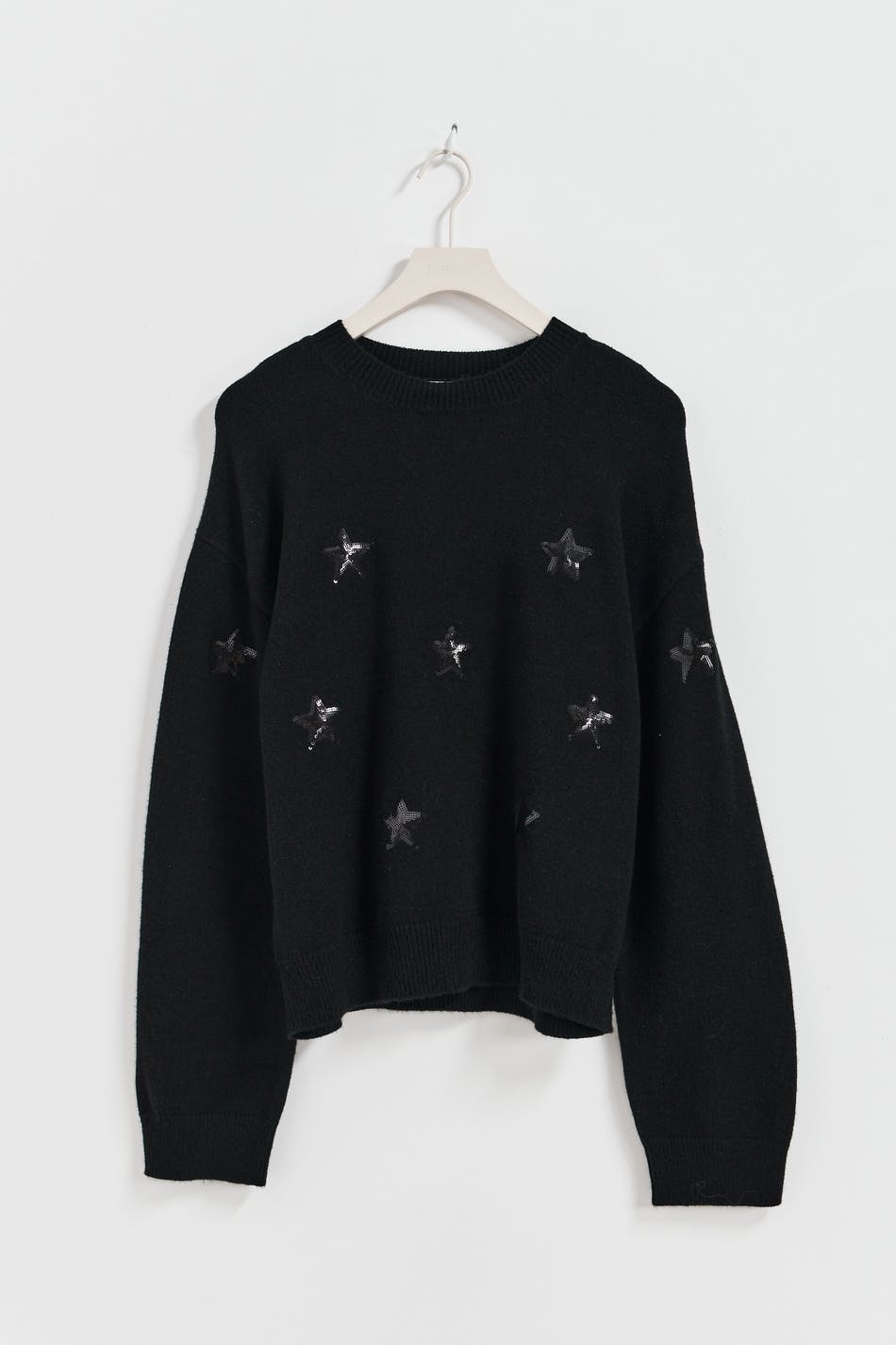 Neulottu paita tähdillä. Paita on musta ja siinä on laatikkomainen malli. Siinä on leveä hiha, pyöreä pääntie ja ribbineulos hihansuissa ja pohjassa.