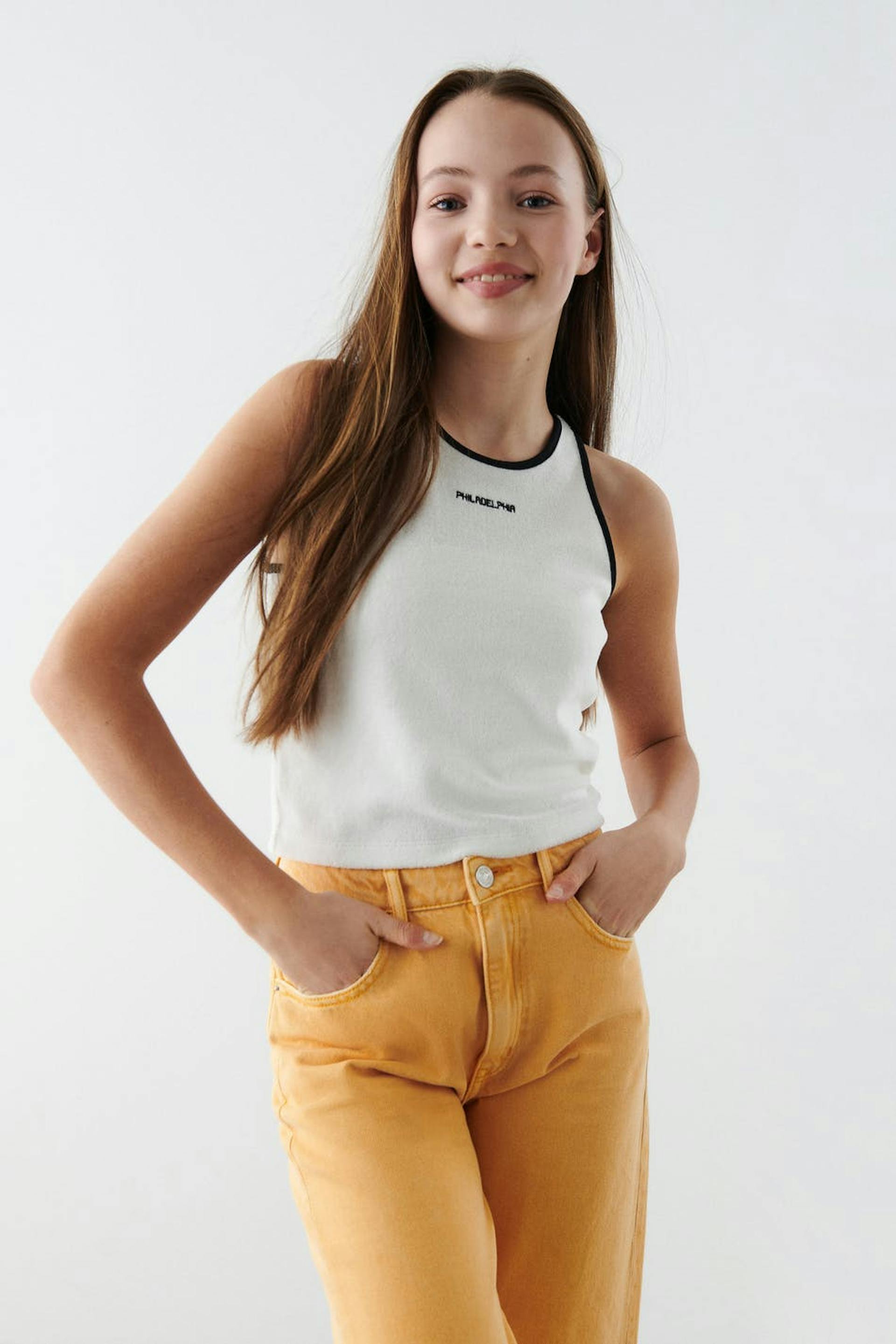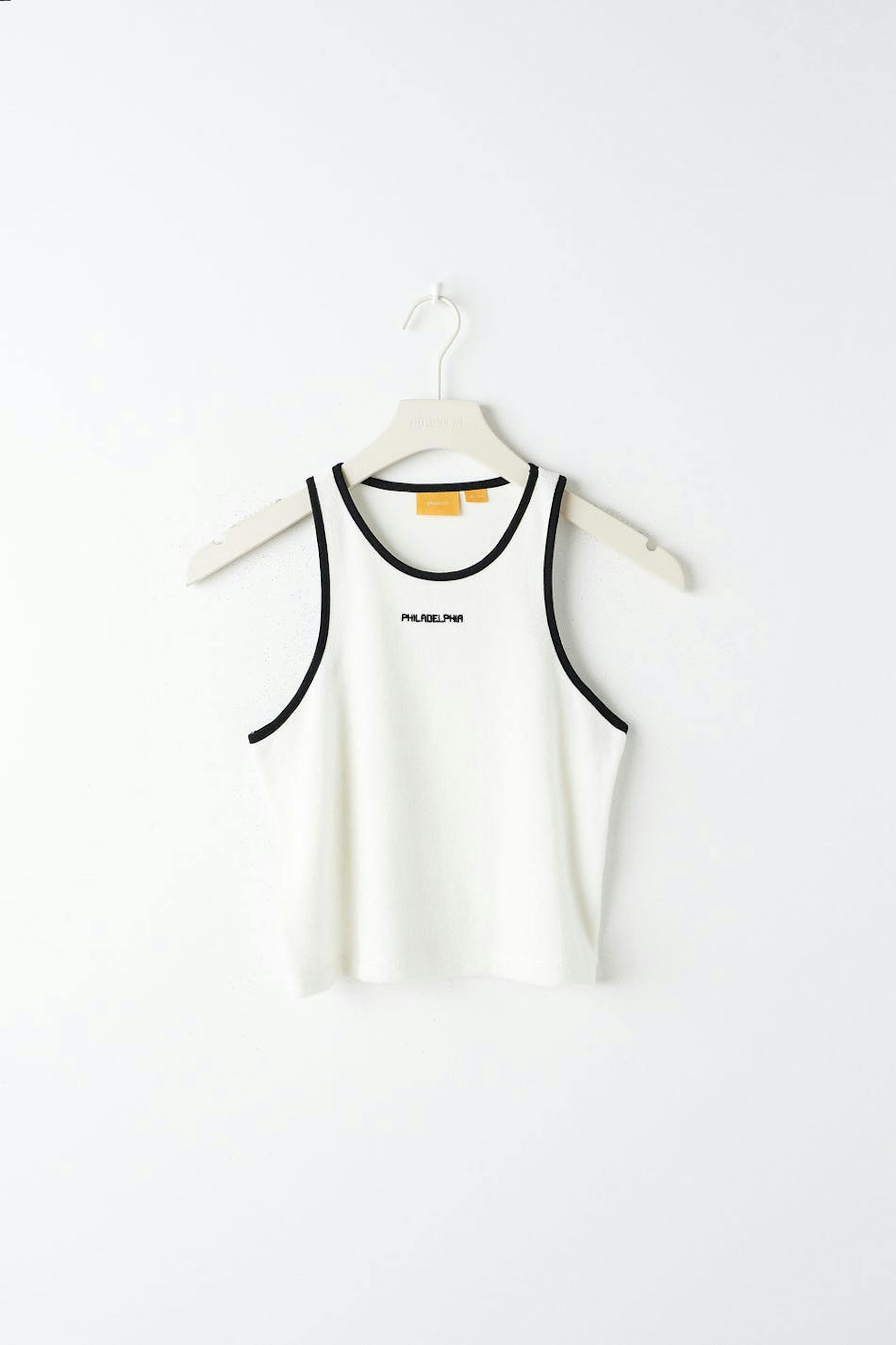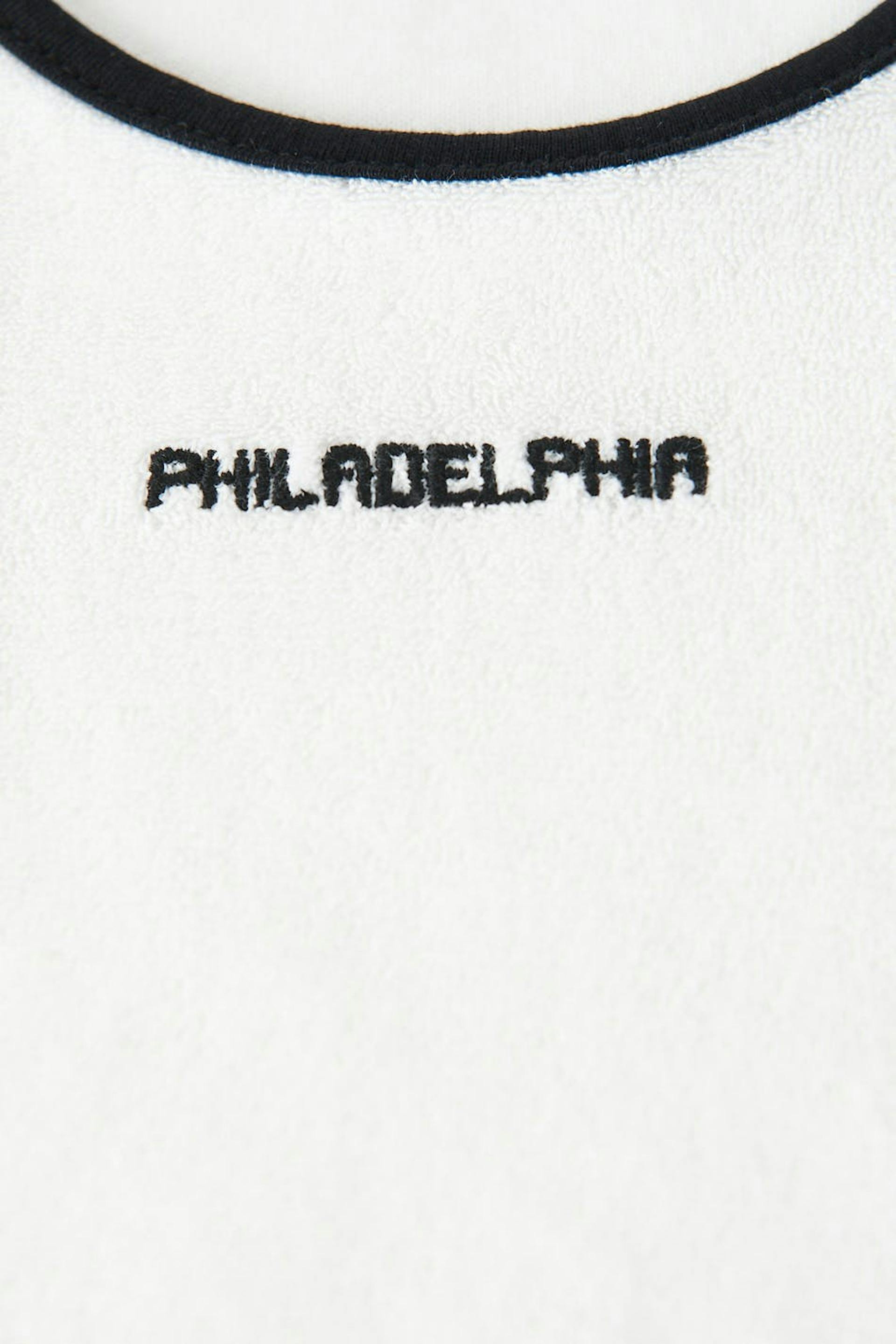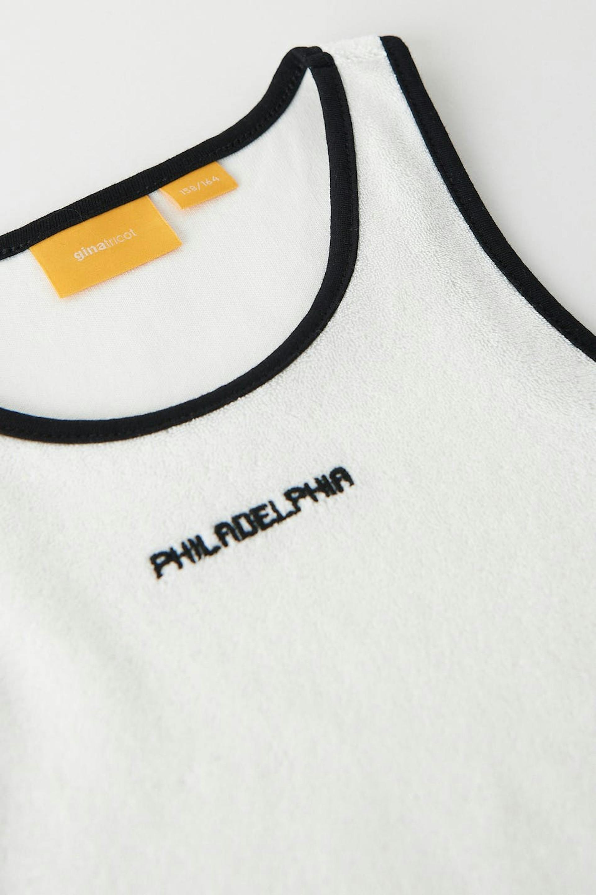 Cropattu toppi froteesta normaalilla istuvuudella. Toppi on valkoinen ja siinä on kontrastiompelet. Siinä on kirjailtu teksti edessä.