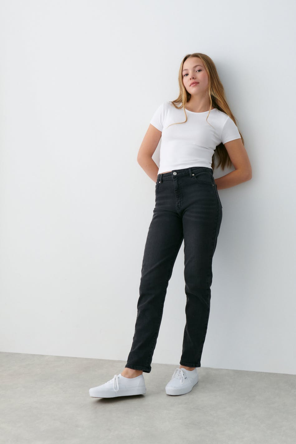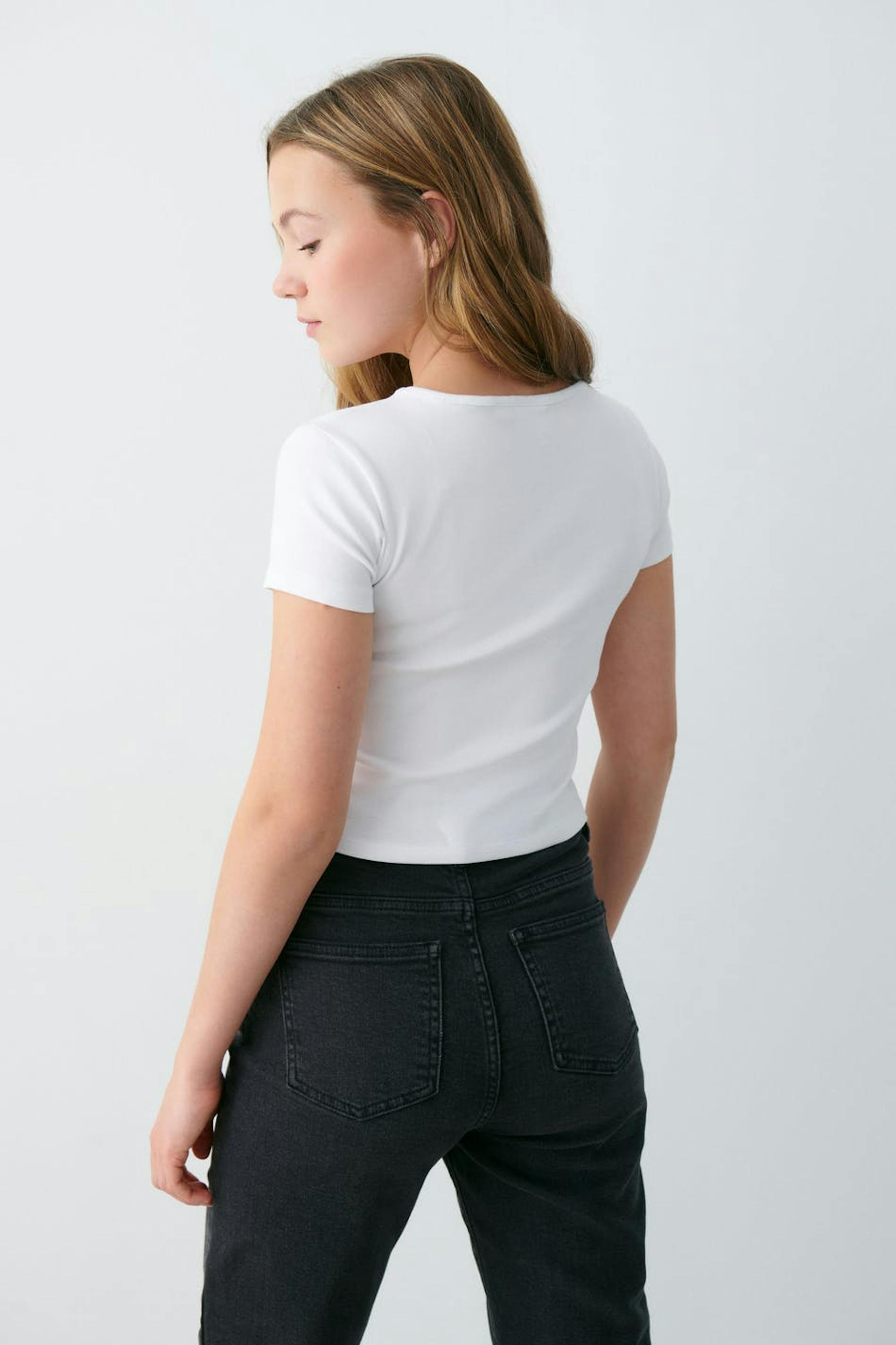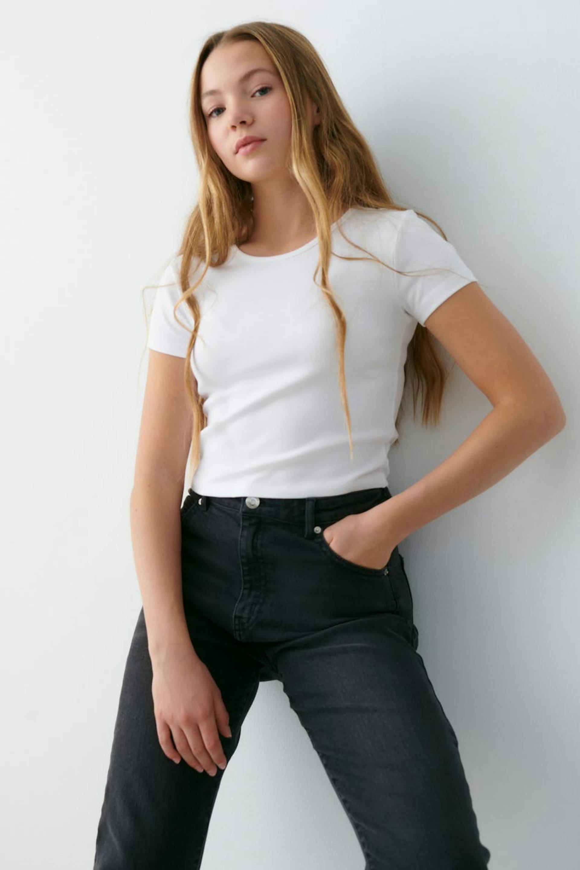 T-paita Gina Tricot Young-tuotemerkiltä pehmeästä trikoosta tyköistuvalla istuvuudella. T-paita on valkoinen ja siinä on pyöristetty kaula-aukko.