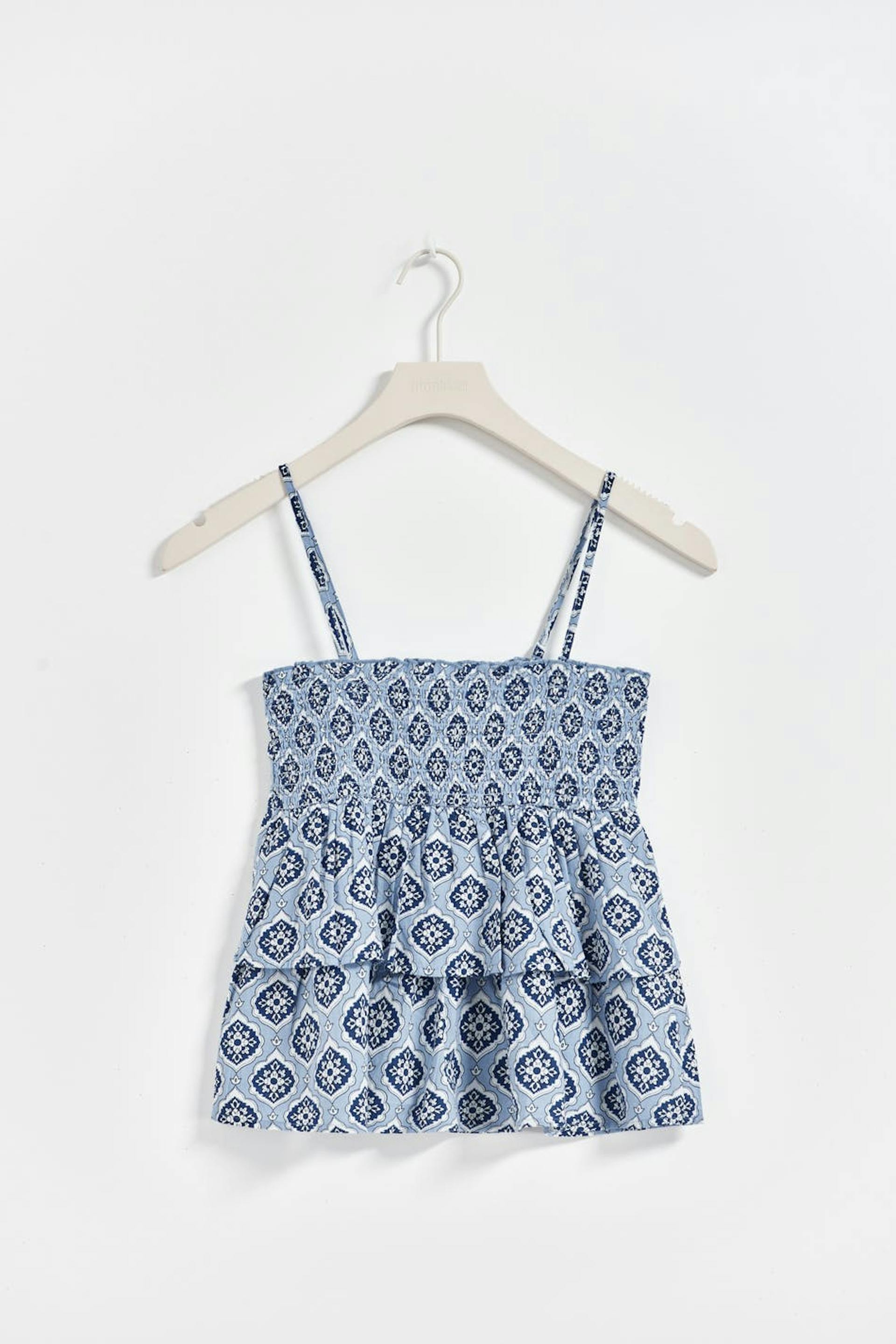 Kuvioitu aluspaita röyhelöillä. Aluspaita on sininen ja boheemi ja siinä on rypytys ylhäällä. Siinä on irrotettavat, säädettävät olkaimet.