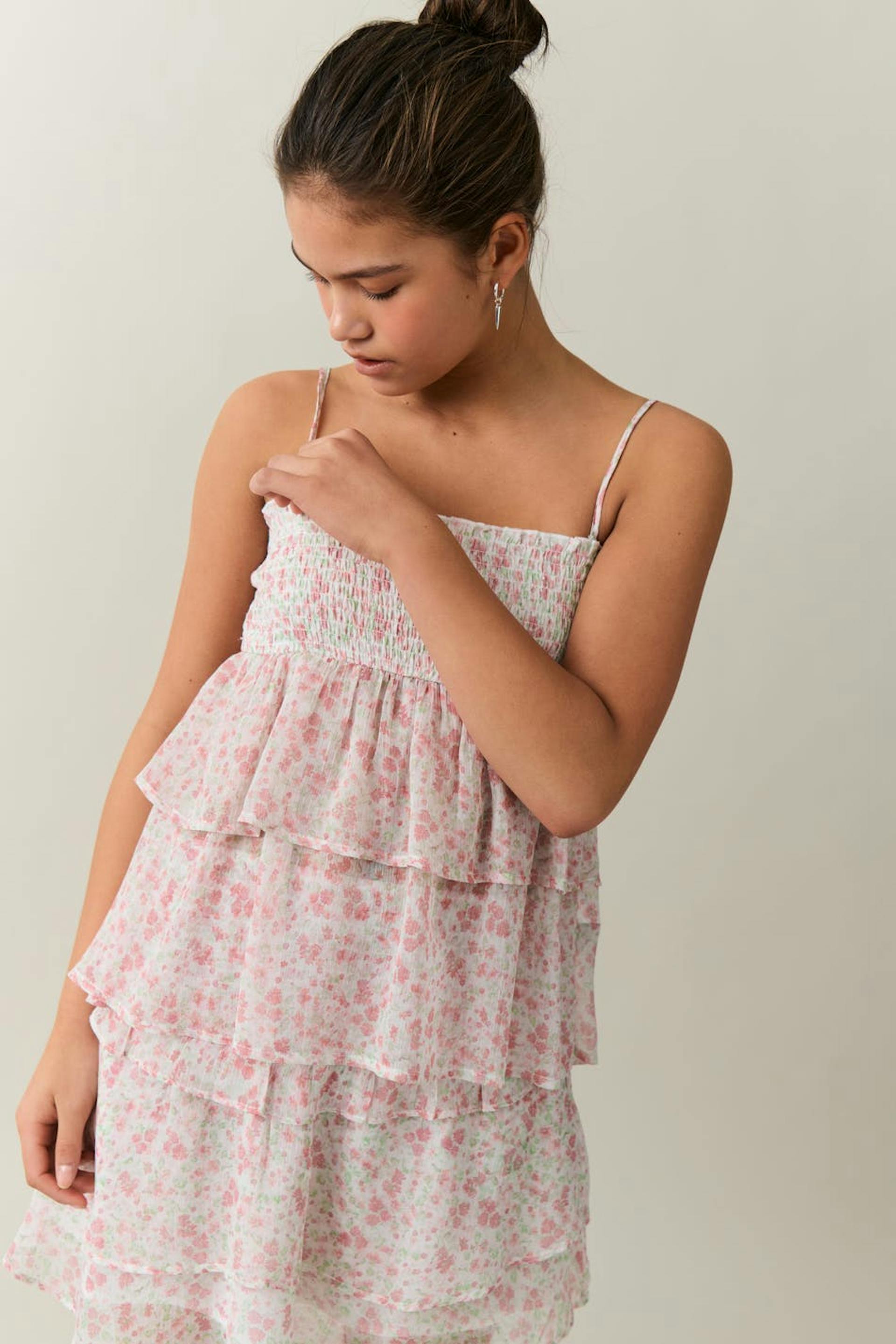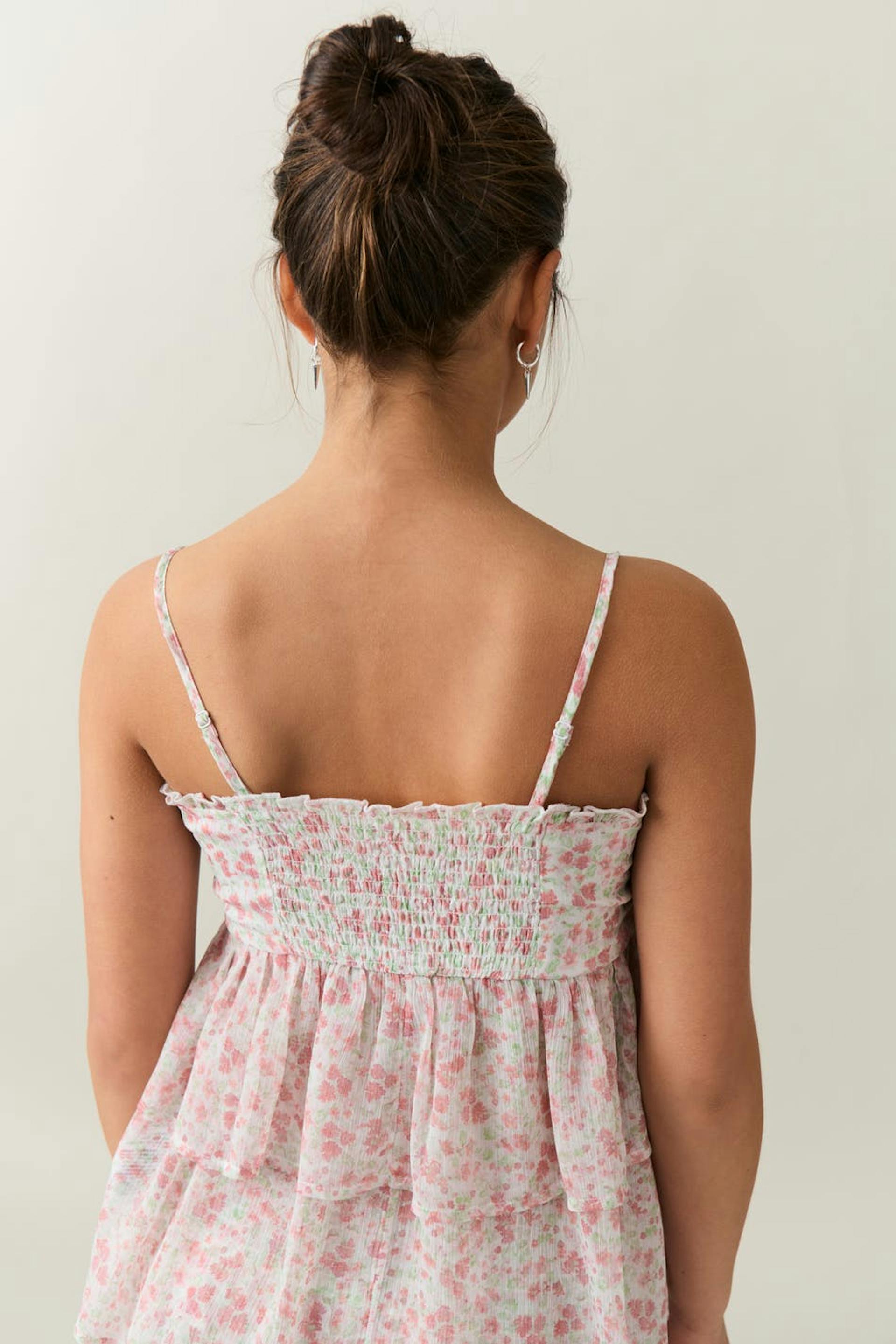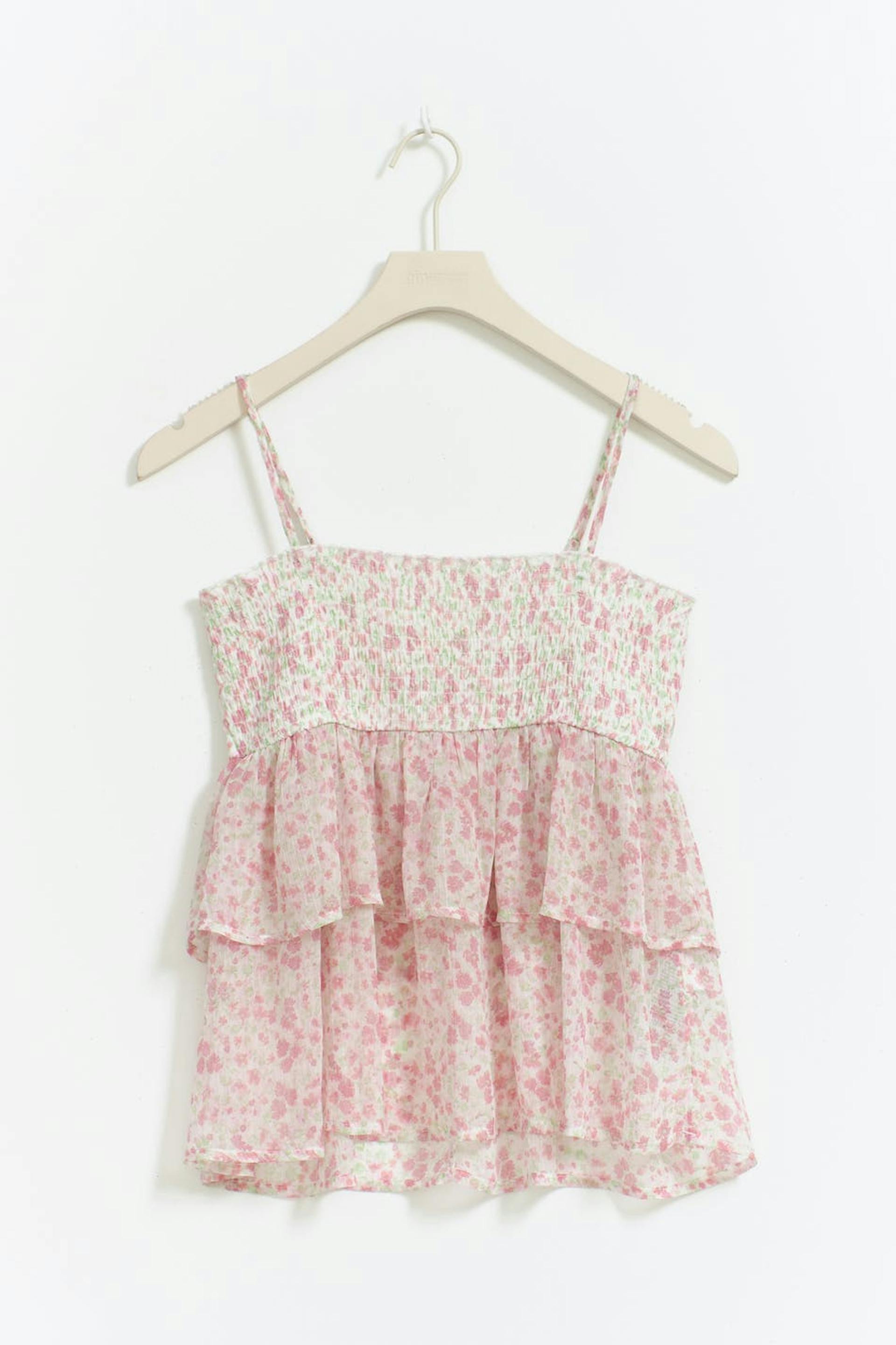 Kukallinen aluspaita röyhelöillä. Aluspaita on pinkki ja siinä on irrotettavat, säädettävät olkaimet. Siinä on rypytys ylhäällä ja pidempi takaosa.