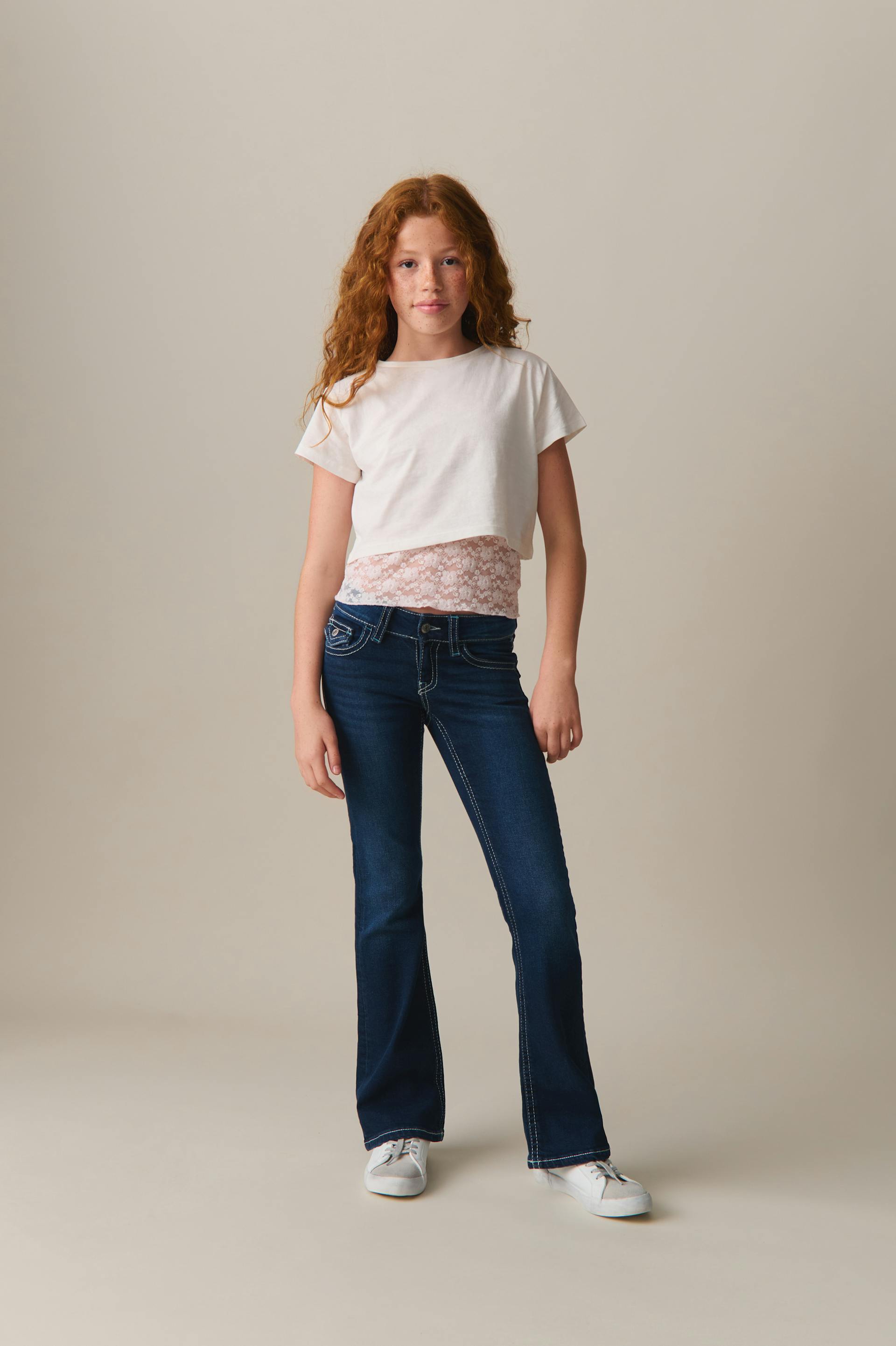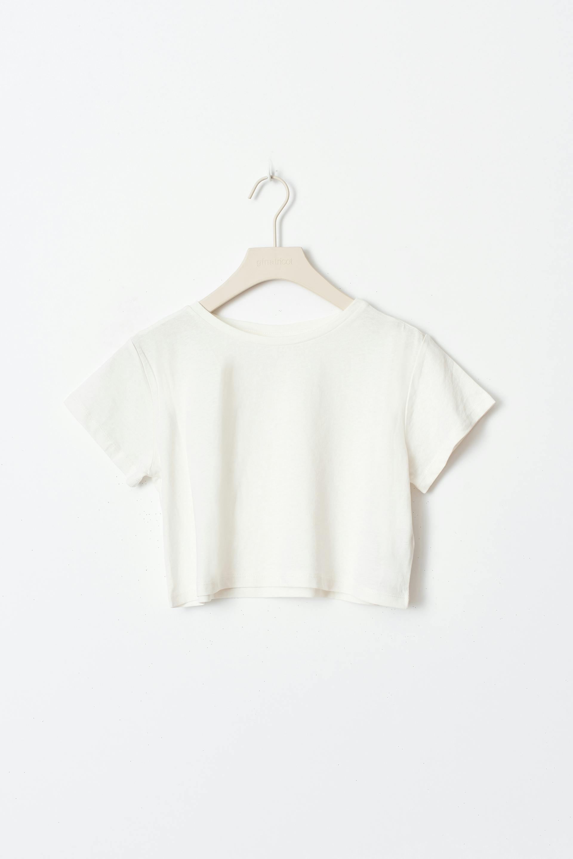 Cropattu T-paita trikoosta lyhyellä hihalla. T-paita on valkoinen ja siinä on pyöreä pääntie. Siinä on normaali istuvuus.