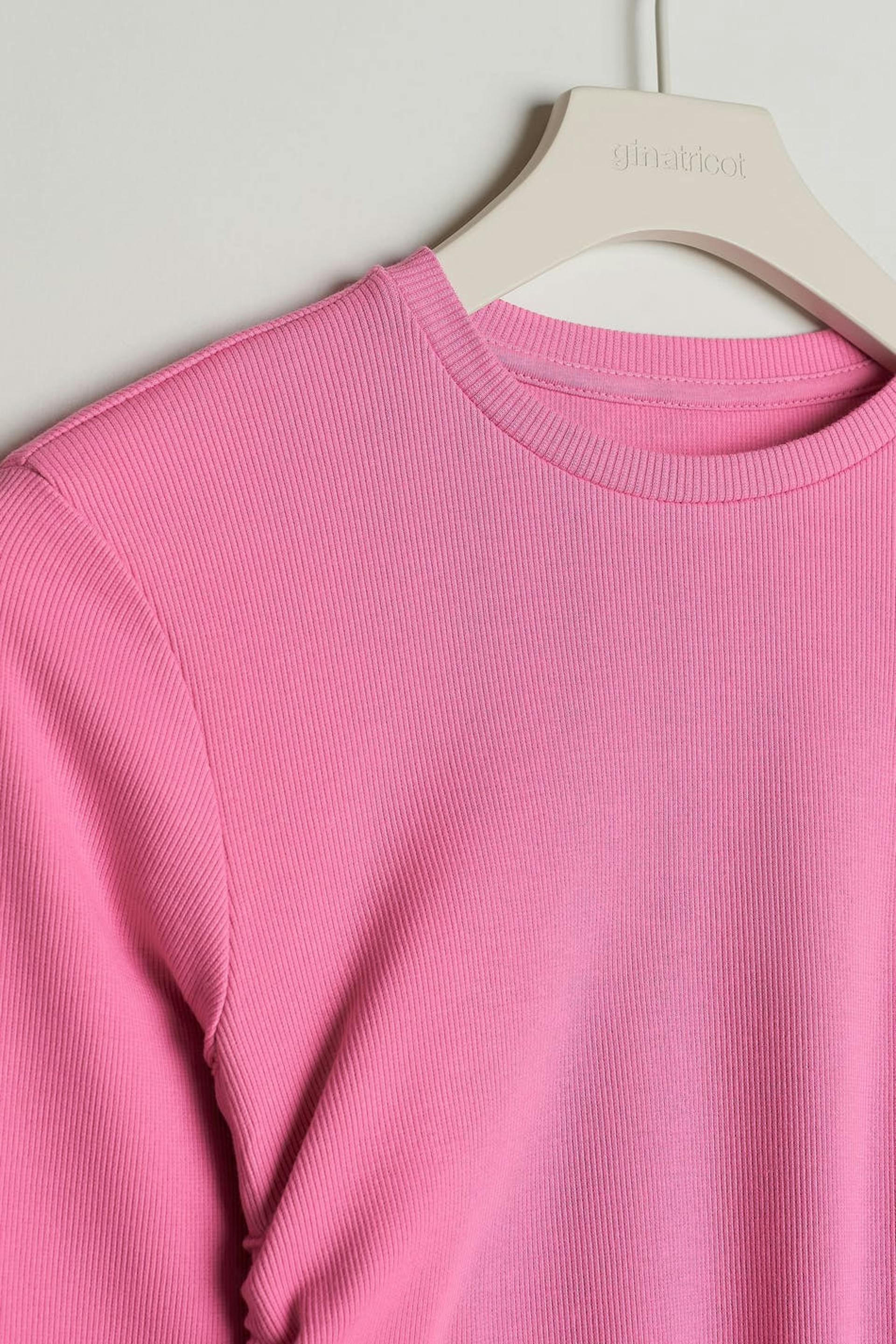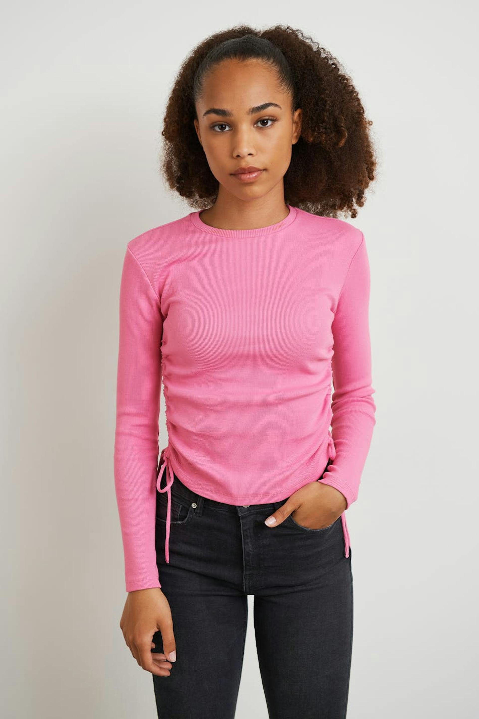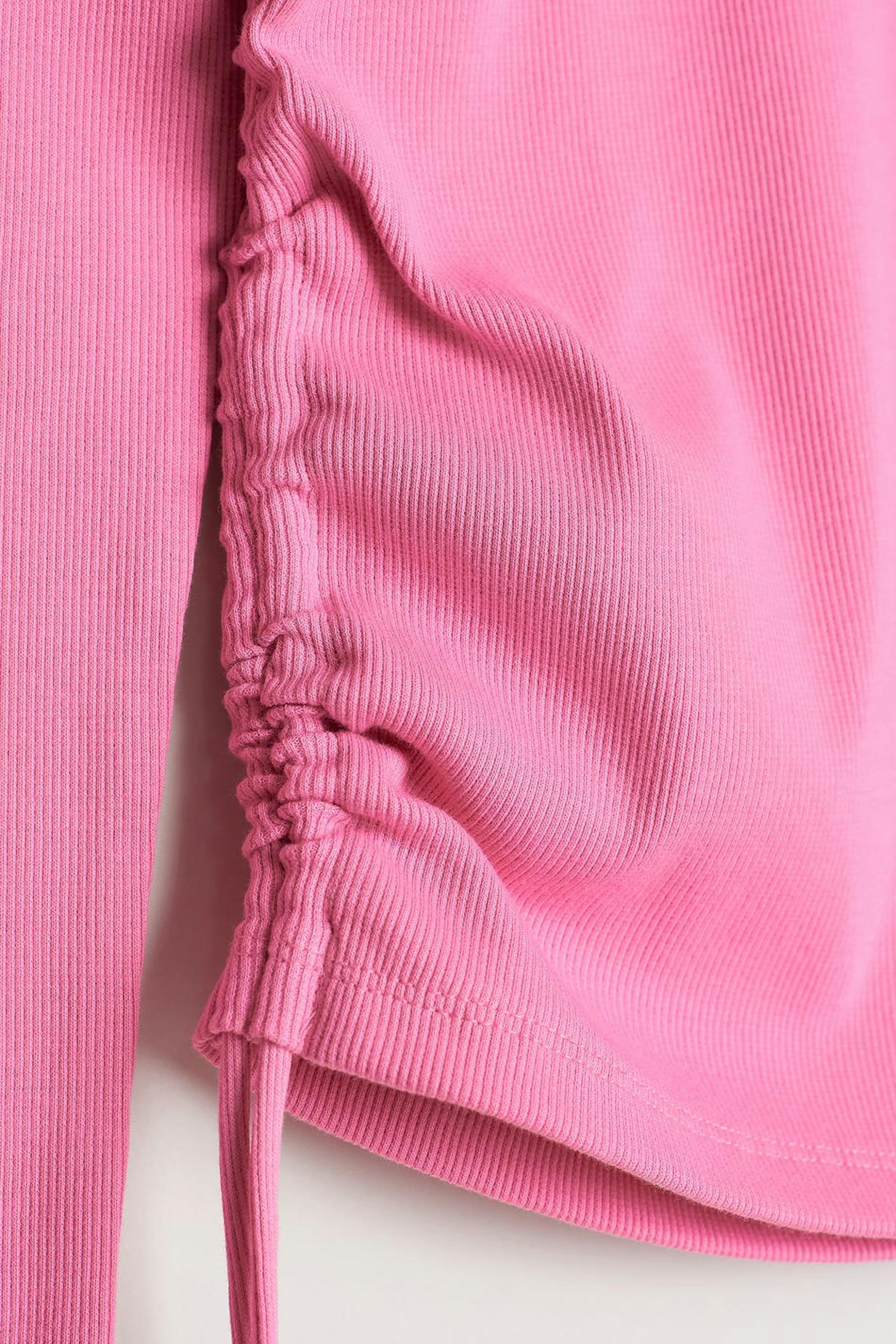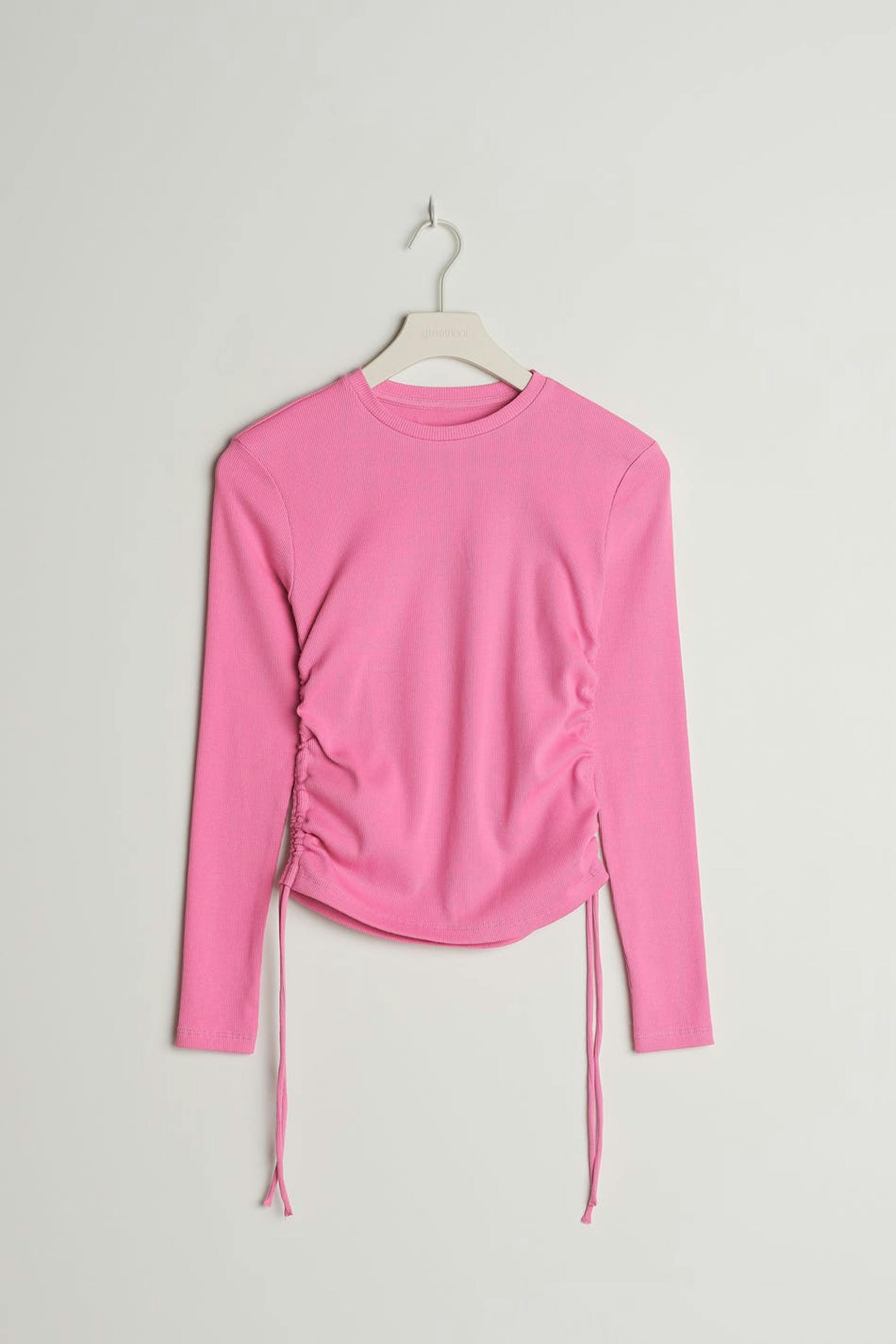 Pitkähihainen toppi Young Gina-tuotemerkiltä poimuilla sivuissa. Toppi on pinkki ja siinä on veneen muotoinen kaula-aukko. Siinä on kiristysnyörit sivuissa.