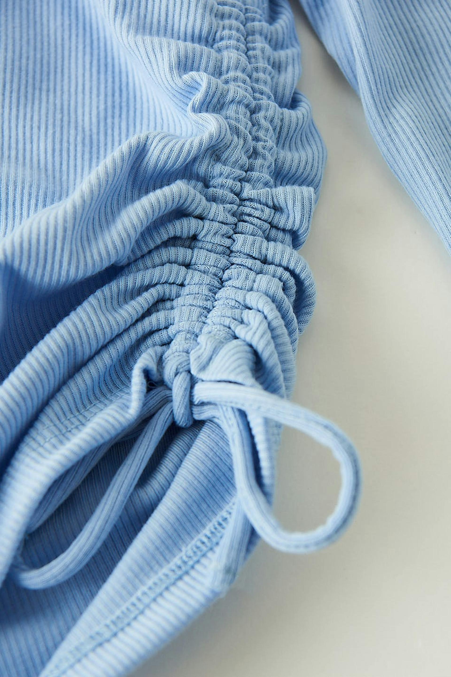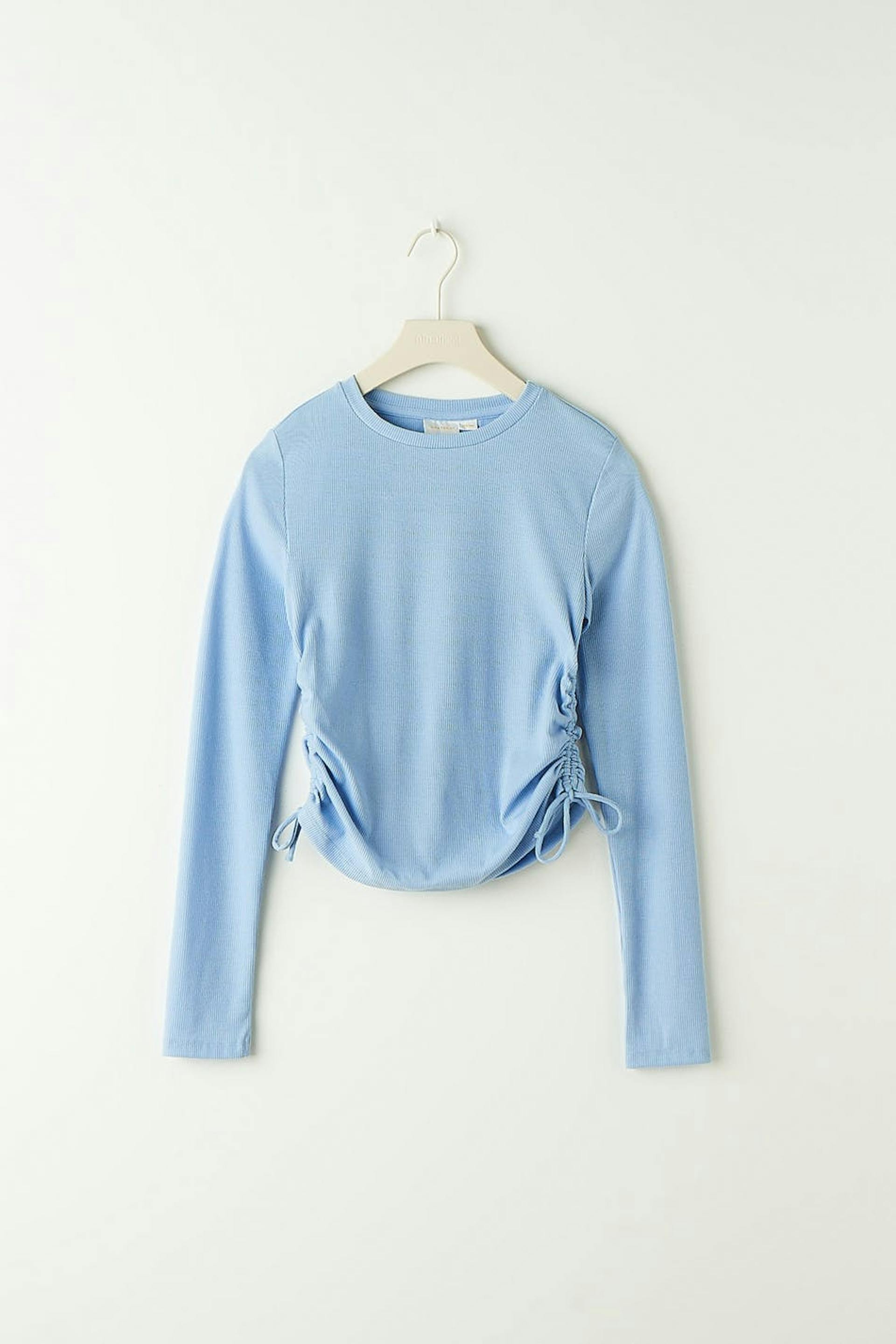 Pitkähihainen toppi poimuilla sivuissa. Toppi on sininen ja siinä on veneen muotoinen kaula-aukko. Siinä on kiristysnyörit sivuissa.