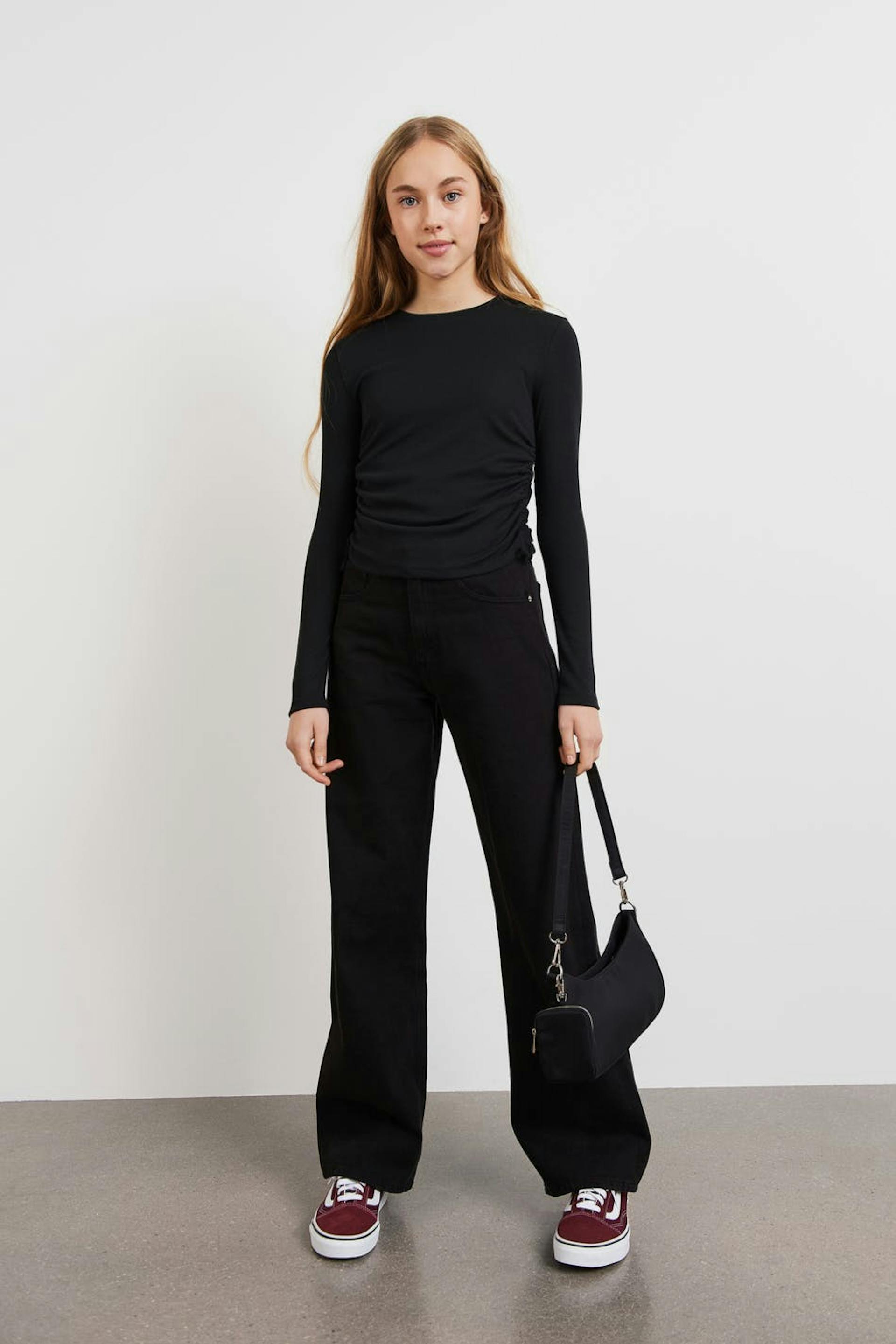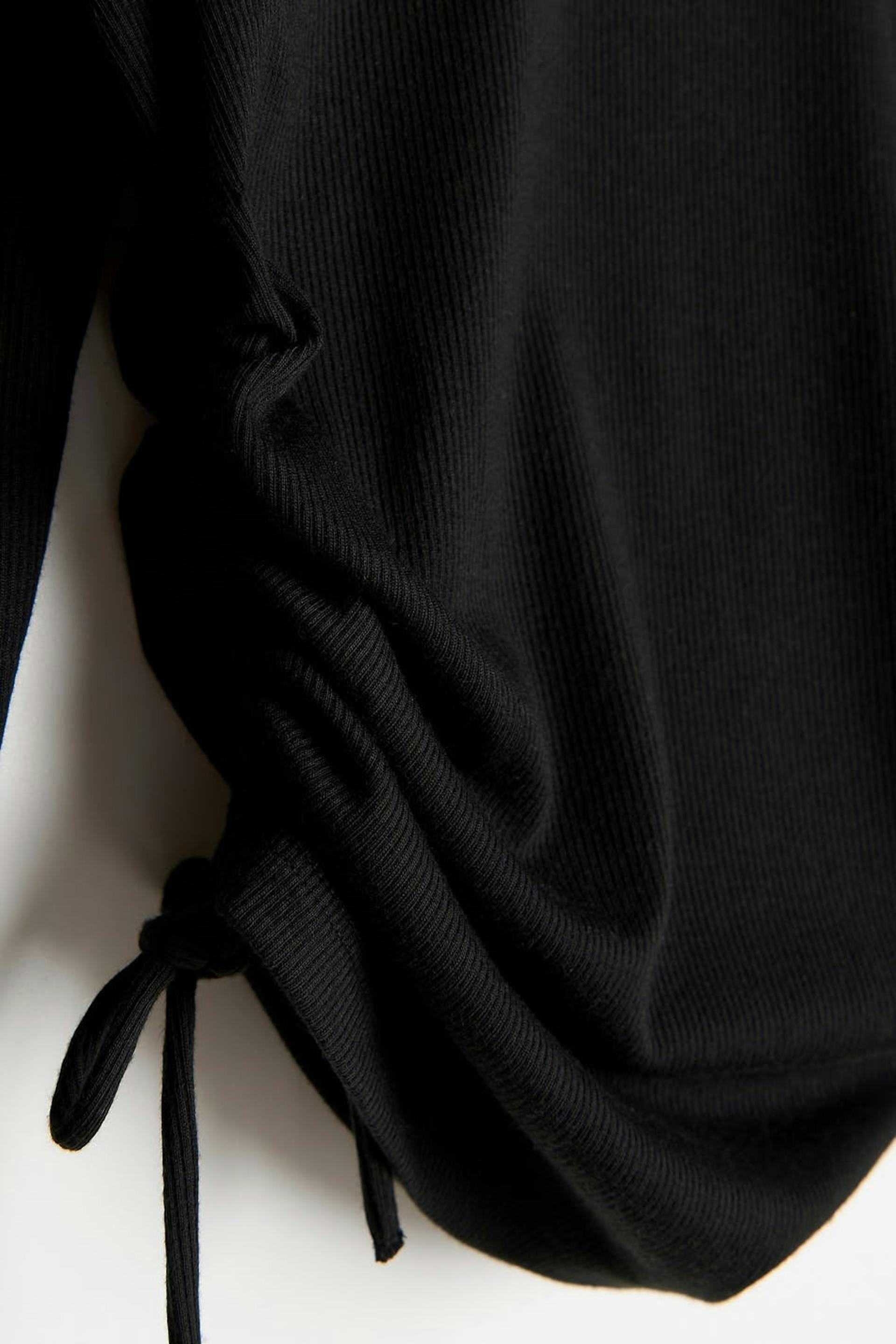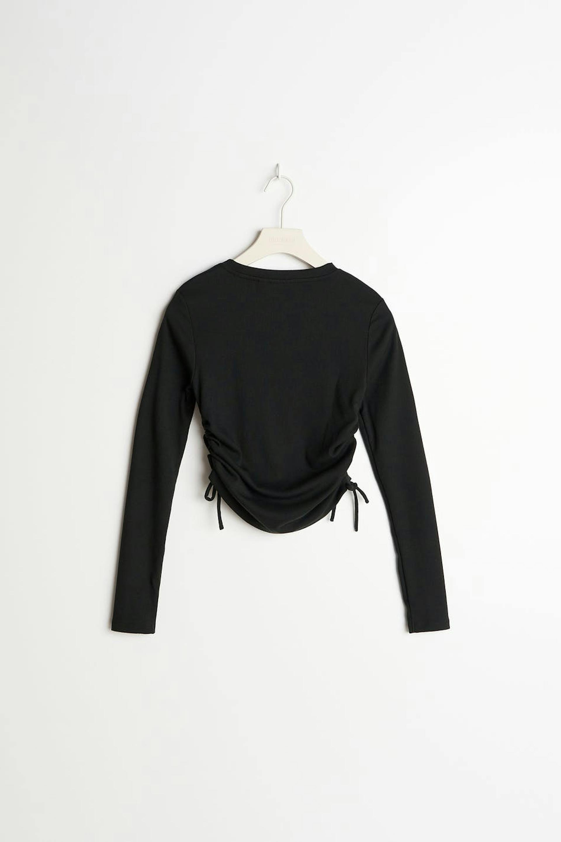 Pitkähihainen toppi Young Gina-tuotemerkiltä poimuilla sivuissa. Toppi on musta ja siinä on veneen muotoinen kaula-aukko. Siinä on kiristysnyörit sivuissa.