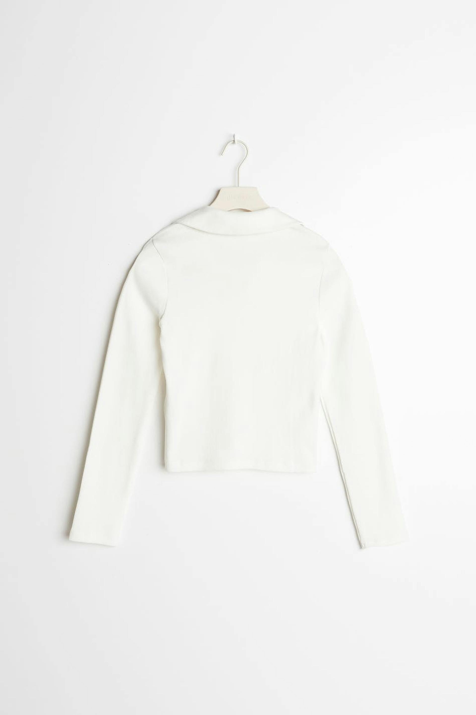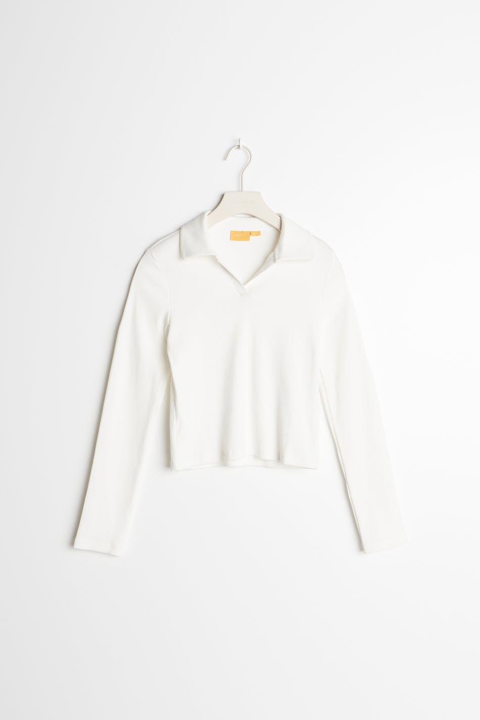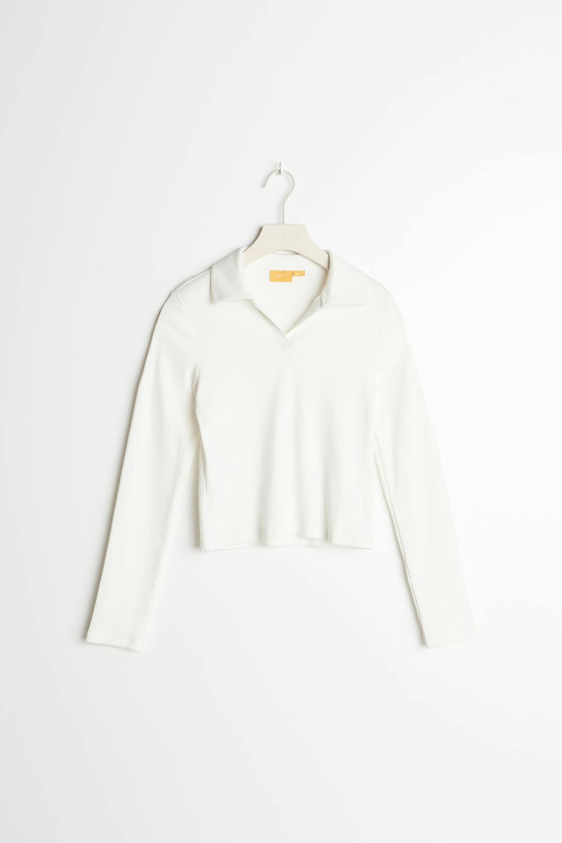 Pitkähihainen trikootoppi Young Gina-tuotemerkiltä V-aukolla. Trikootoppi on valkoinen ja siinä on ribattu laatu. Siinä on kaulus ja vartalonmyötäinen istuvuus.