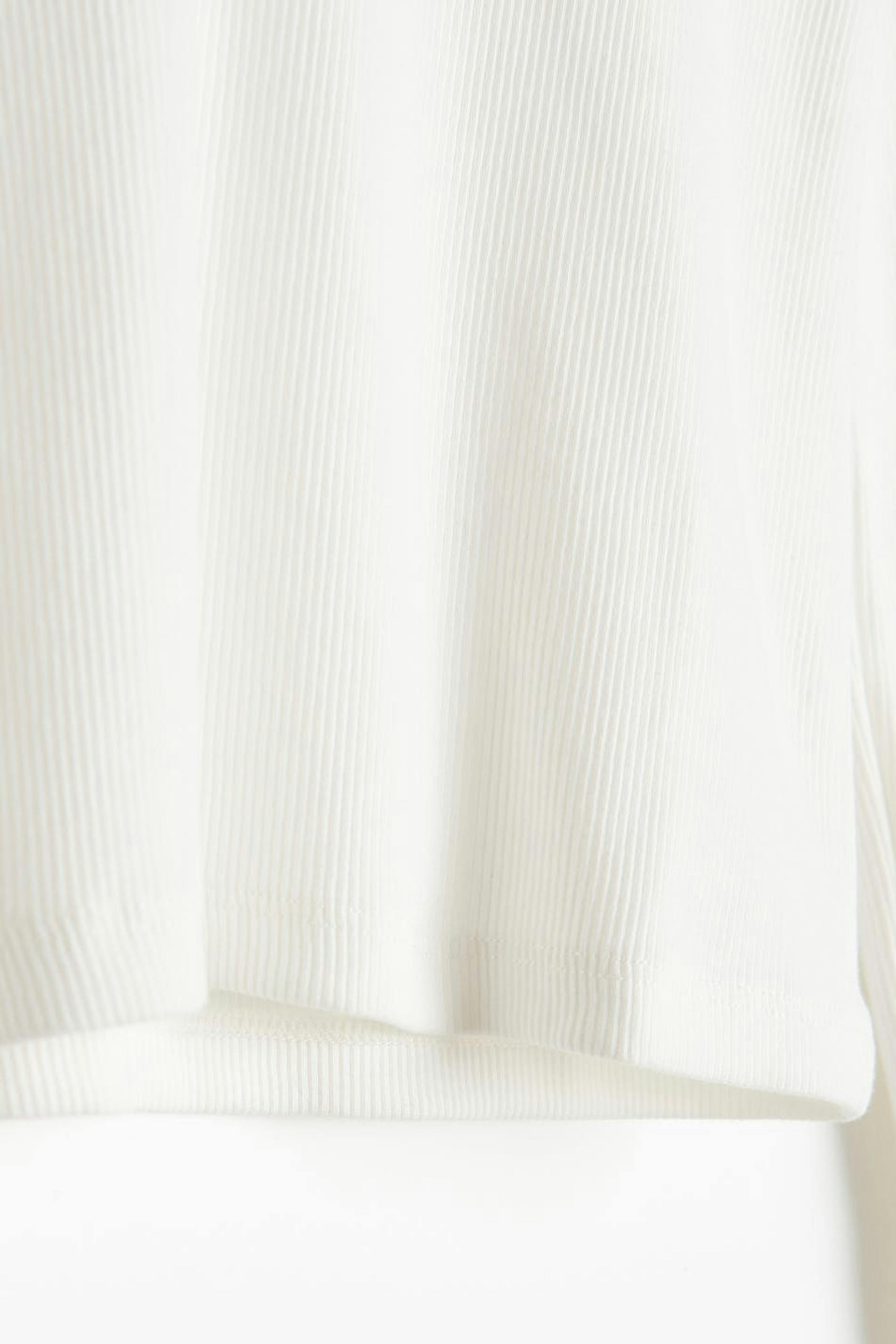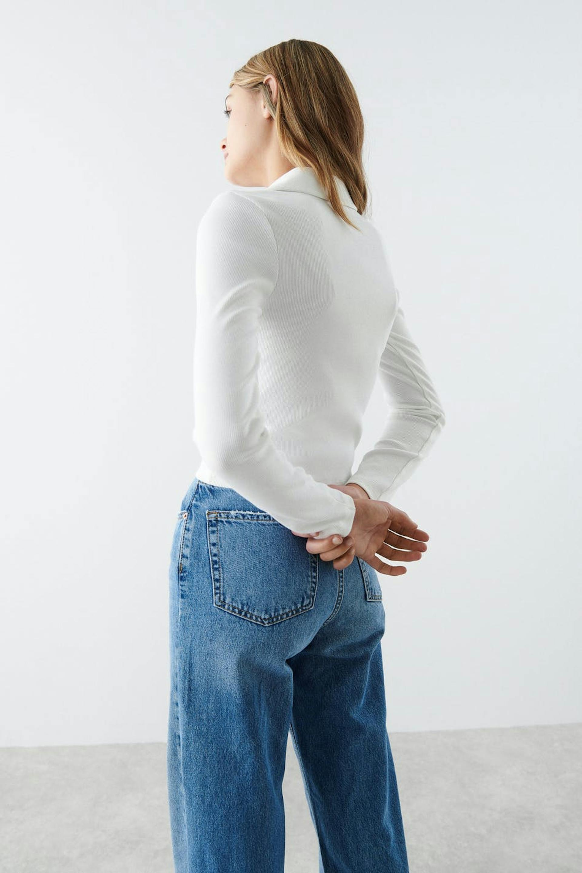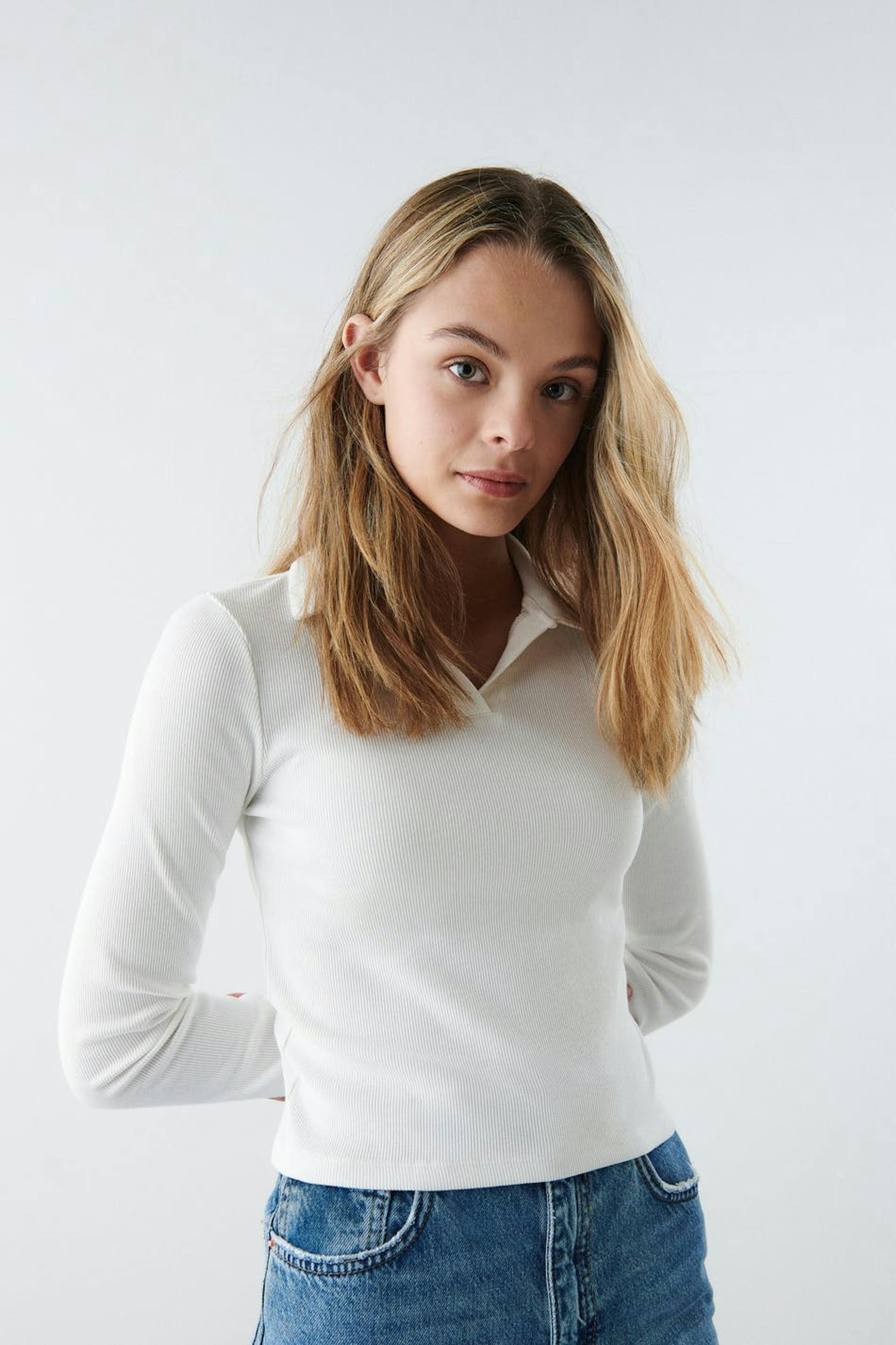 Pitkähihainen trikootoppi Young Gina-tuotemerkiltä V-aukolla. Trikootoppi on valkoinen ja siinä on ribattu laatu. Siinä on kaulus ja vartalonmyötäinen istuvuus.