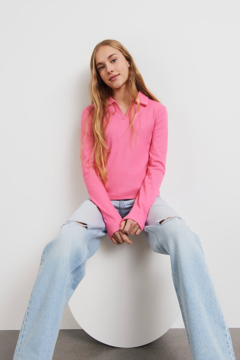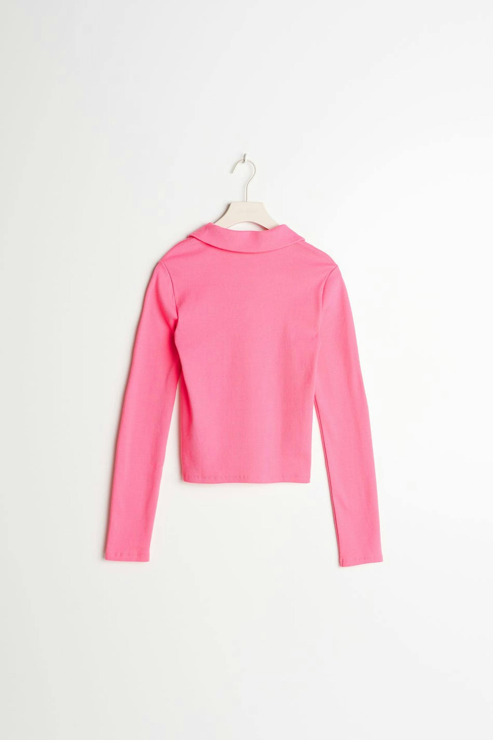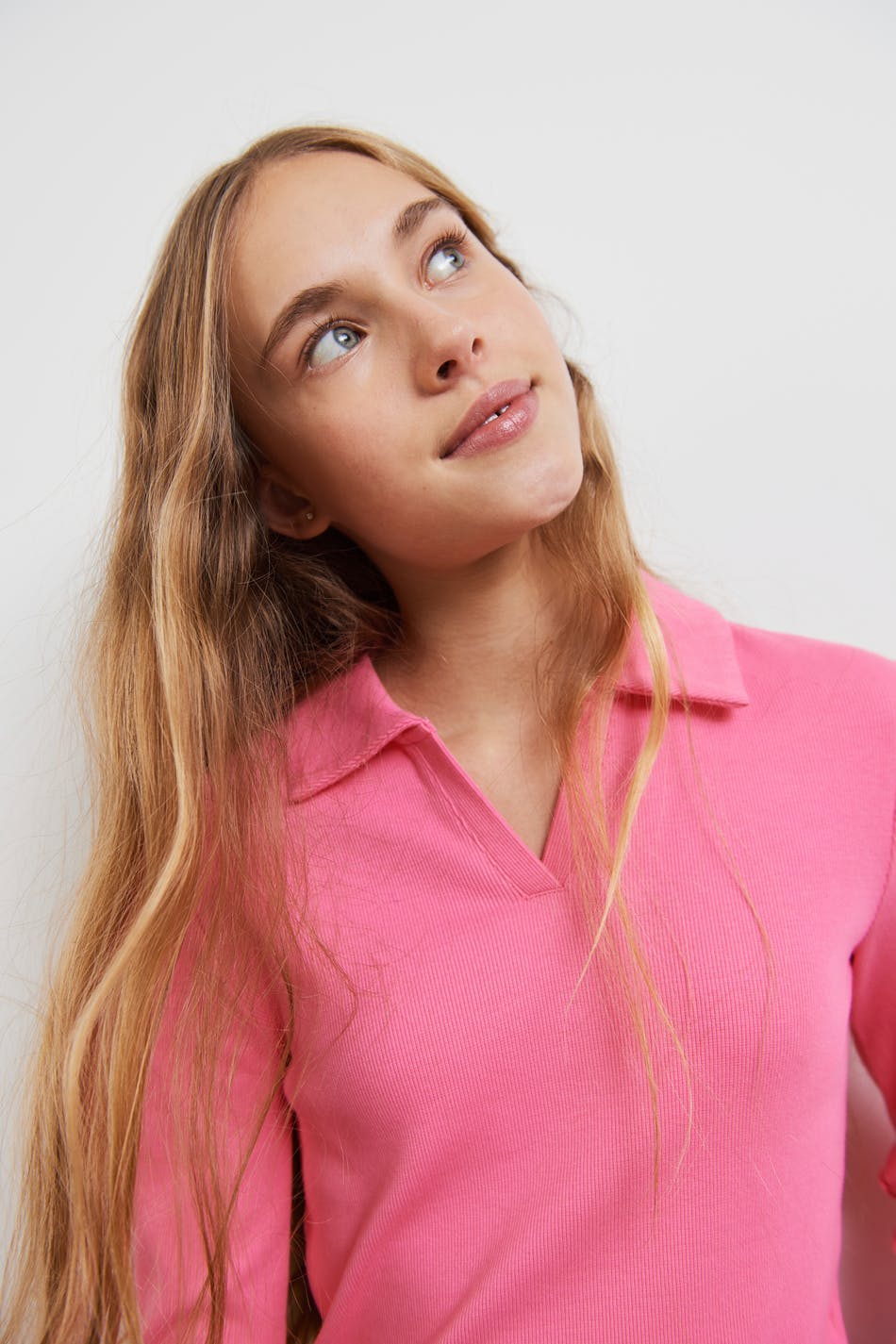 Pitkähihainen trikootoppi Young Gina-tuotemerkiltä V-aukolla. Trikootoppi on pinkki ja siinä on ribattu laatu. Siinä on kaulus ja vartalonmyötäinen istuvuus.