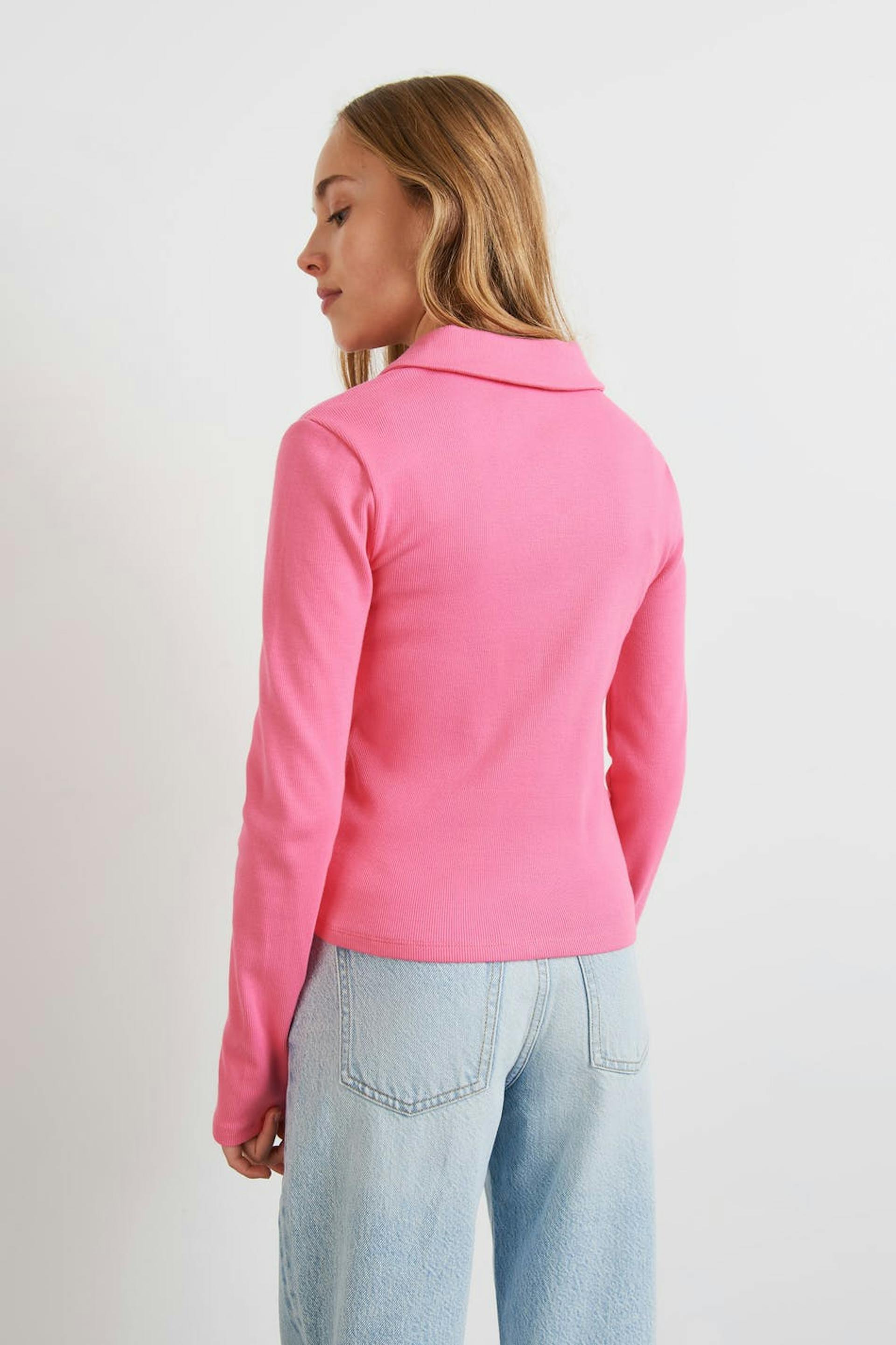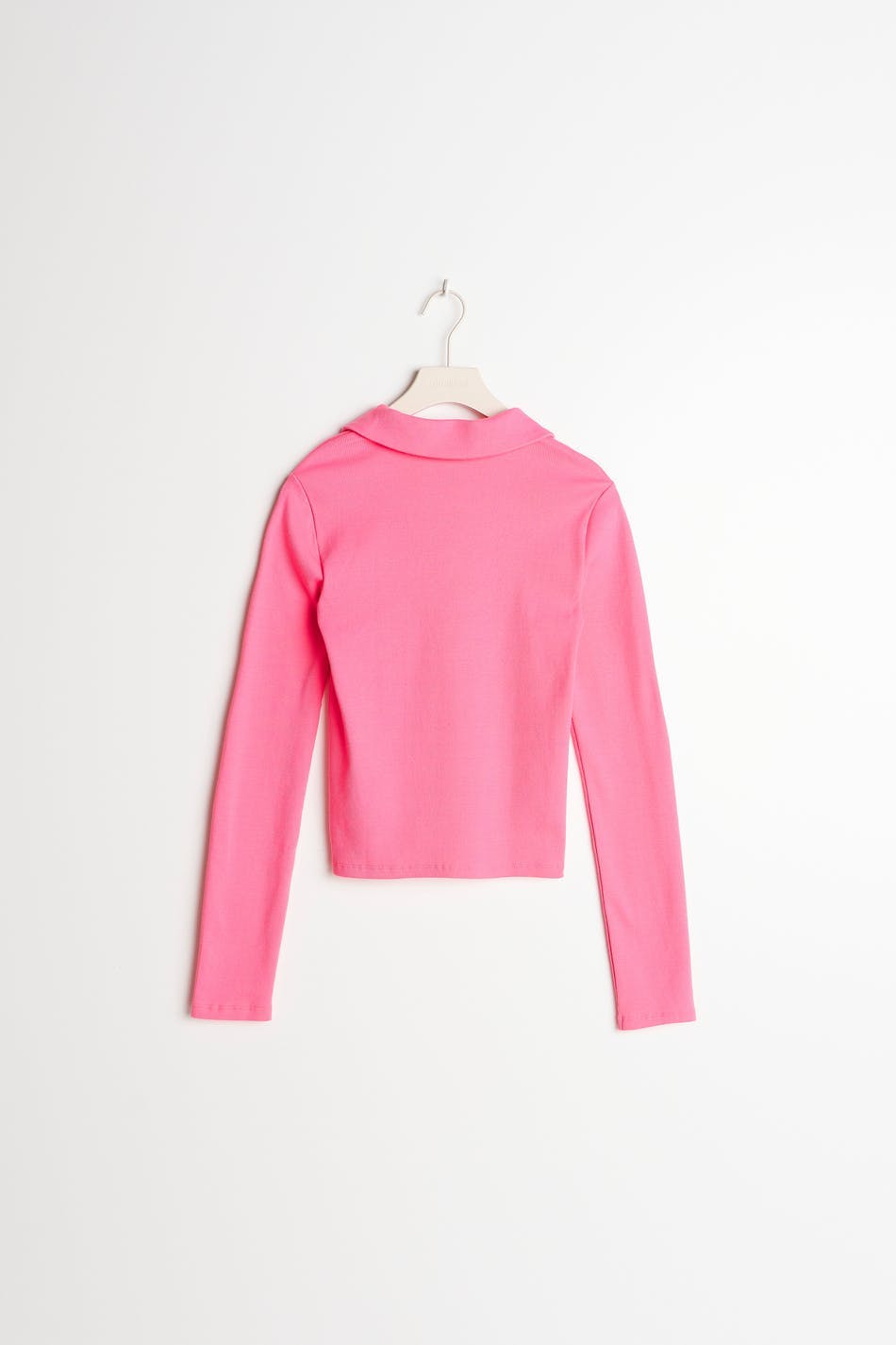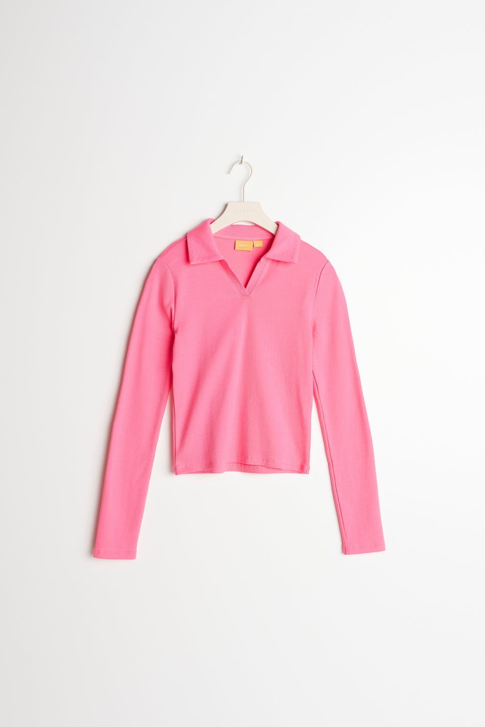 Pitkähihainen trikootoppi Young Gina-tuotemerkiltä V-aukolla. Trikootoppi on pinkki ja siinä on ribattu laatu. Siinä on kaulus ja vartalonmyötäinen istuvuus.