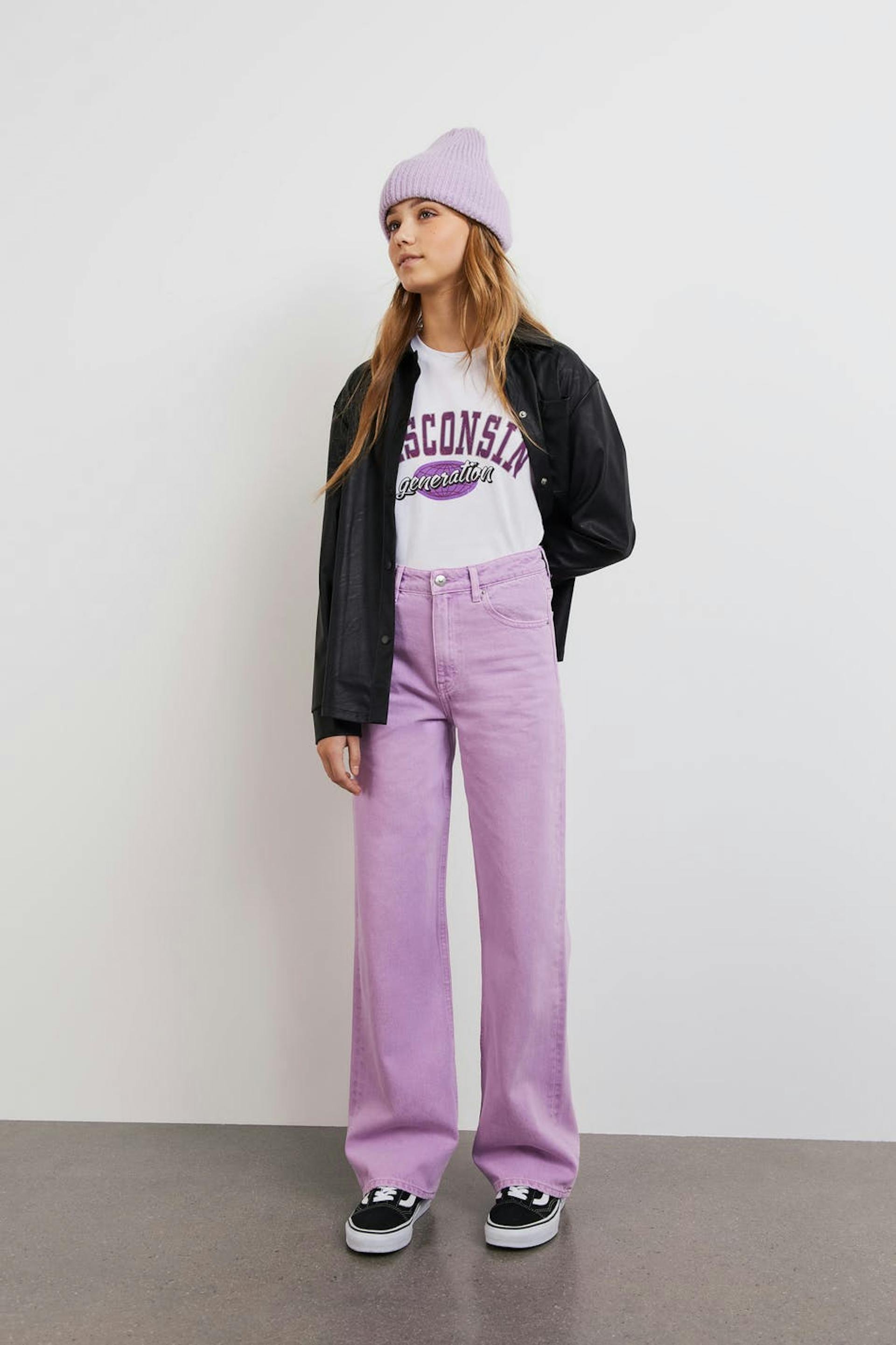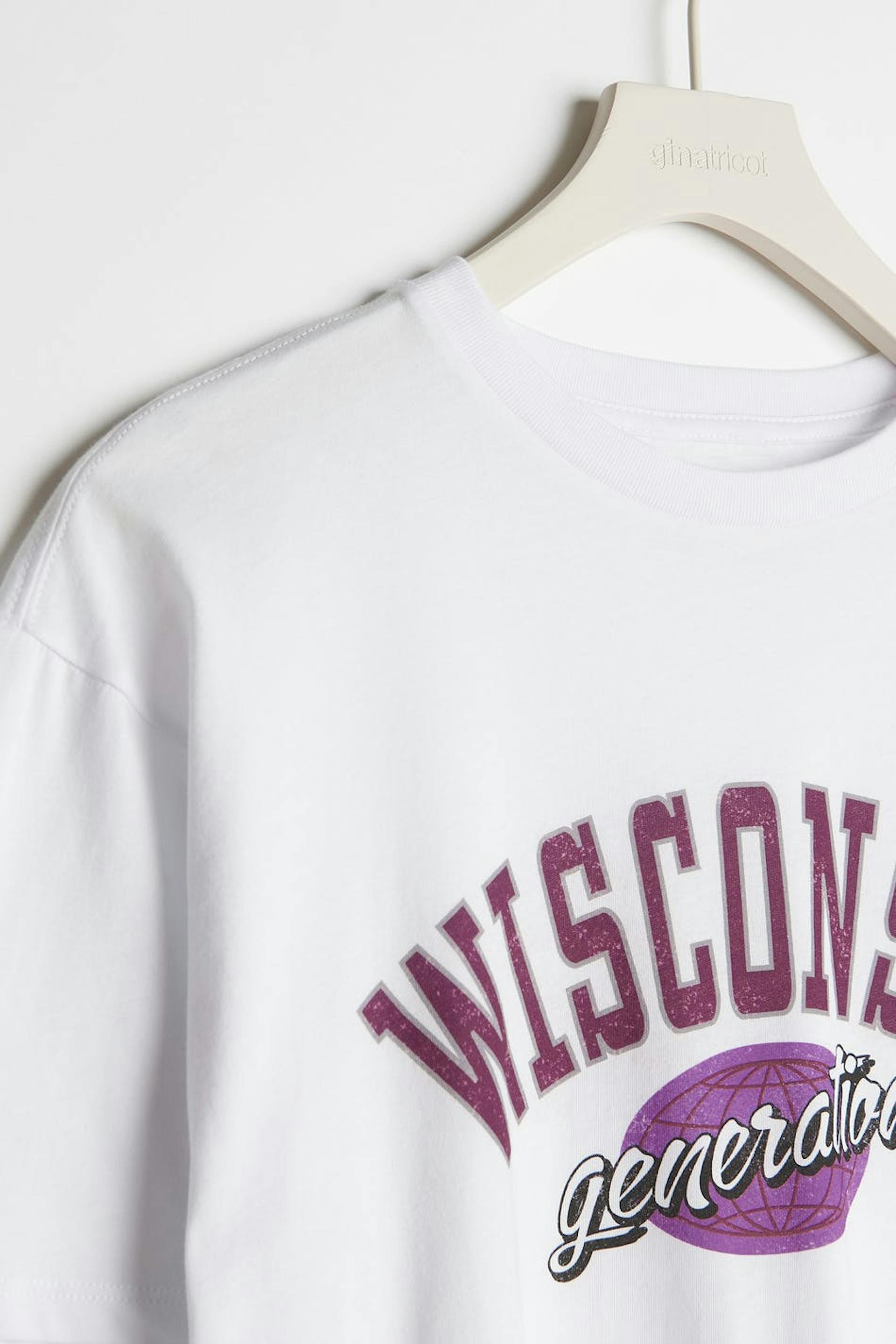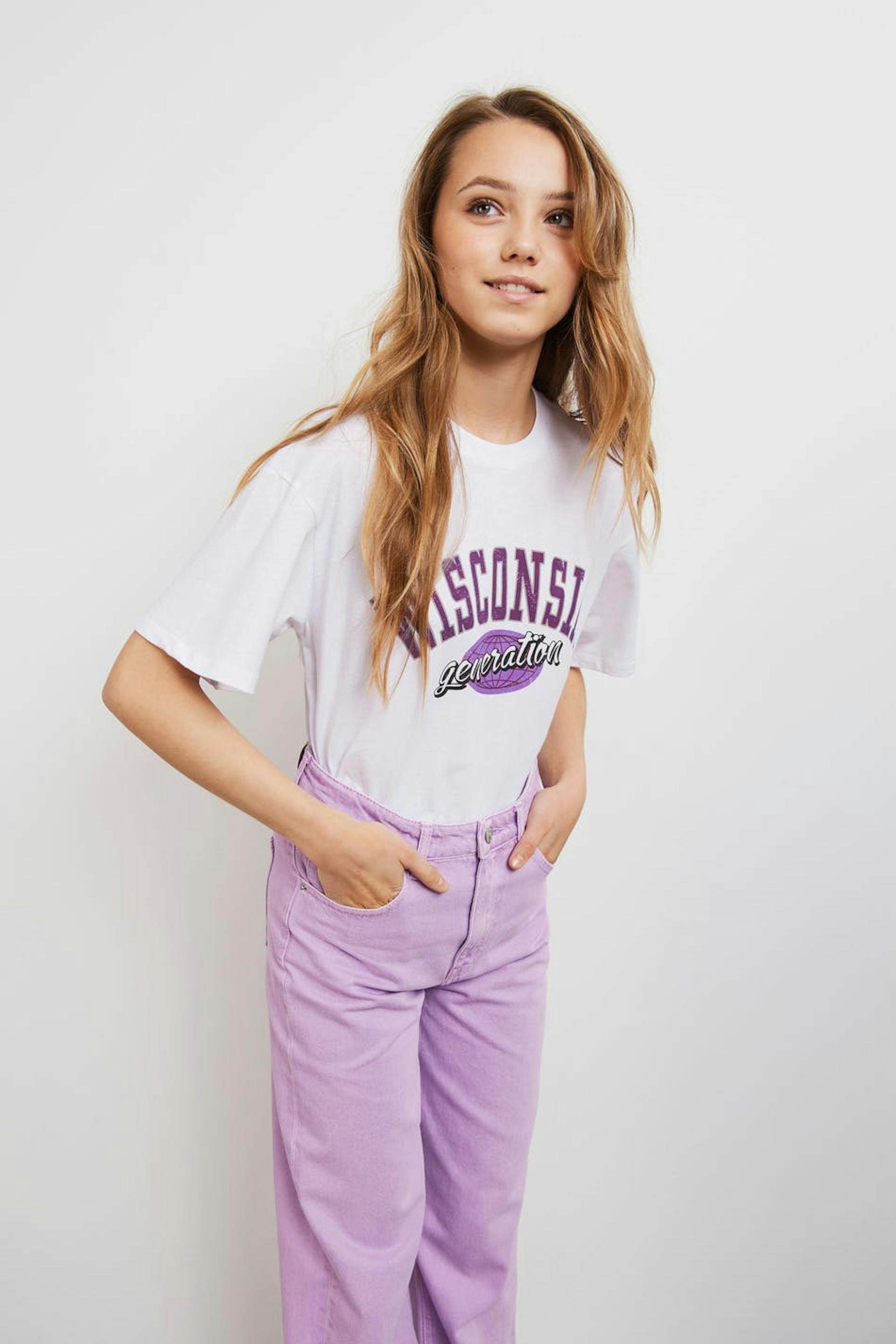 Lyhythihainen T-paita Young Gina-tuotemerkiltä liilalla printillä edessä. T-paita on valkoinen ja siinä on oversized-malli. Siinä on pyöristetty kaula-aukko ja pehmeä materiaali puuvillasta.