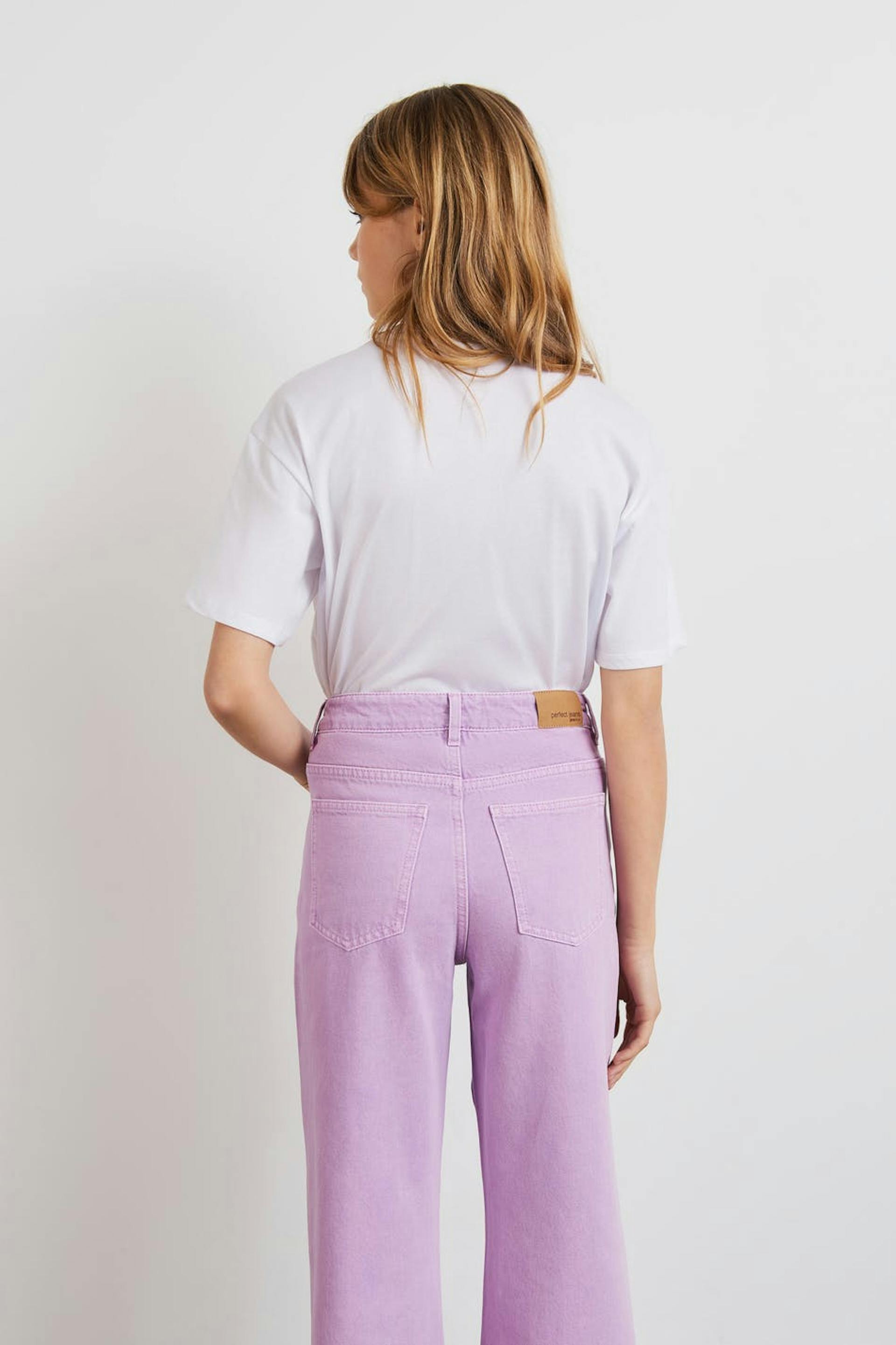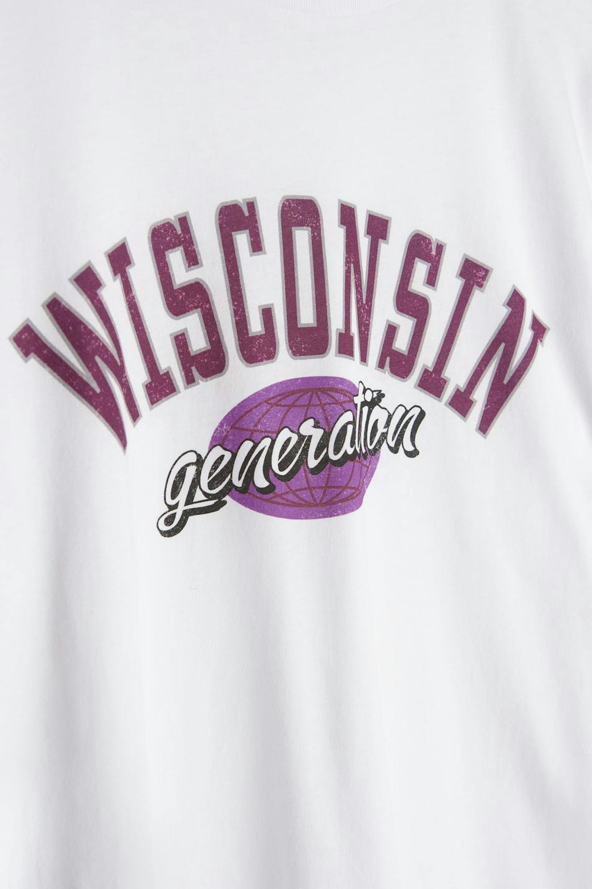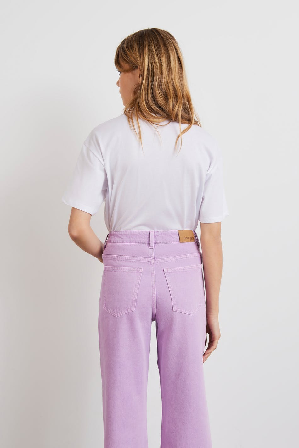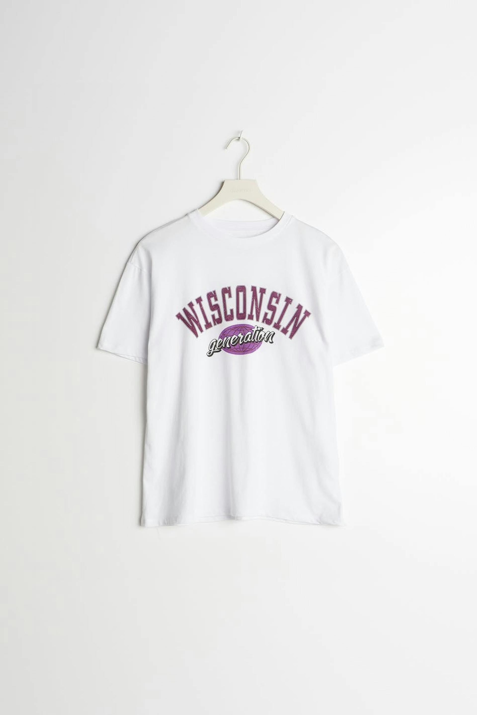 Lyhythihainen T-paita Young Gina-tuotemerkiltä liilalla printillä edessä. T-paita on valkoinen ja siinä on oversized-malli. Siinä on pyöristetty kaula-aukko ja pehmeä materiaali puuvillasta.