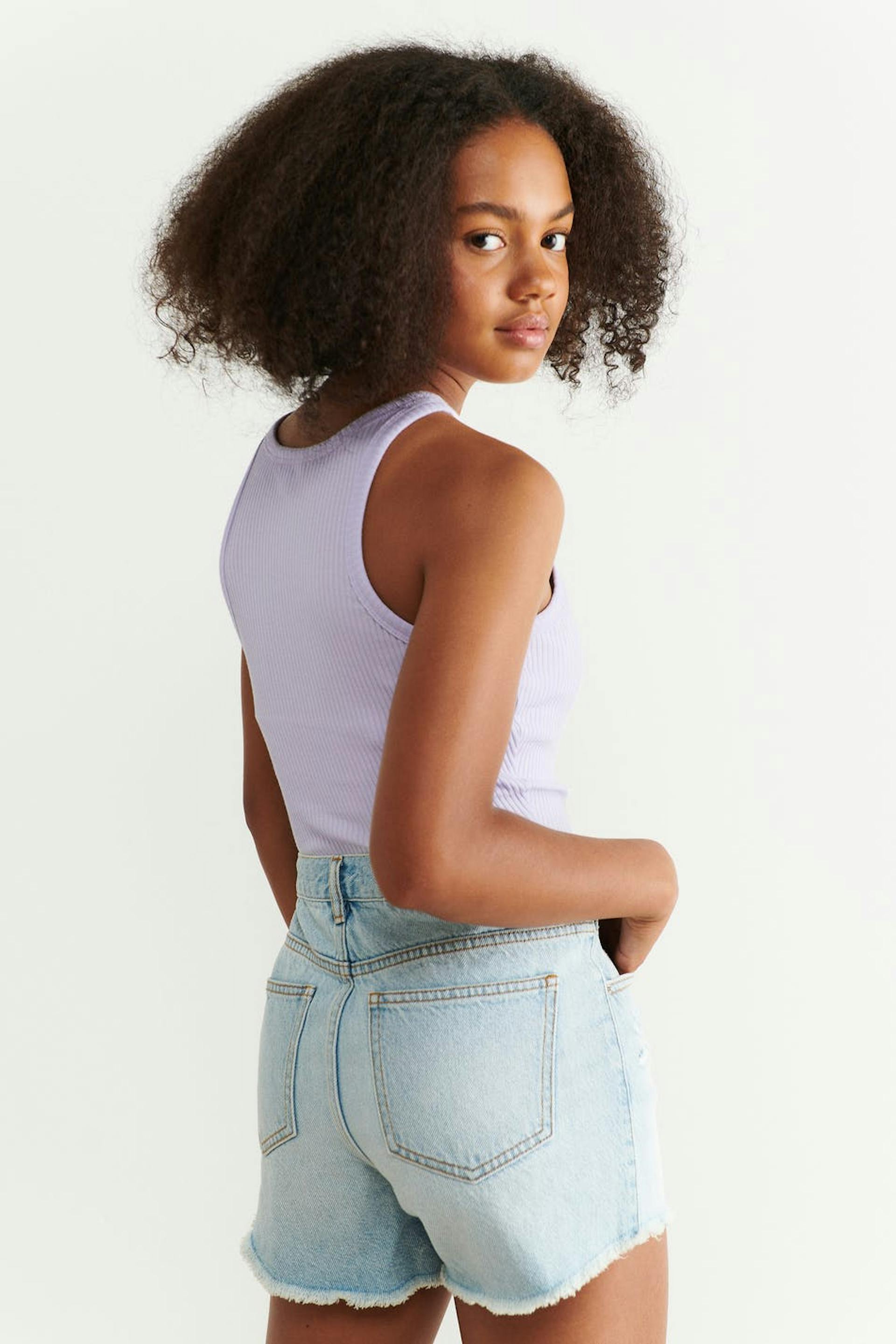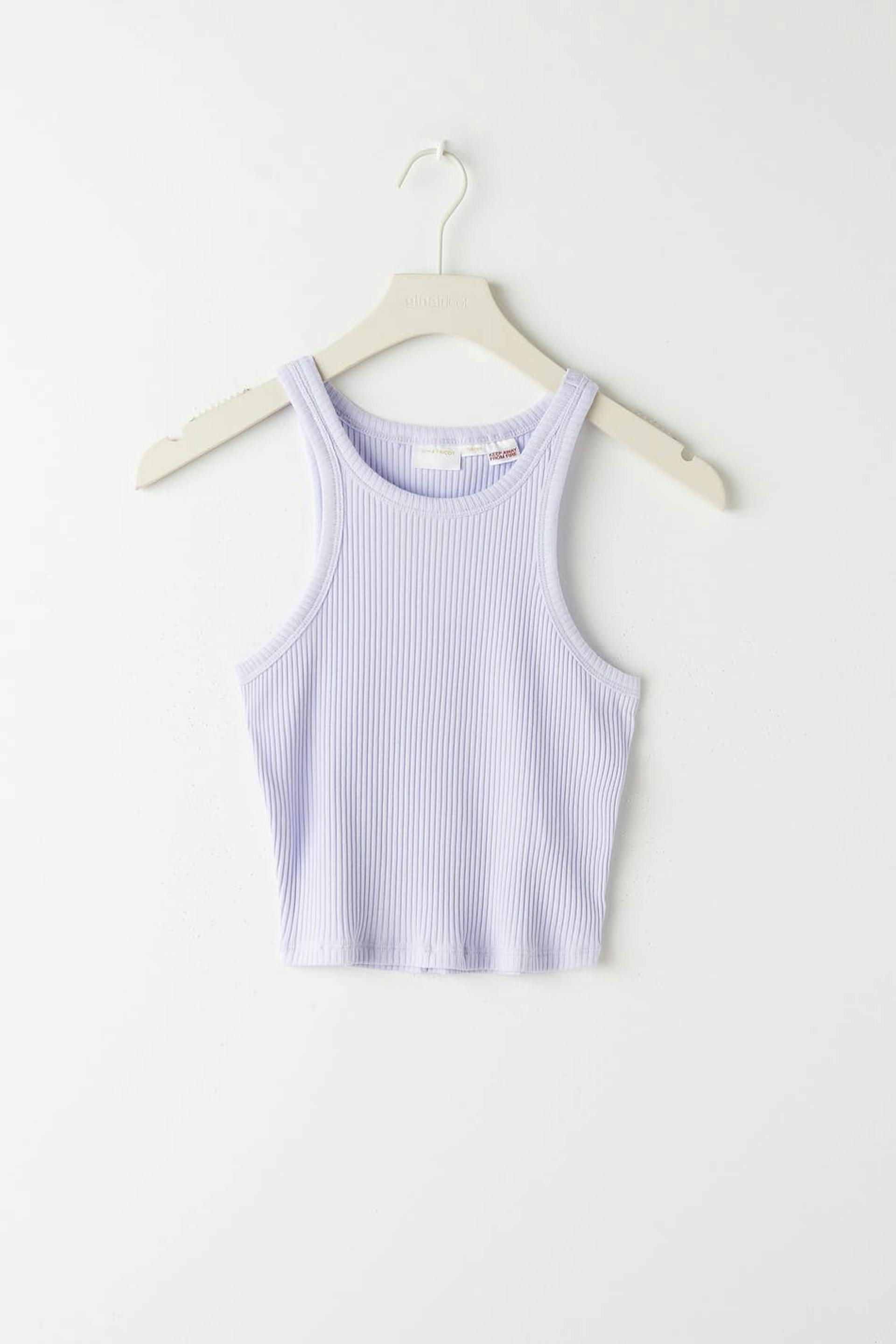 Ribattu toppi Young Gina-tuotemerkiltä vartalonmyötäisellä istuvuudella. Toppi on liila ja siinä on pehmeä laatu trikoosta. Siinä on pyöristetty kaula-aukko ja cropattu pituus.