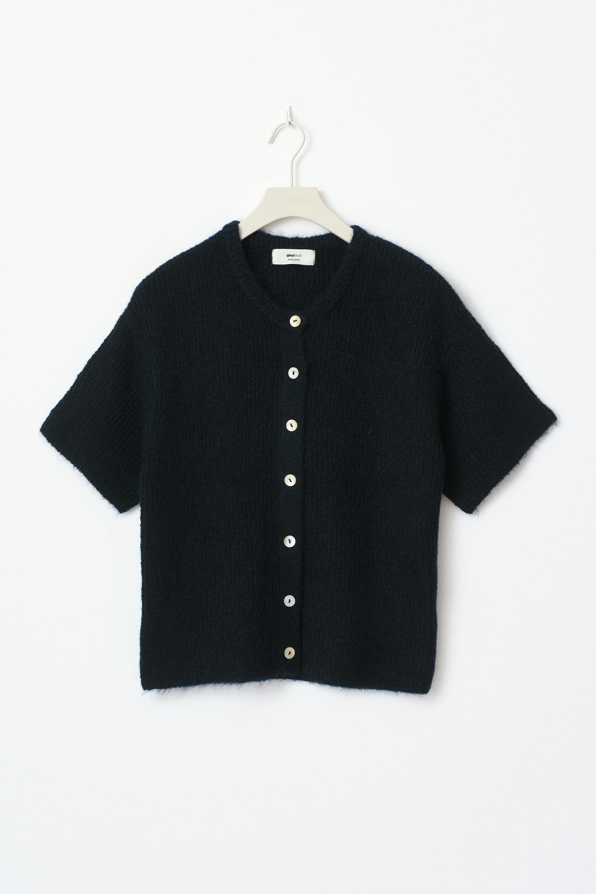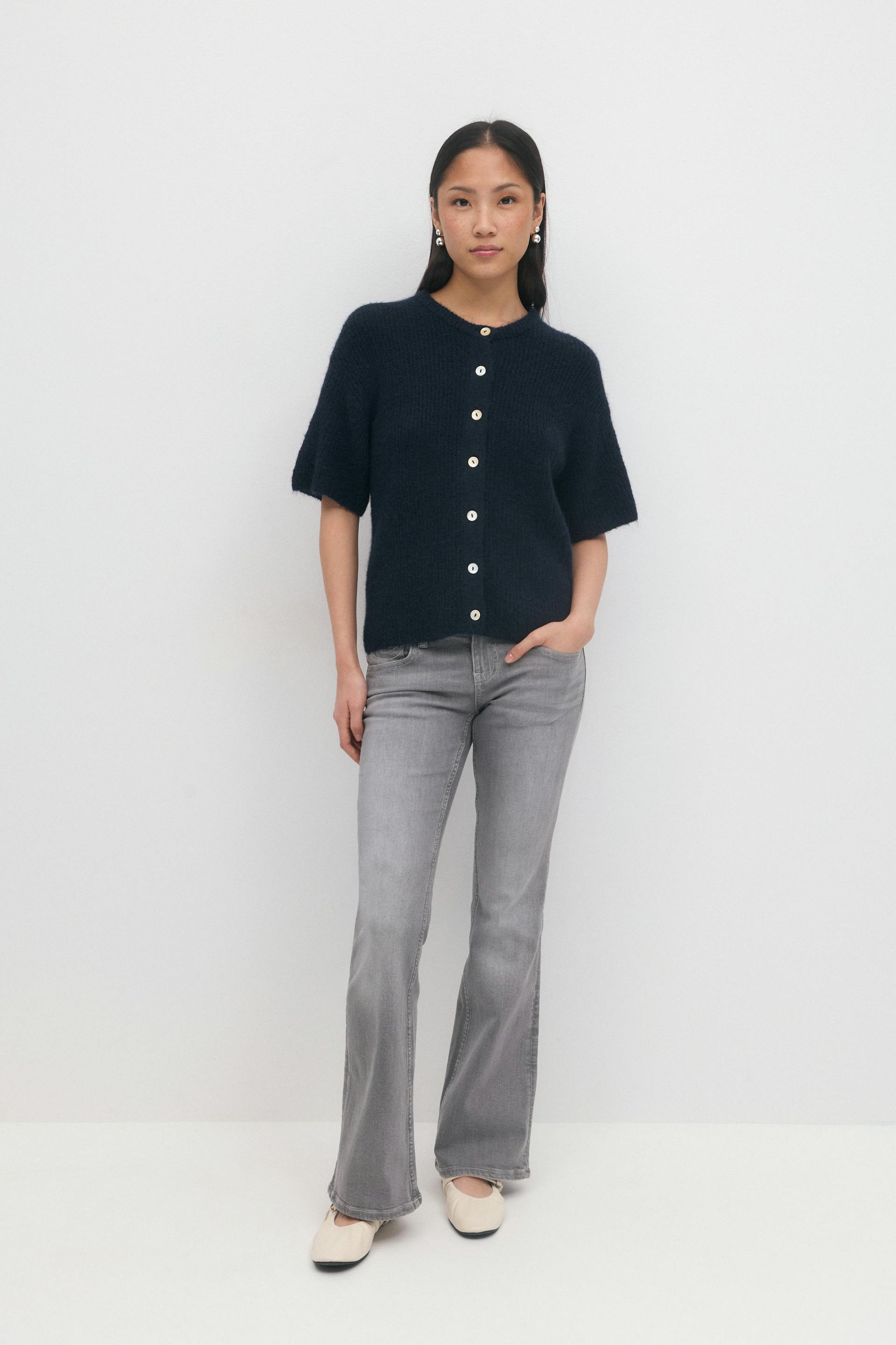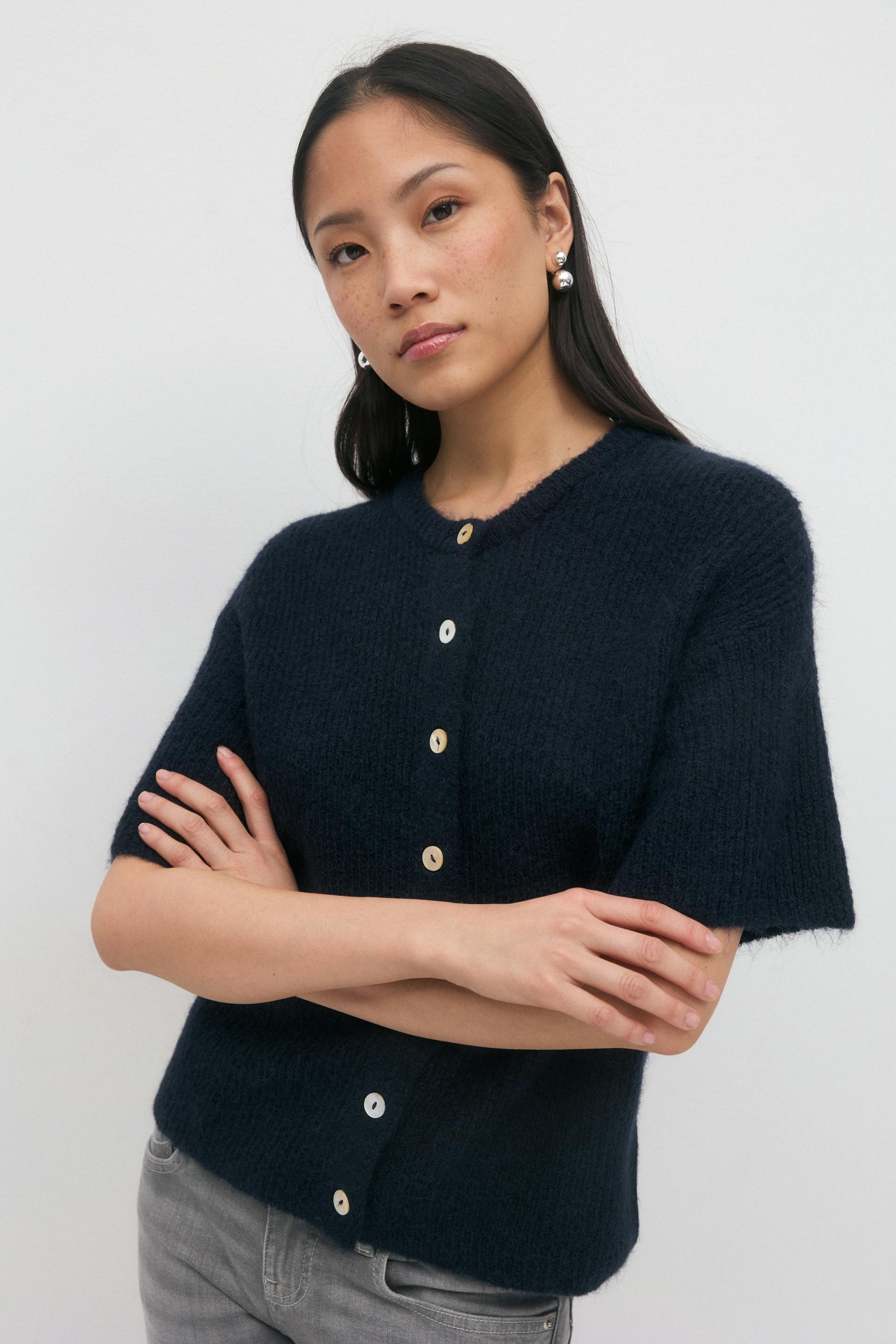 Cardigan à manches courtes avec boutons à l'avant. Le cardigan est bleu et a coupe oversize. Il a col arrondi et qualité douce et tricotée.