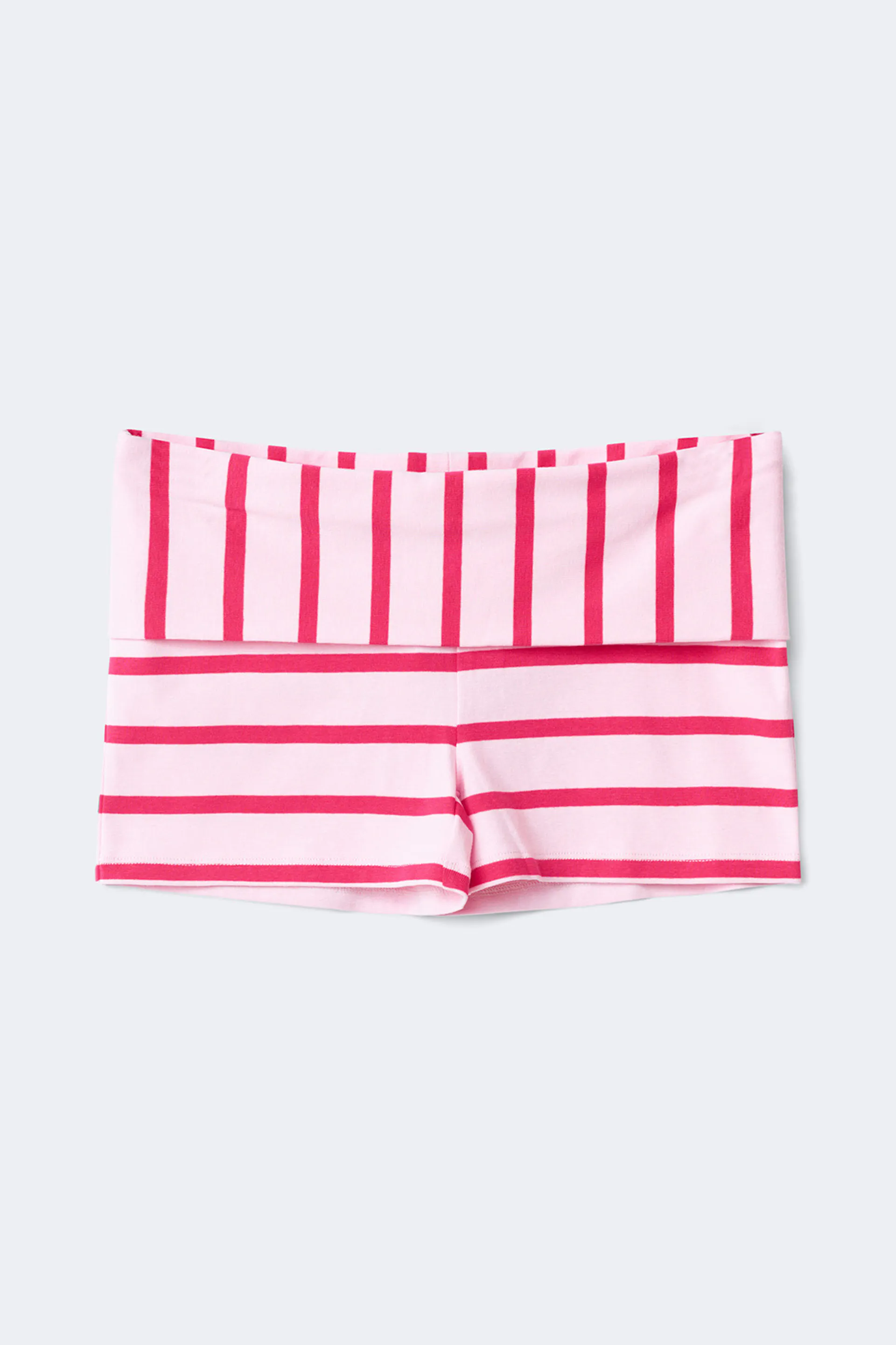 Short rayé avec taille repliée. Le short est rose et a coupe près du corps. Il a matière douce et élastique.