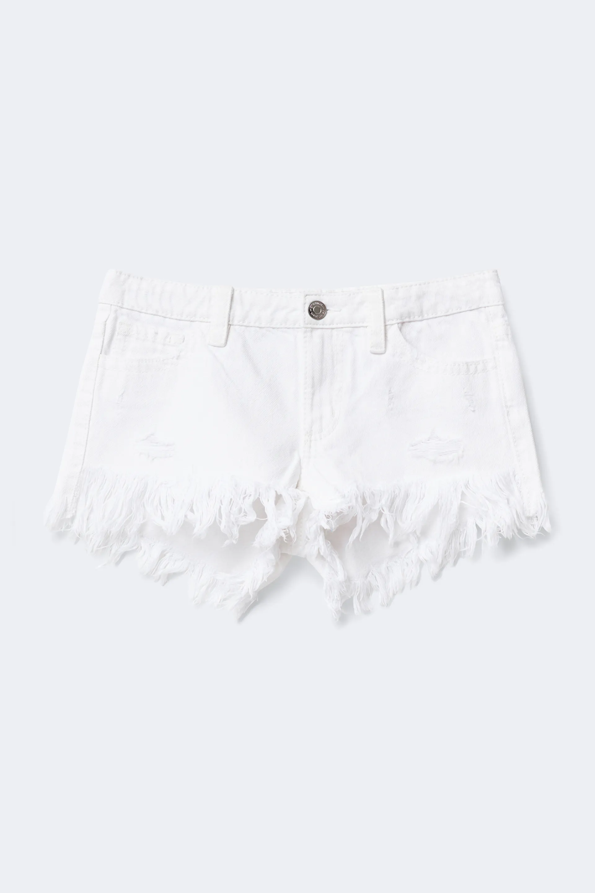 Short en jean taille basse avec franges sur les bords. Le short est blanc et a des détails délavés. Il a des poches à l'avant et à l'arrière, bouton de fermeture, braguette, des boucles de ceinture et coupe régulière.