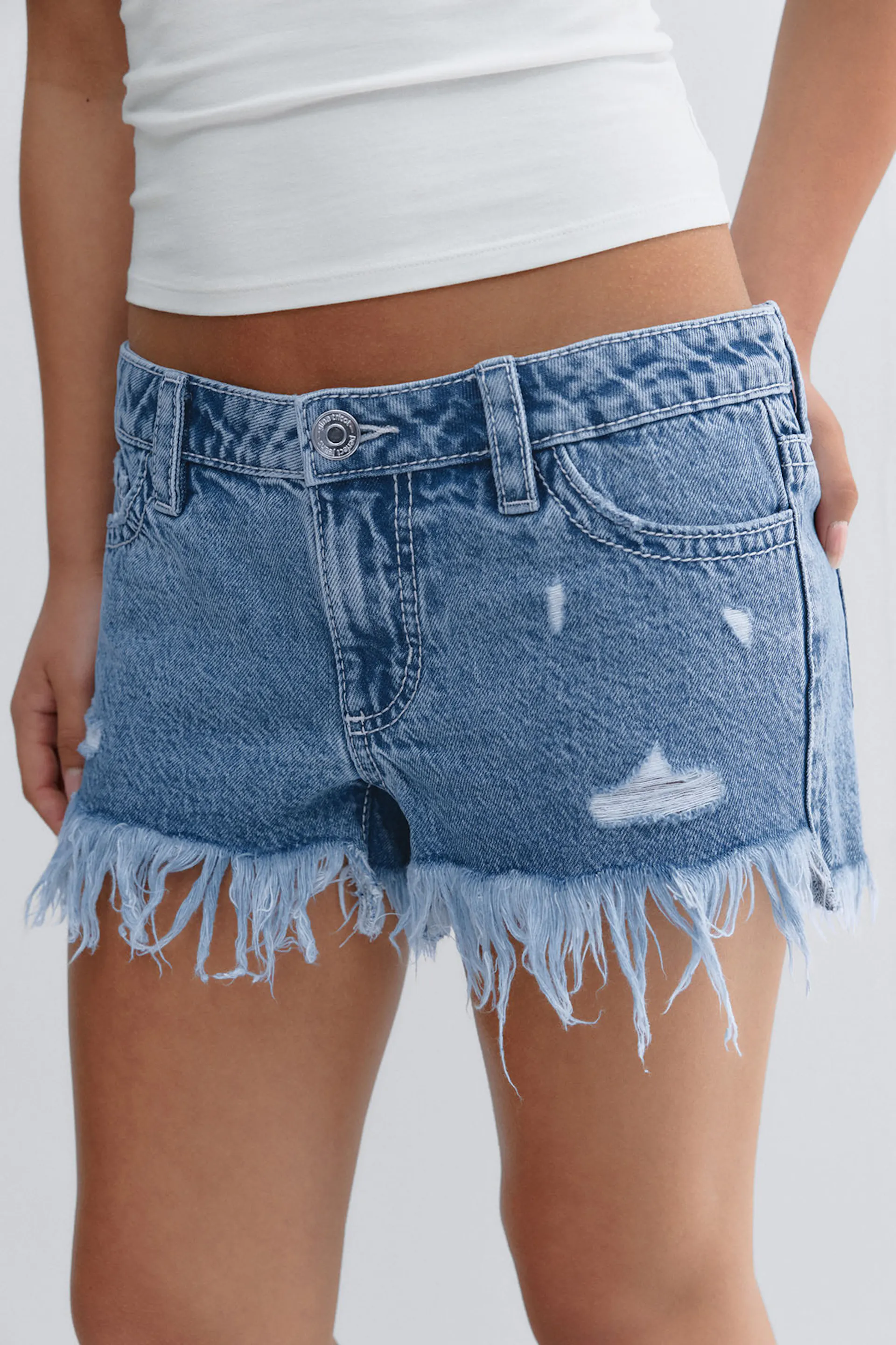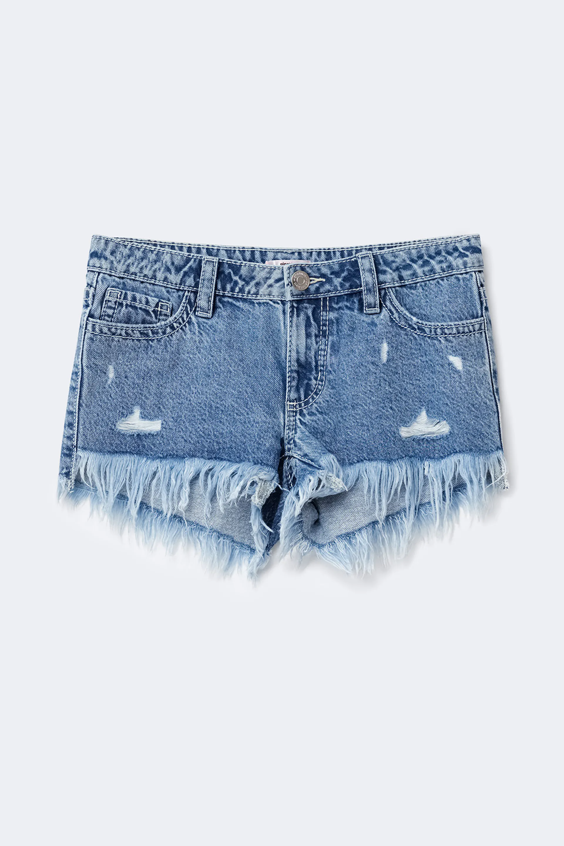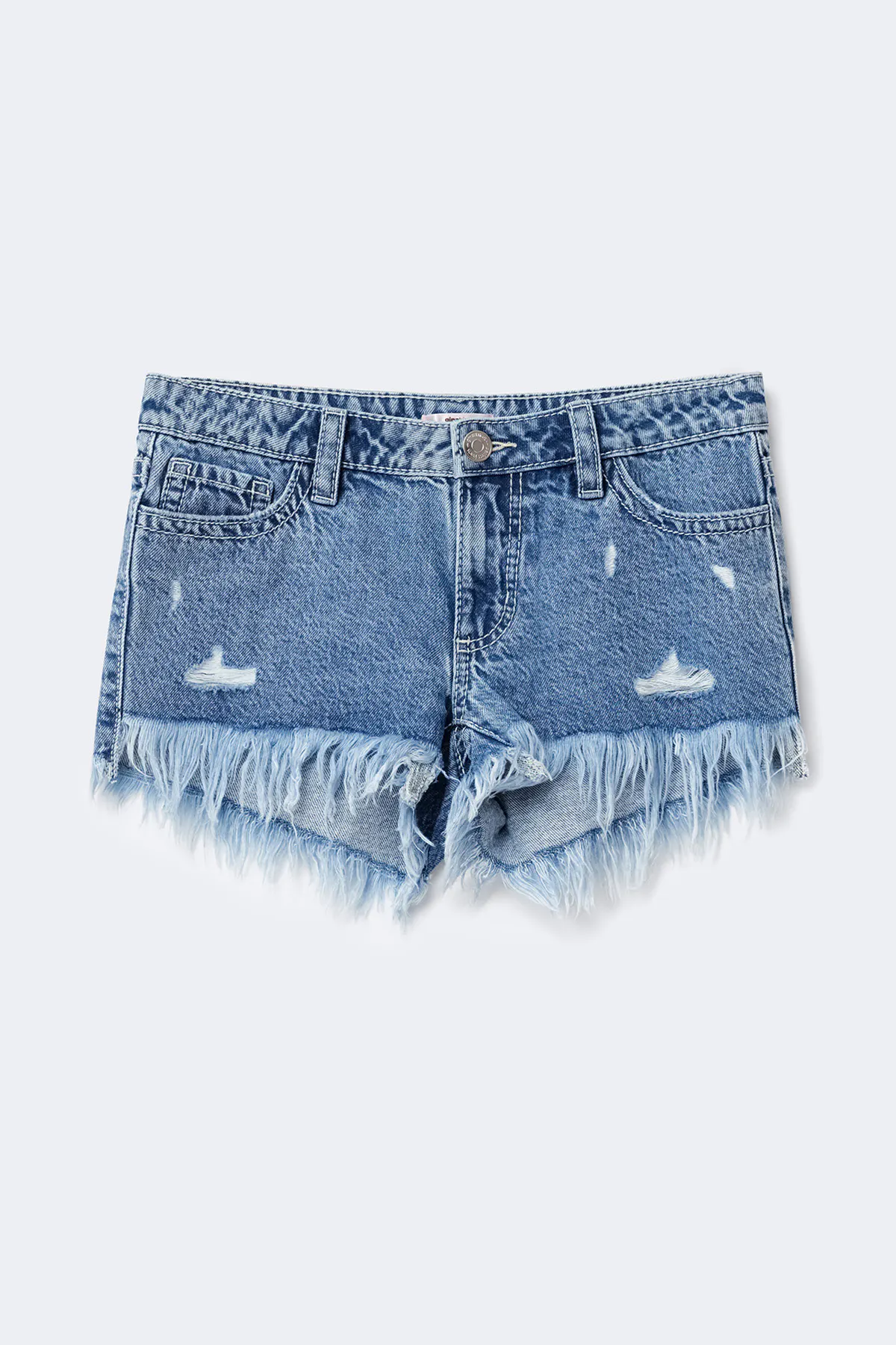 Short en jean taille basse avec franges sur les bords. Le short est bleu clair et a des détails délavés. Il a des poches à l'avant et à l'arrière, bouton de fermeture, braguette, des boucles de ceinture et coupe régulière.