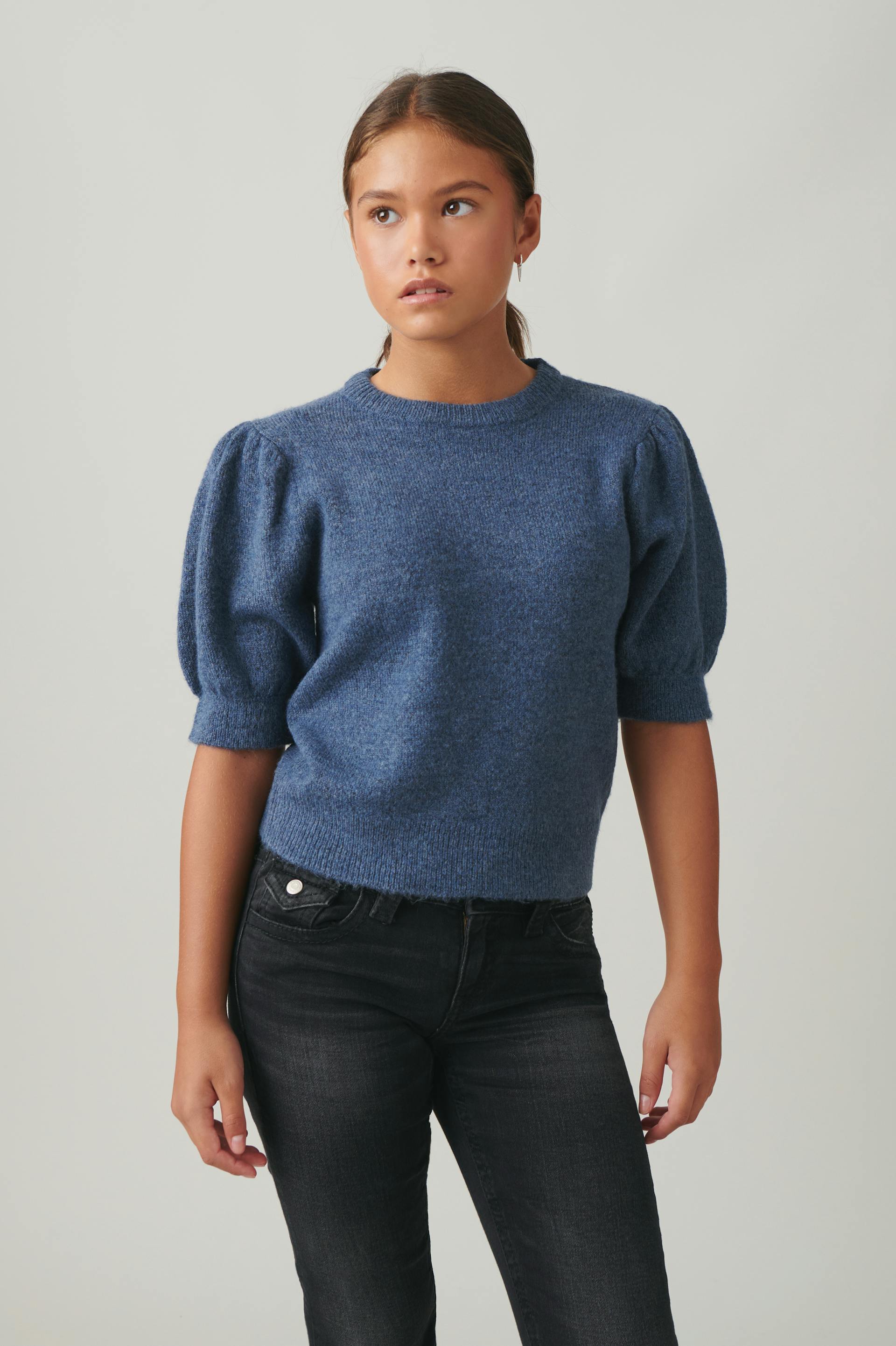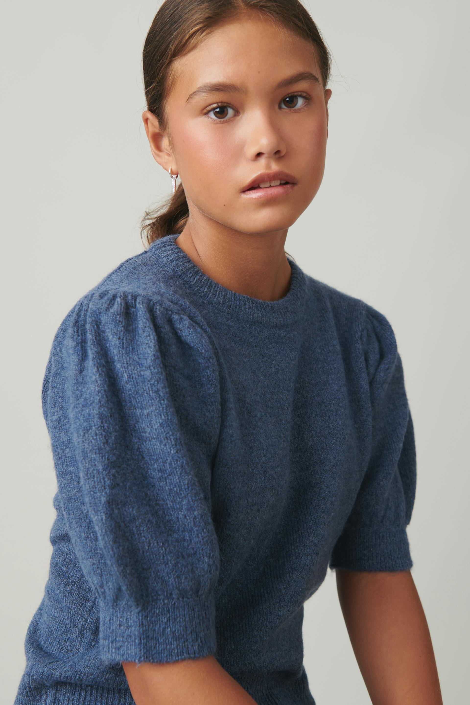 Sleeve style: Puff sleeve Neck: Crew neck Fit: True to size Detail: Ribbed edge Description: Recycled GRS Certified, Rib, Young Additional Description: YOUNG Knitted top with puff sleeves. Yarn is made of 50% GRS-certified recycled polyester Supplier: Ocean Sweater Ind. (Pvt.) Ltd. Production unit: Ocean Sweater Ind. (Pvt.) Ltd.