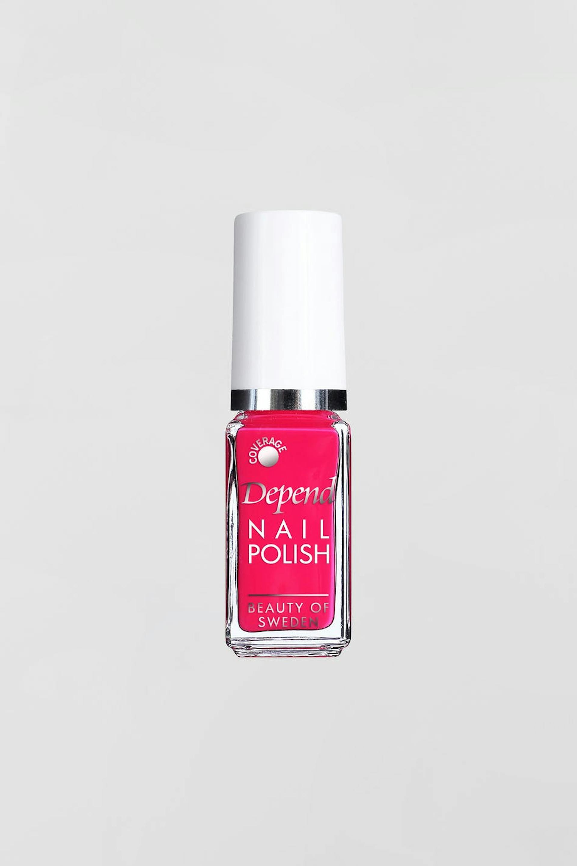 Smalle nagellak van Depend met een platte borstel met een afgeronde rand. De nagellak is roze.