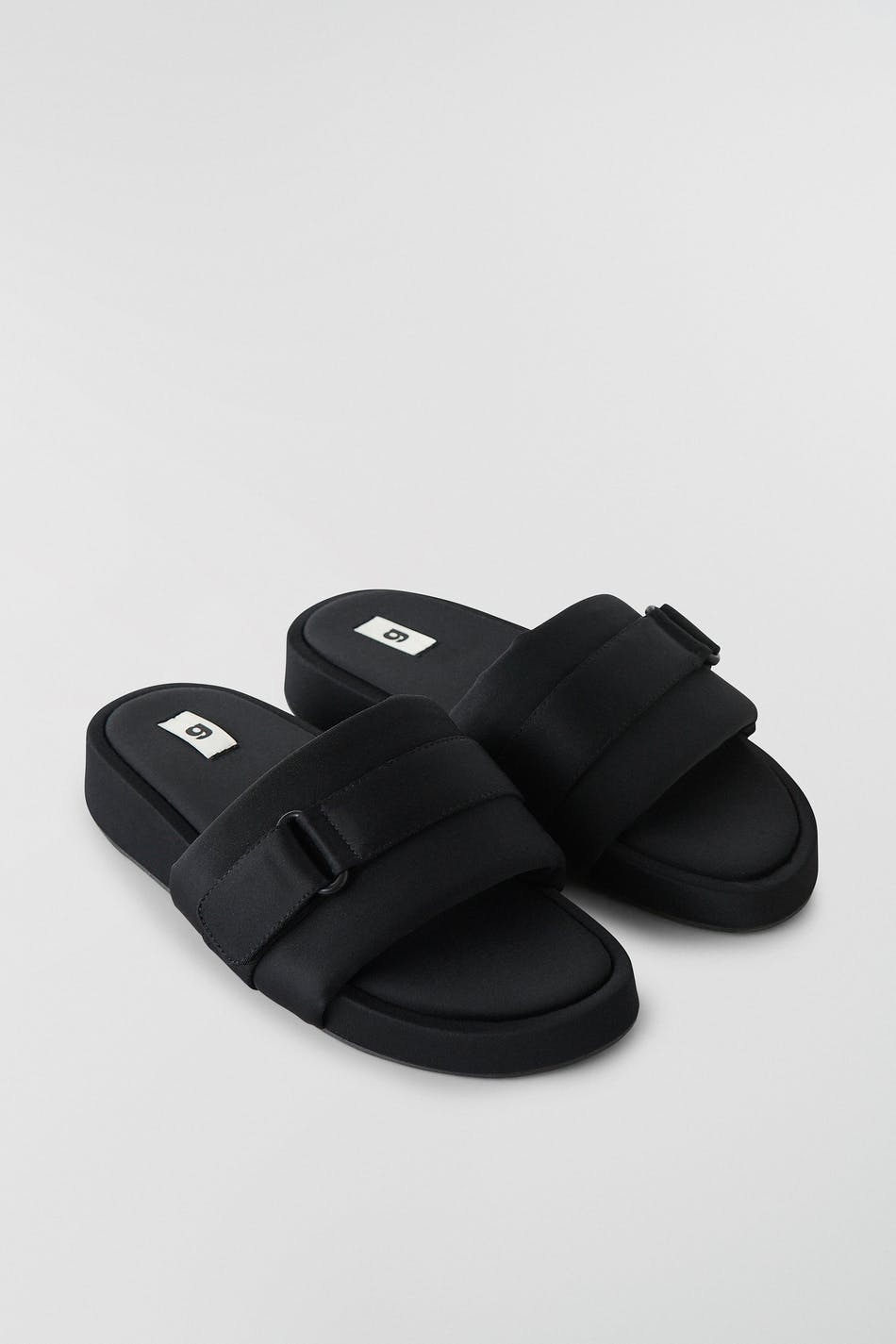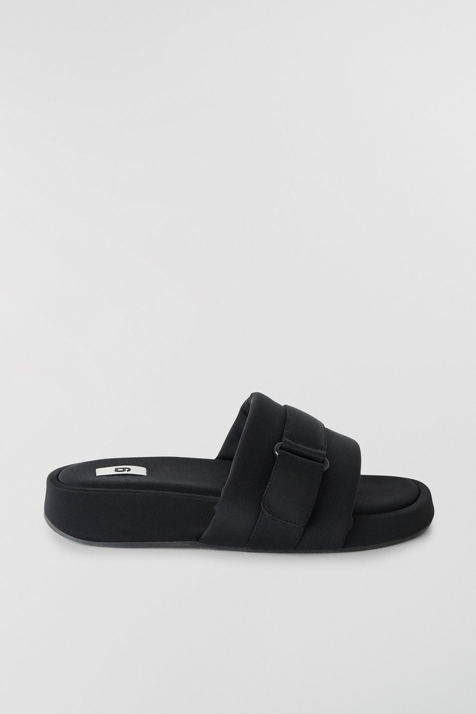 Slip-in sandalen met stevig ontwerp. De sandalen zijn zwart en hebben brede voetband met gesp. Het heeft platform zool en open teen.