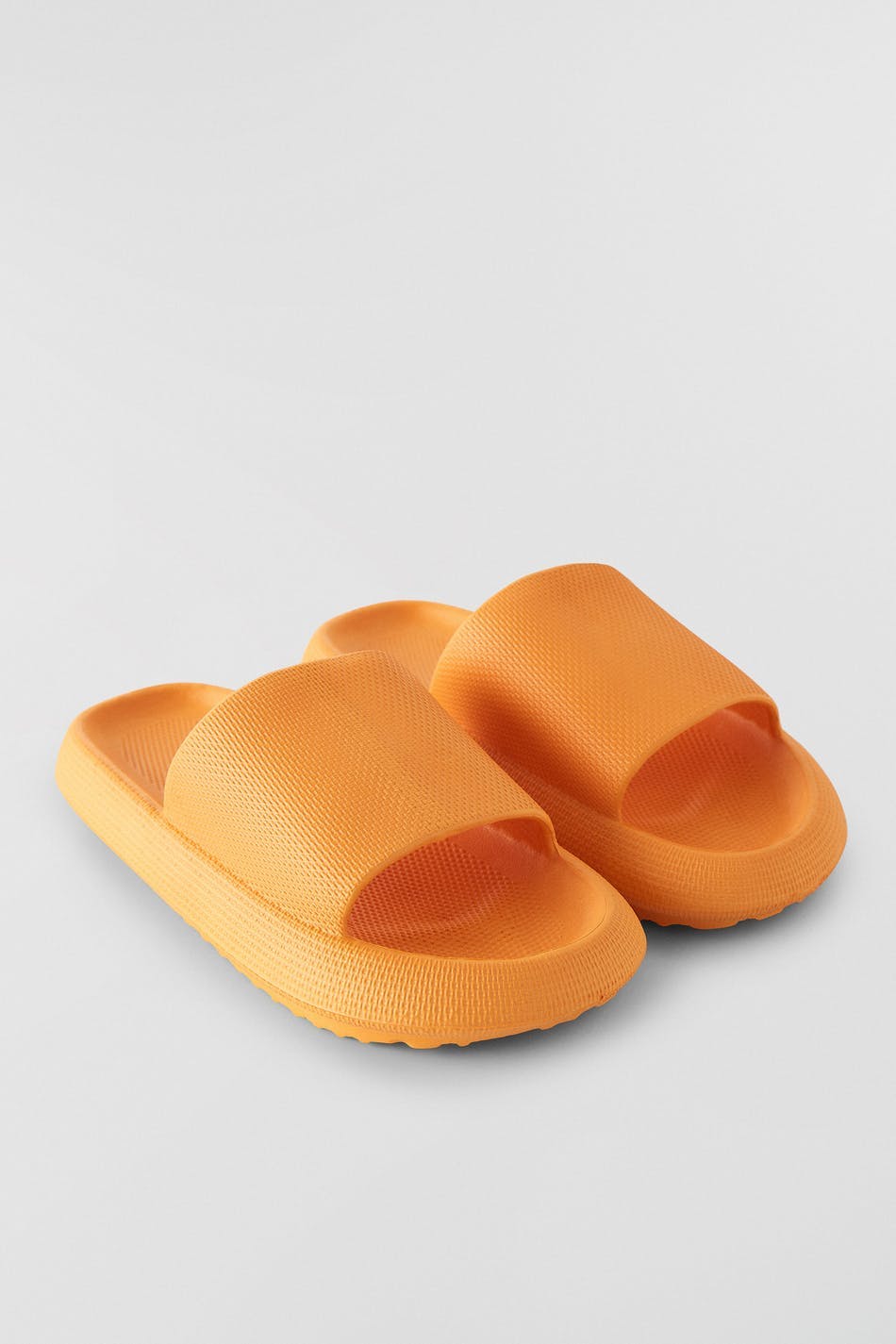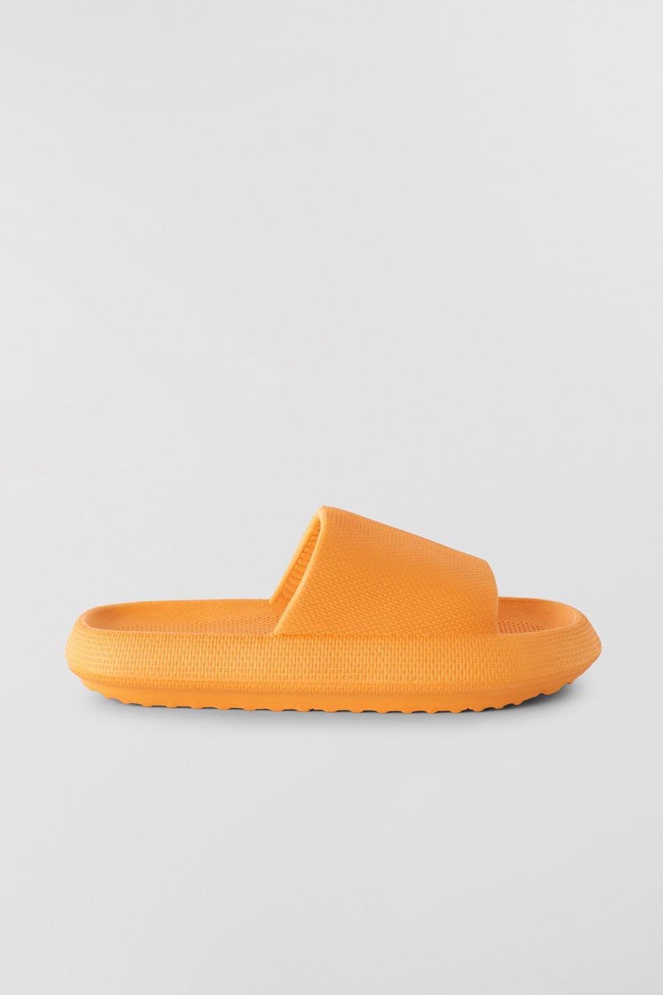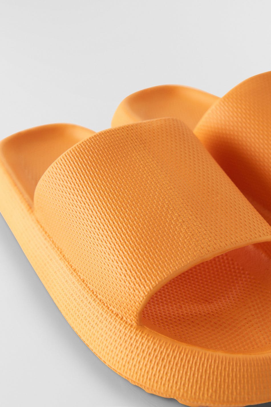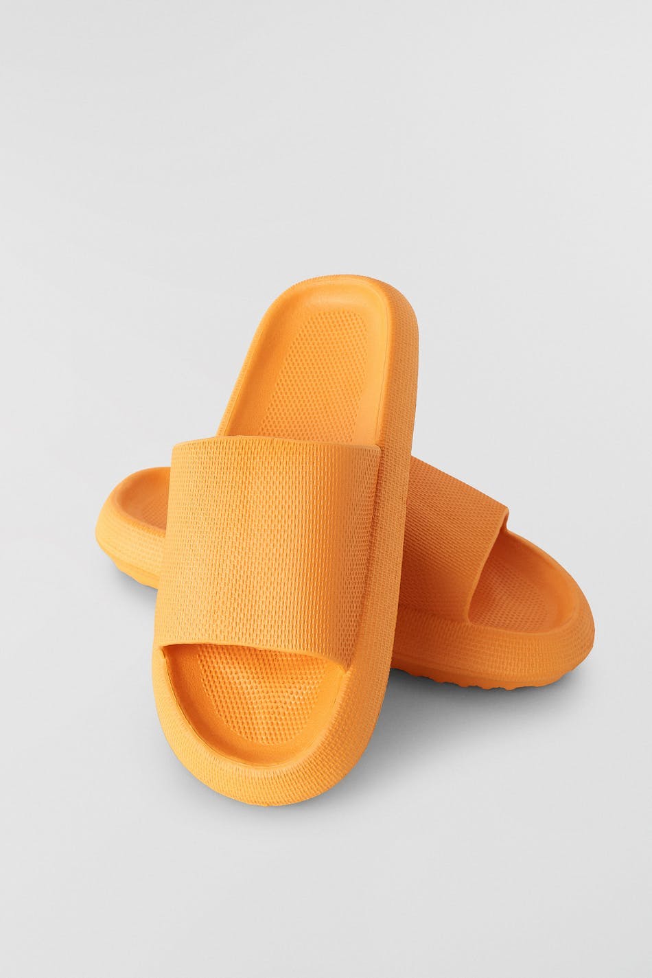 Pantoffels met slip-in ontwerp. De pantoffels zijn oranje en hebben een chunky pasvorm met hoge zool. Het heeft open teen en brede voetbanden.