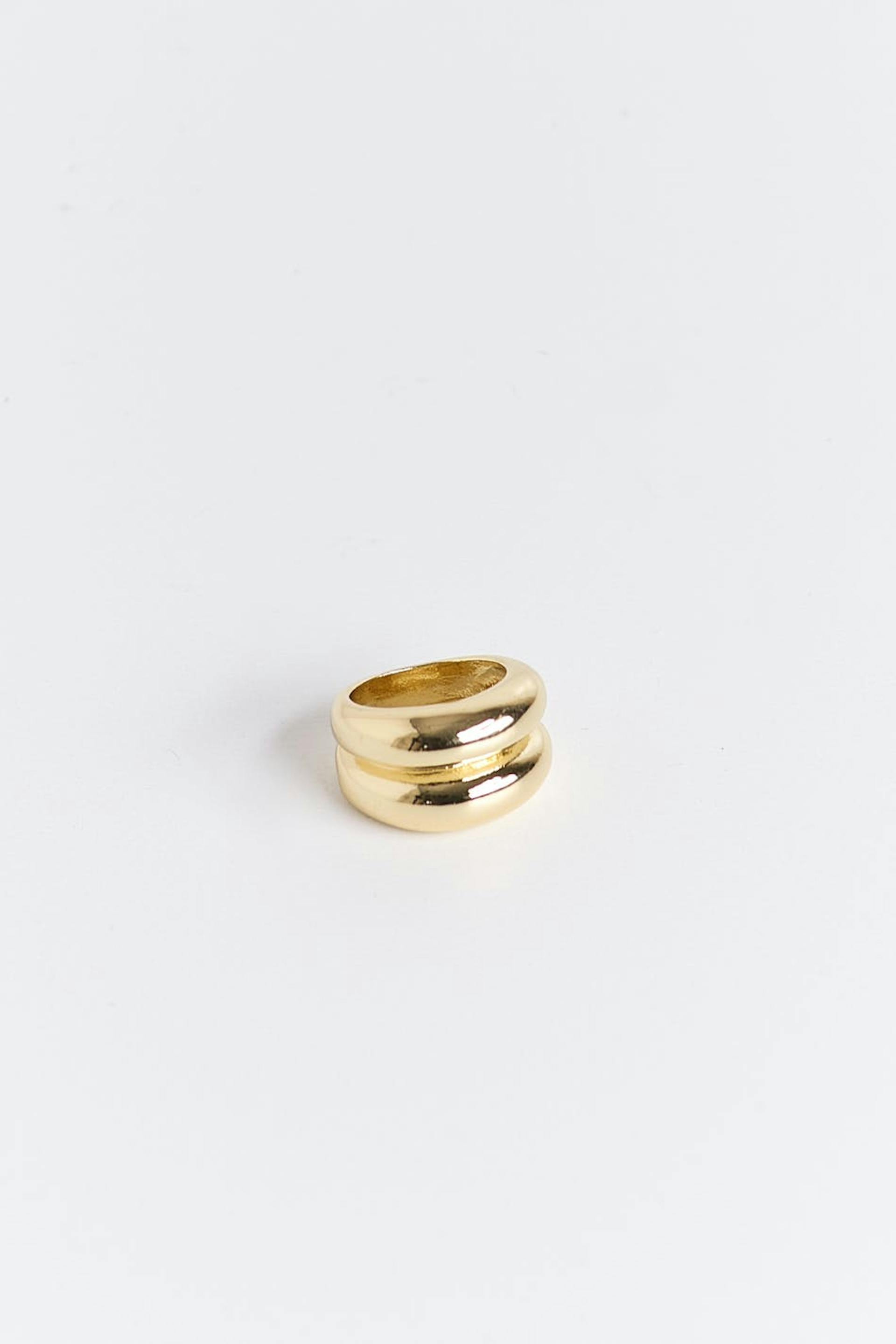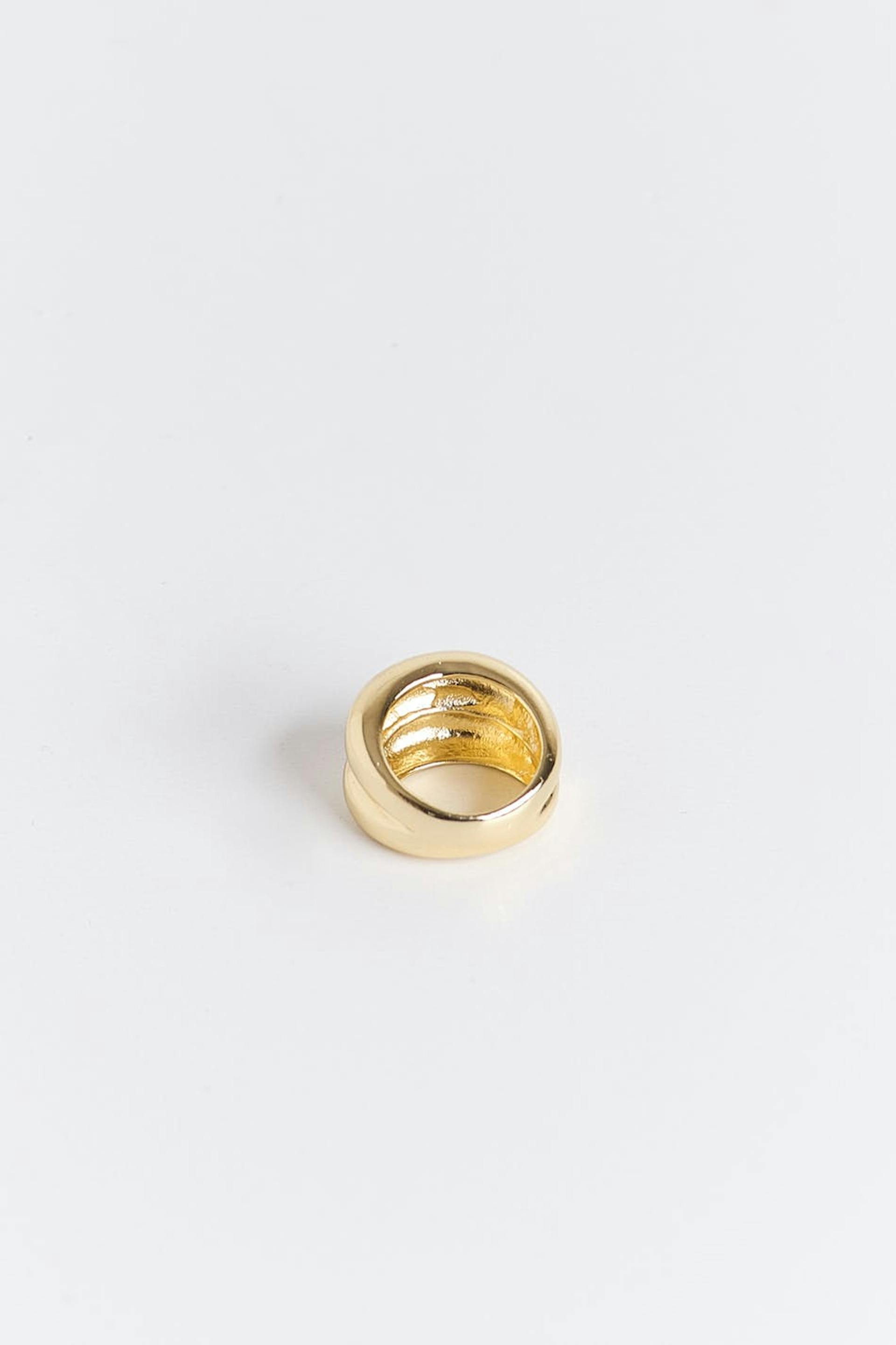 Dubbele ring met chunky pasvorm. De ring is gouden en heeft glimmende finish.