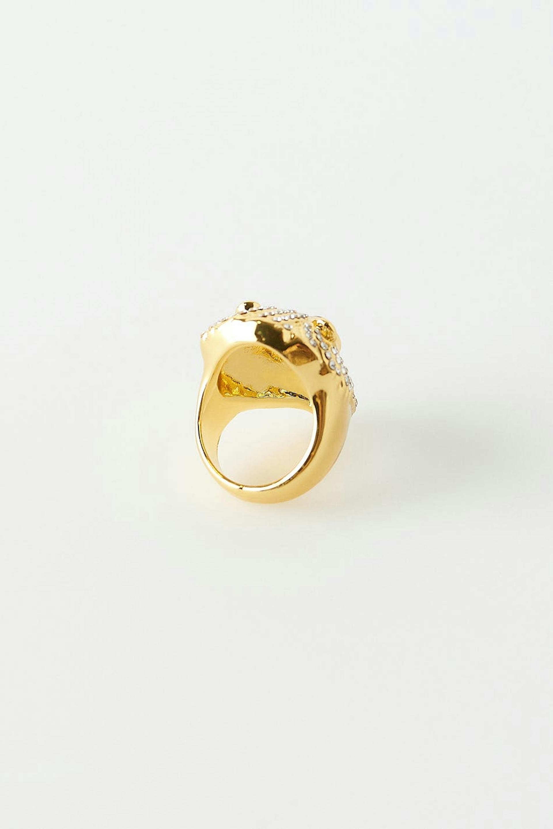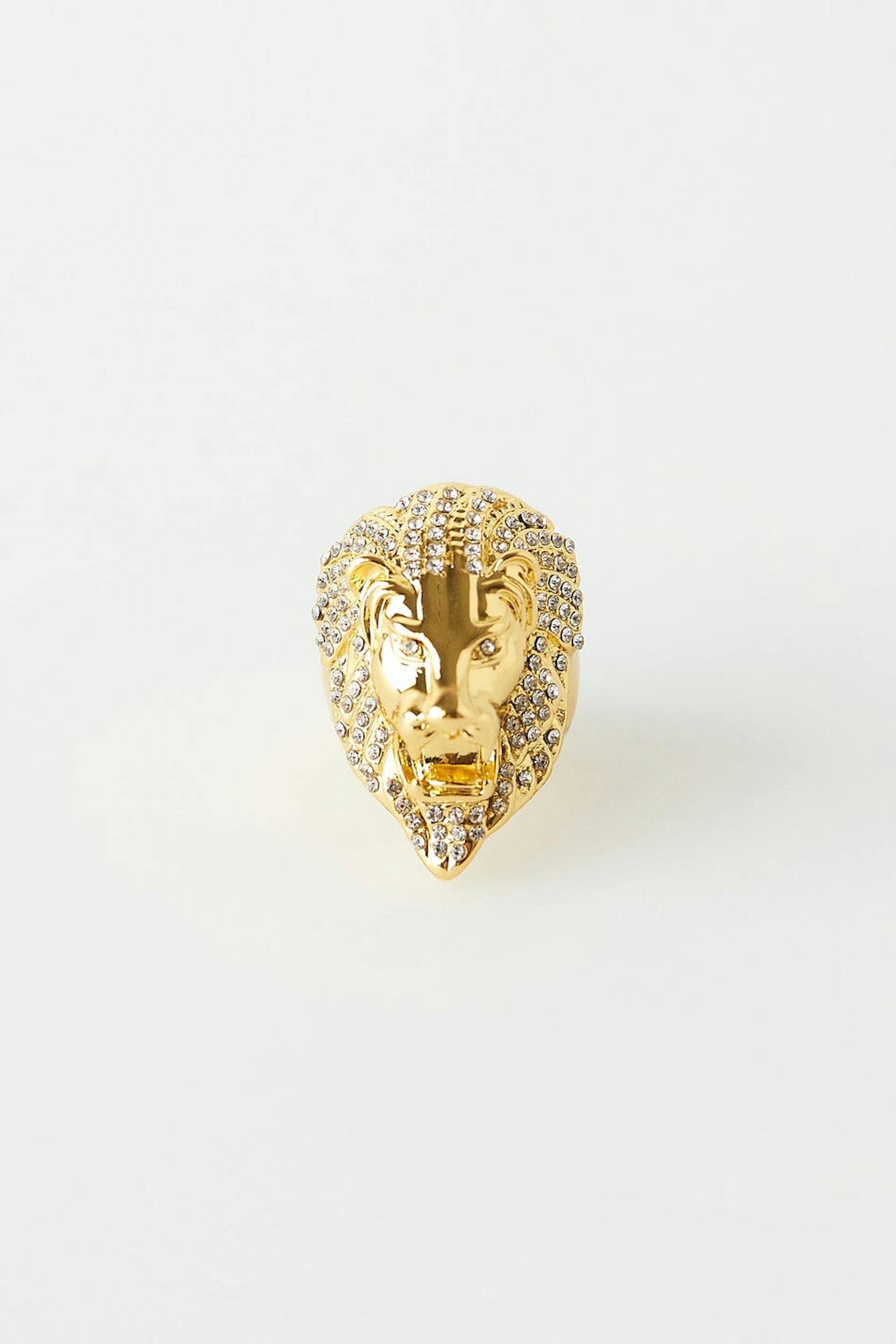 Ring in de vorm van een leeuw met strass versiering. De ring is gouden.