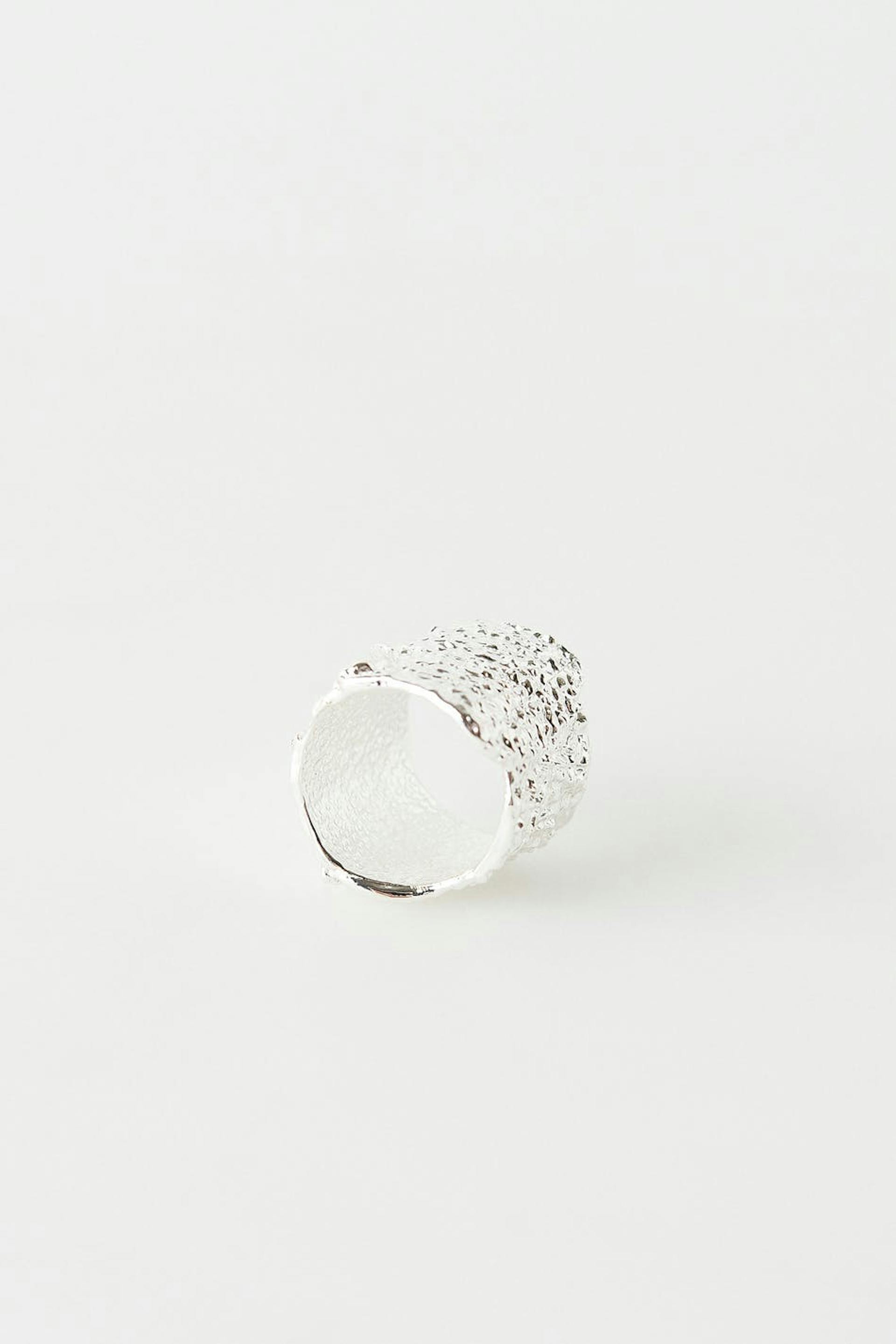 Brede ring met ruwe oppervlakte. De ring is zilverkleurig.