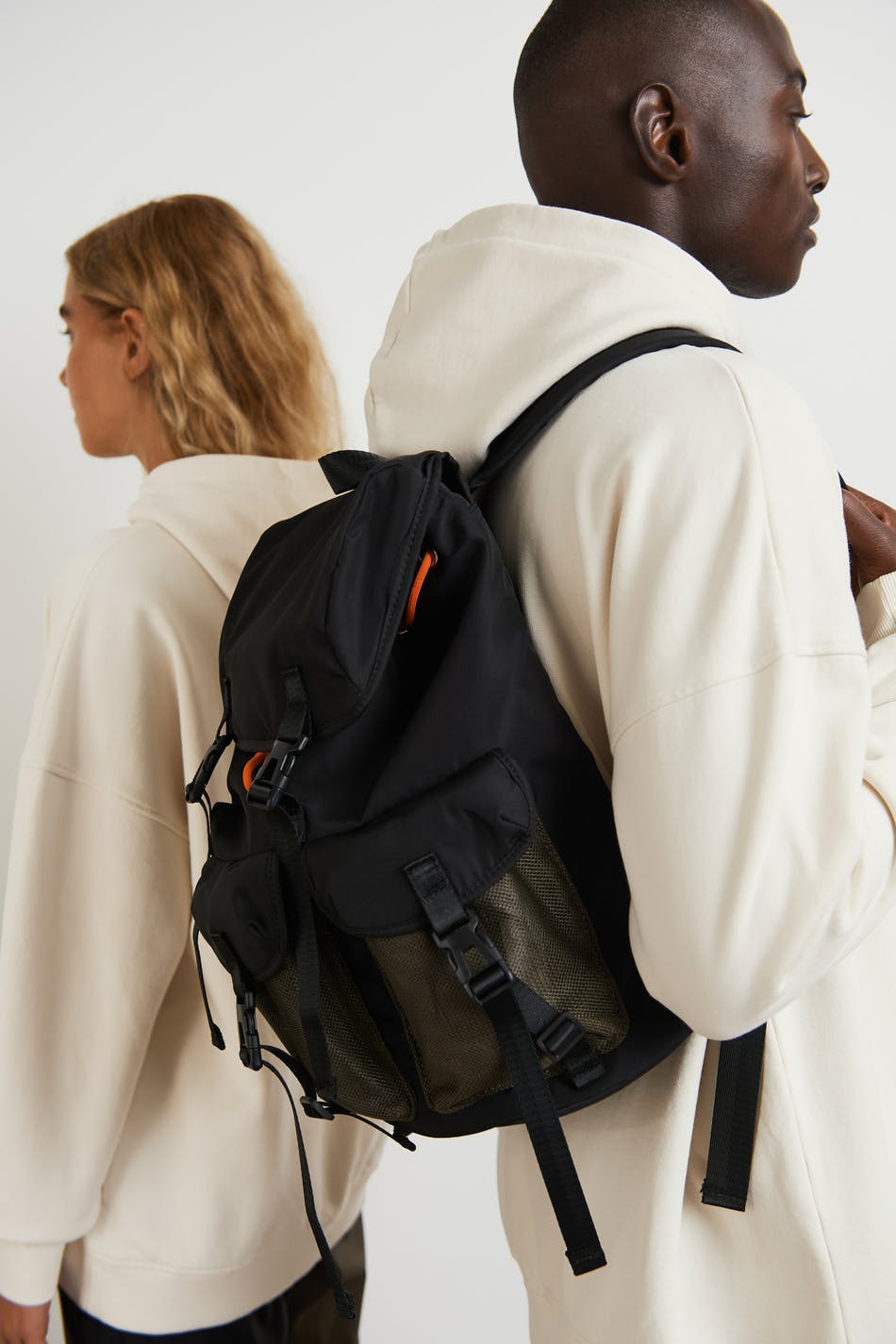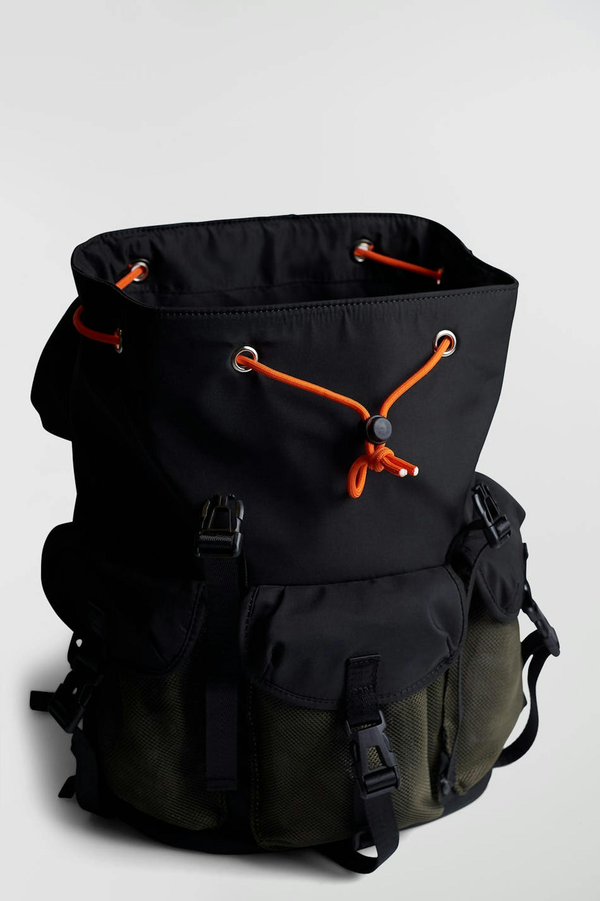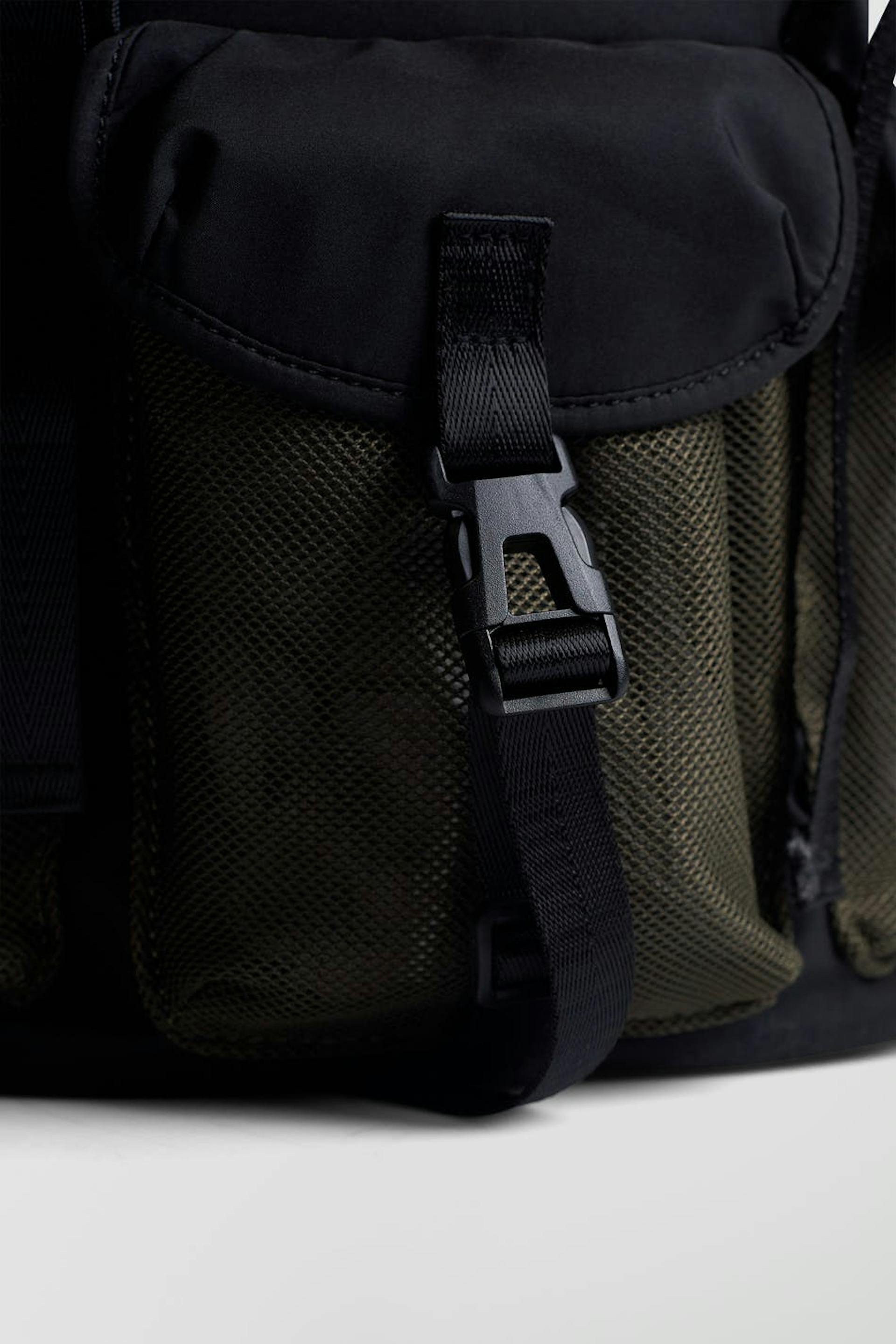 Rugtas van Gina Lab met drie buitenvakken met gespen. De tas is zwart en heeft verstelbare schouderbanden. Het heeft een verstelbaar trekkoord aan de bovenkant, een handvat, zakken aan de binnenkant en een binnenvak met rits.