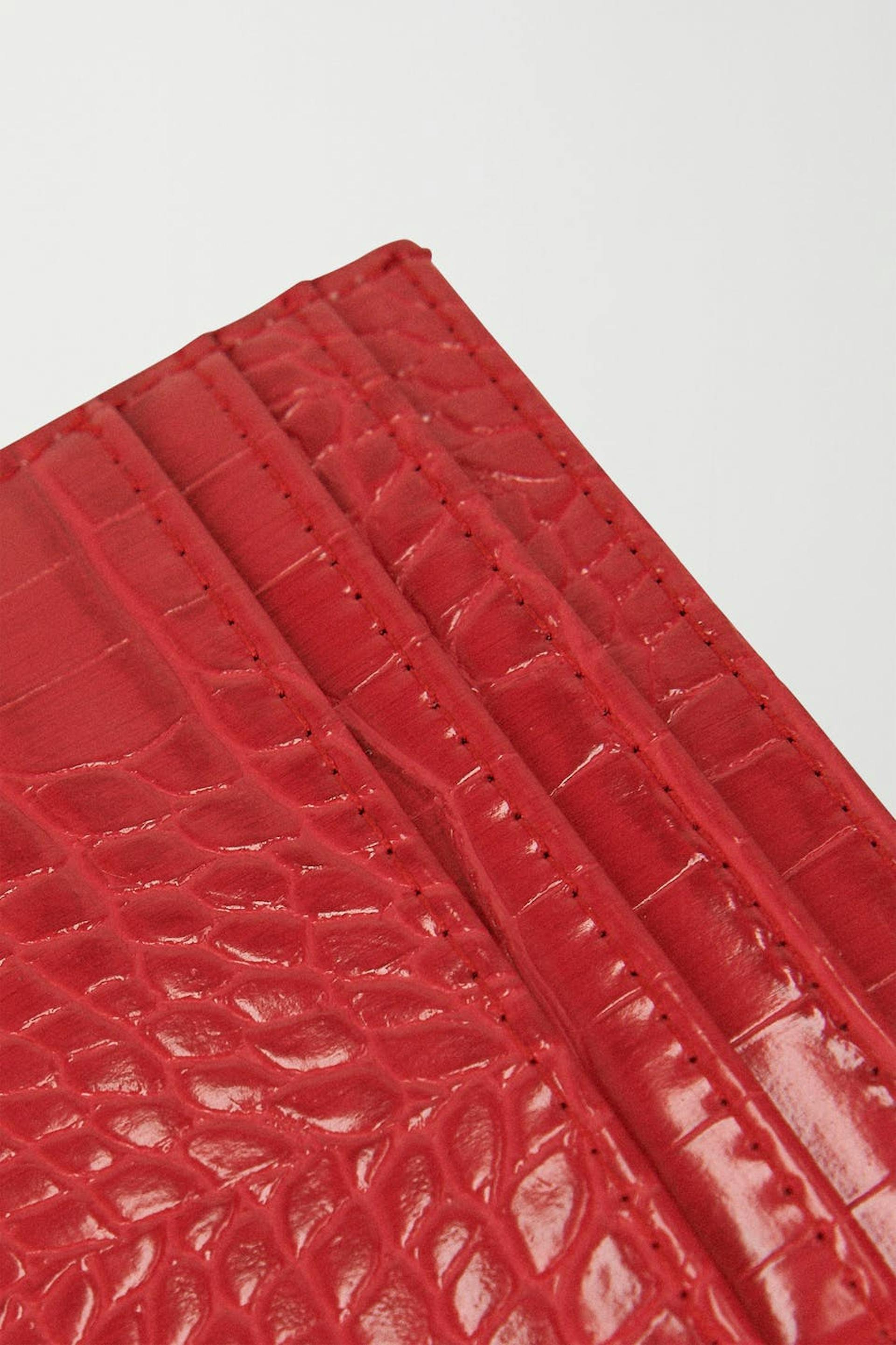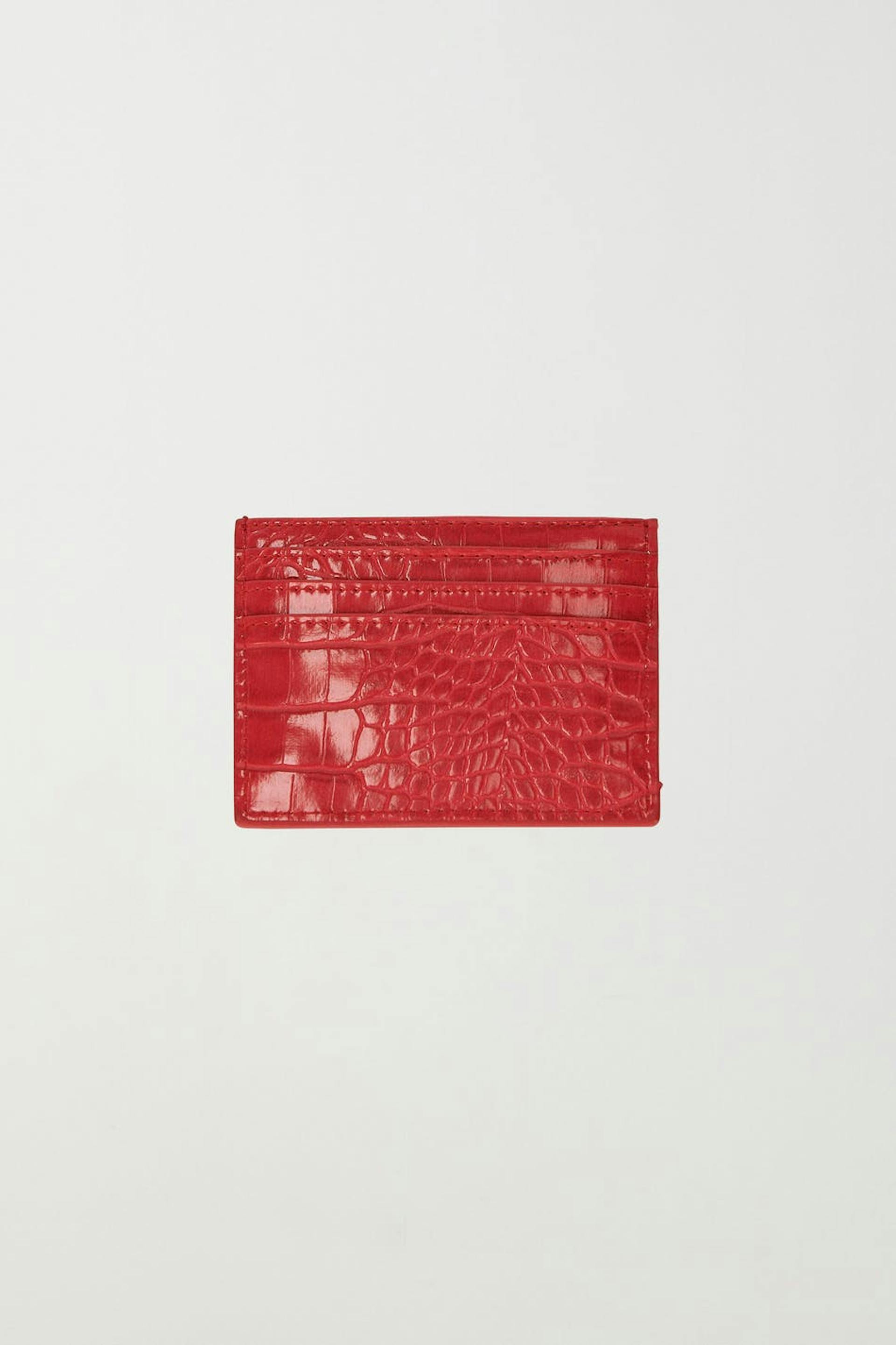 Kaarthouder met een krokodillenpatroon en meerdere gedeeltes. De kaarthouder is rood.