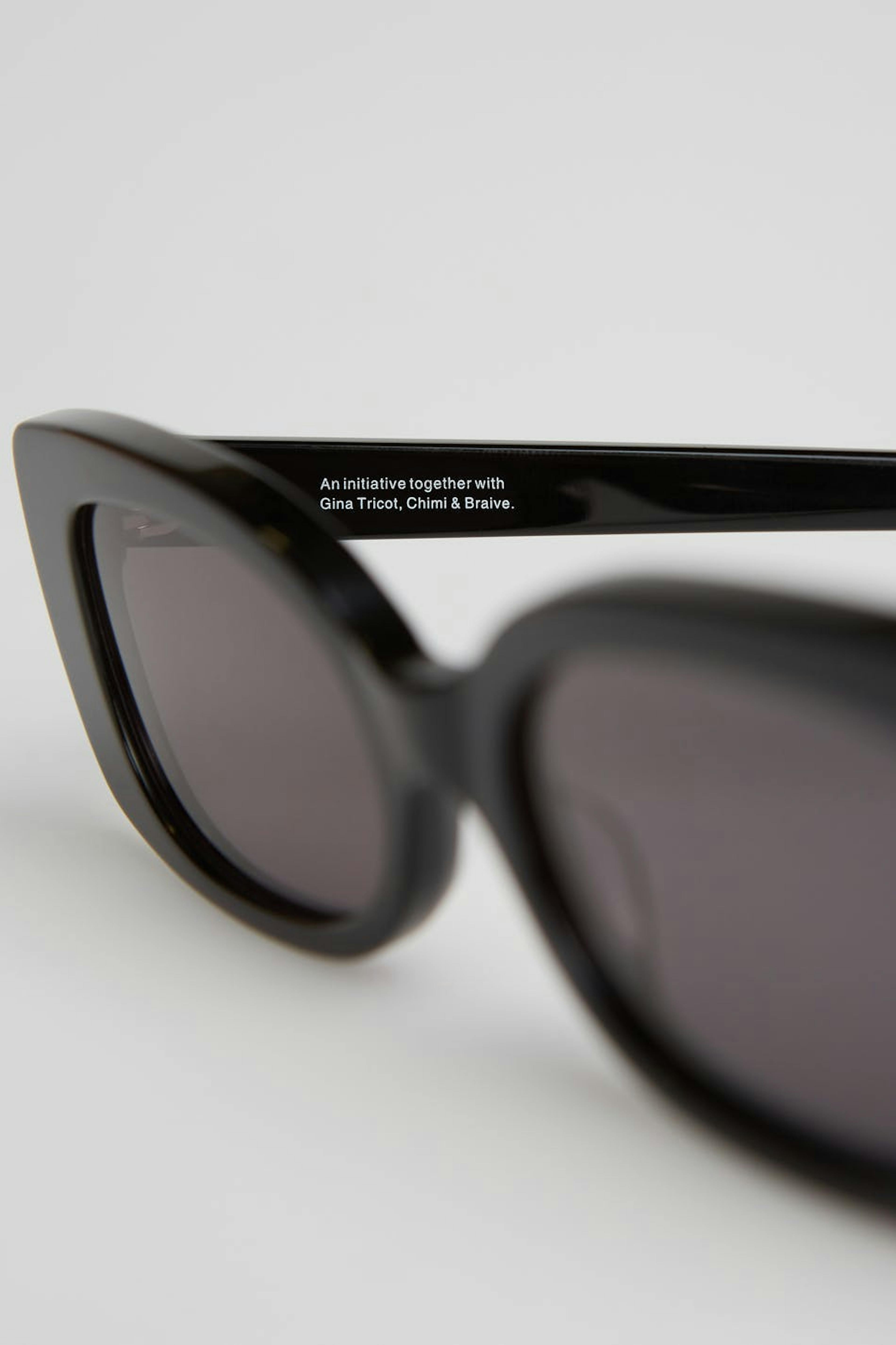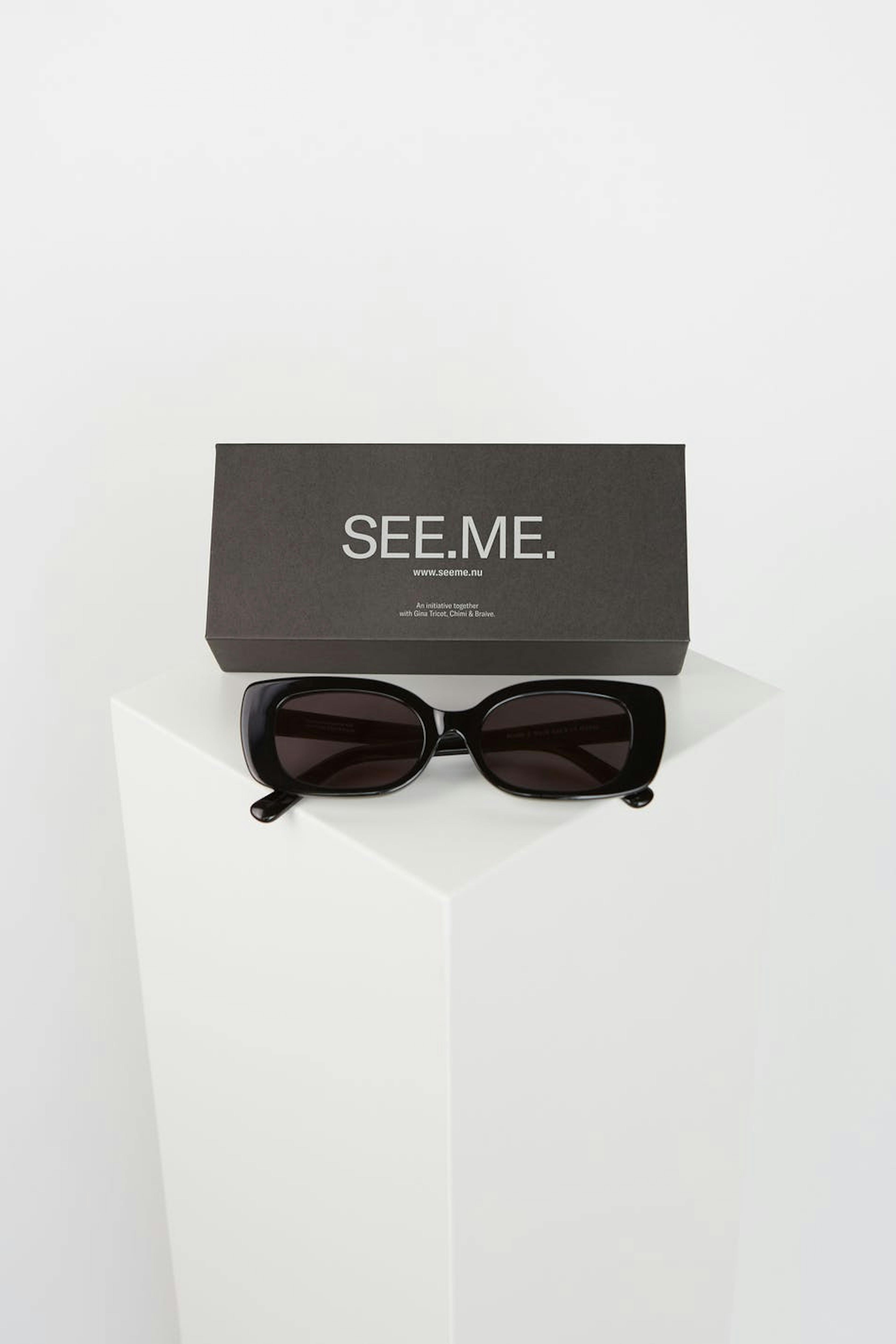 Chimi X Gina tricot. Zonnebrillen in samenwerking met Chimi & Braive. Vierkante zonnebrillen. De zonnebrillen zijn zwart.
