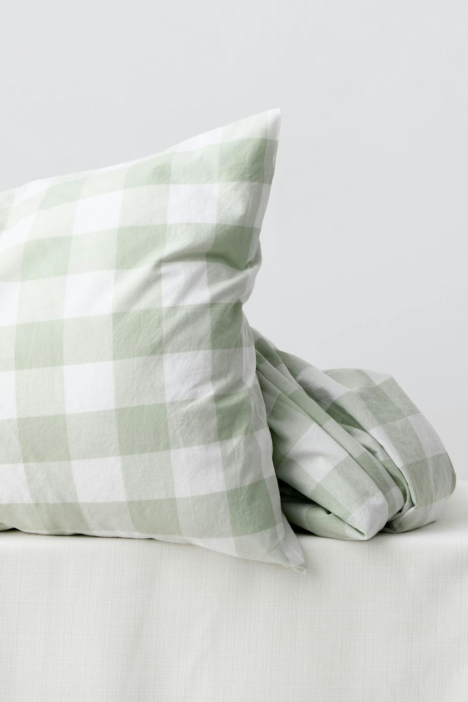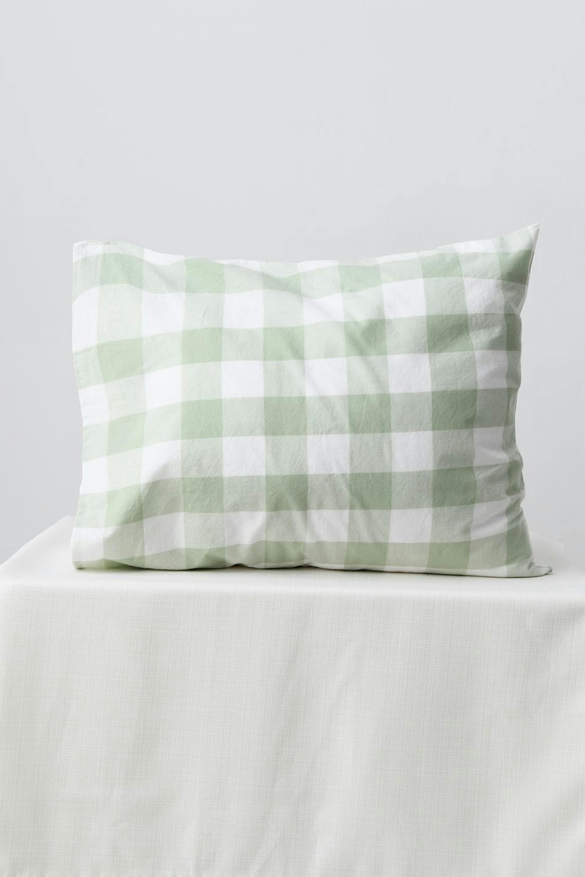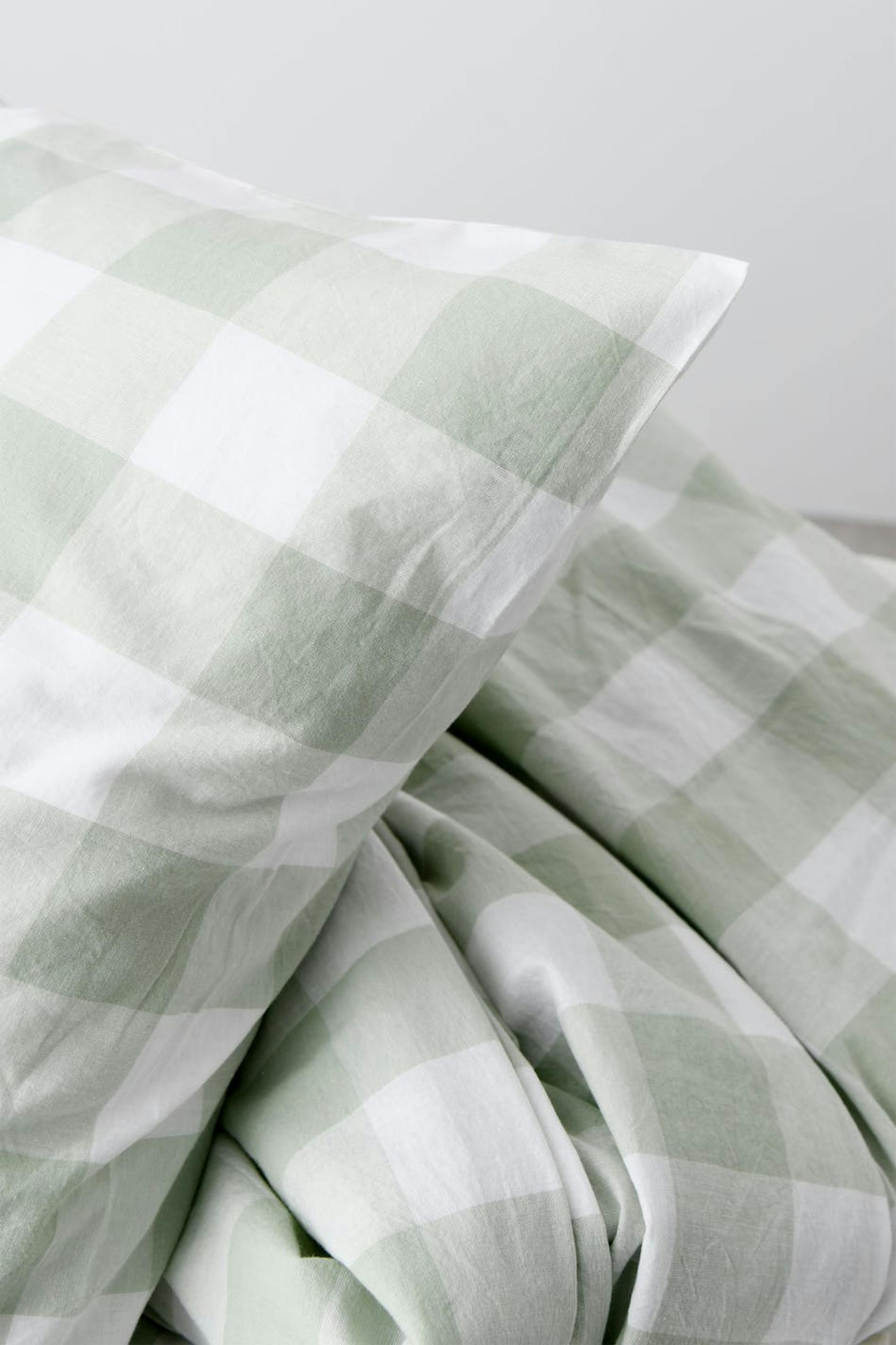 Geruite kussensloop van Gina Home van zacht katoen. De kussensloop is groen en wit.