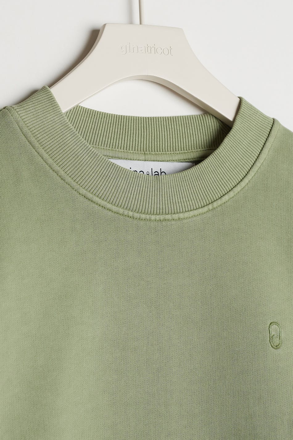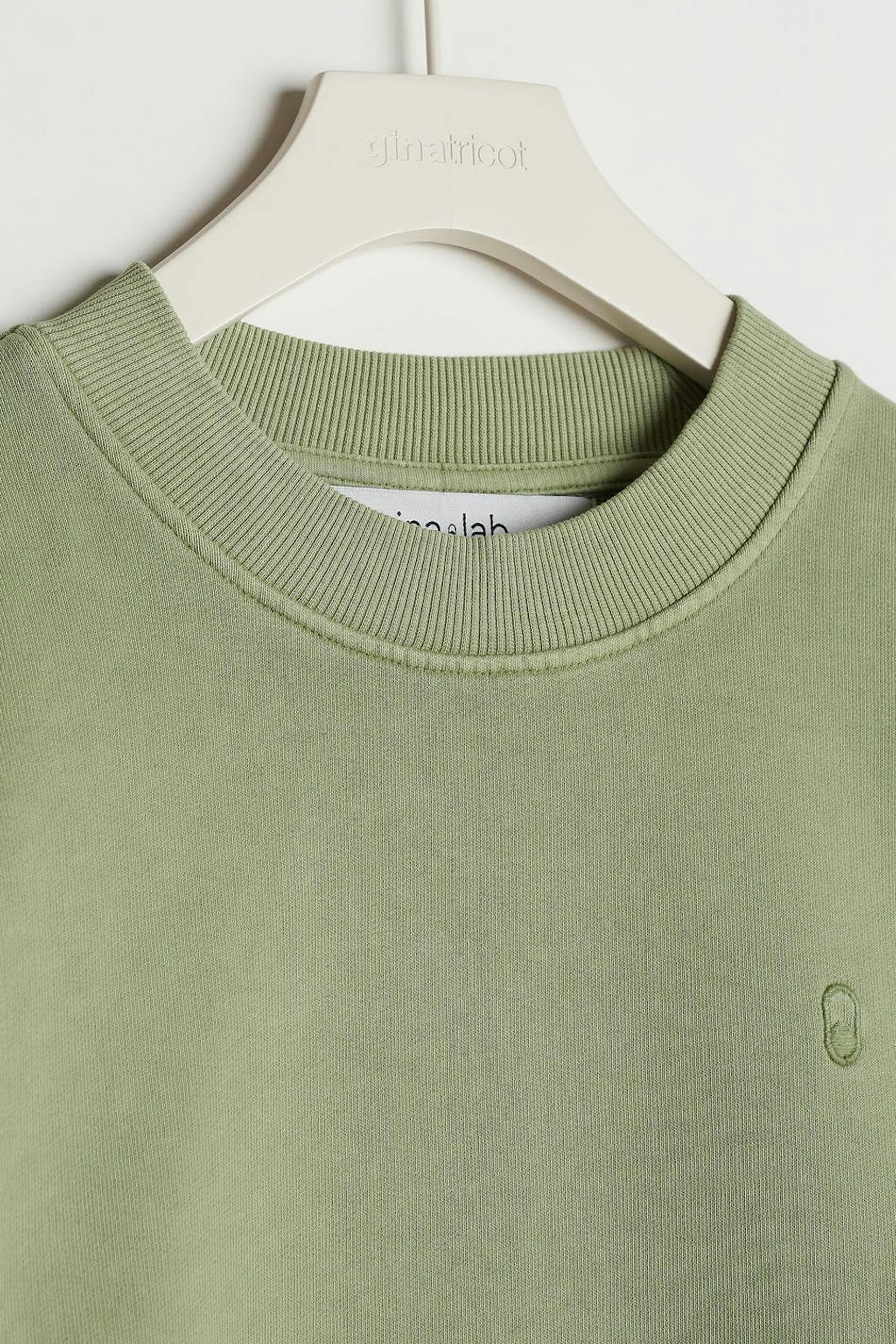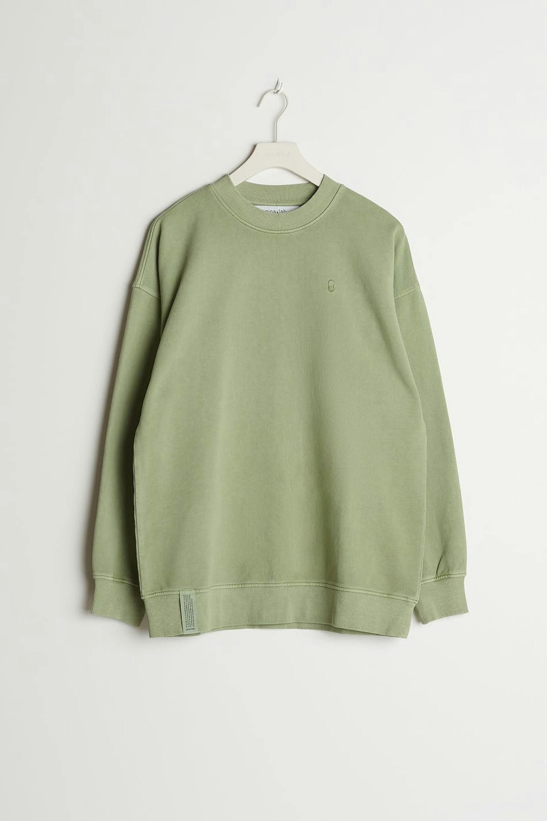 Unisex sweatshirt van Gina Lab met een overmaatse pasvorm. De sweatshirt is groen en genderneutraal en heeft een geribbelde manchet aan de uiteinden van de mouwen en in de onderste zoom. Het heeft een smalle en geborduurde logo op de borst. GOTS certified, Mineral dye.
