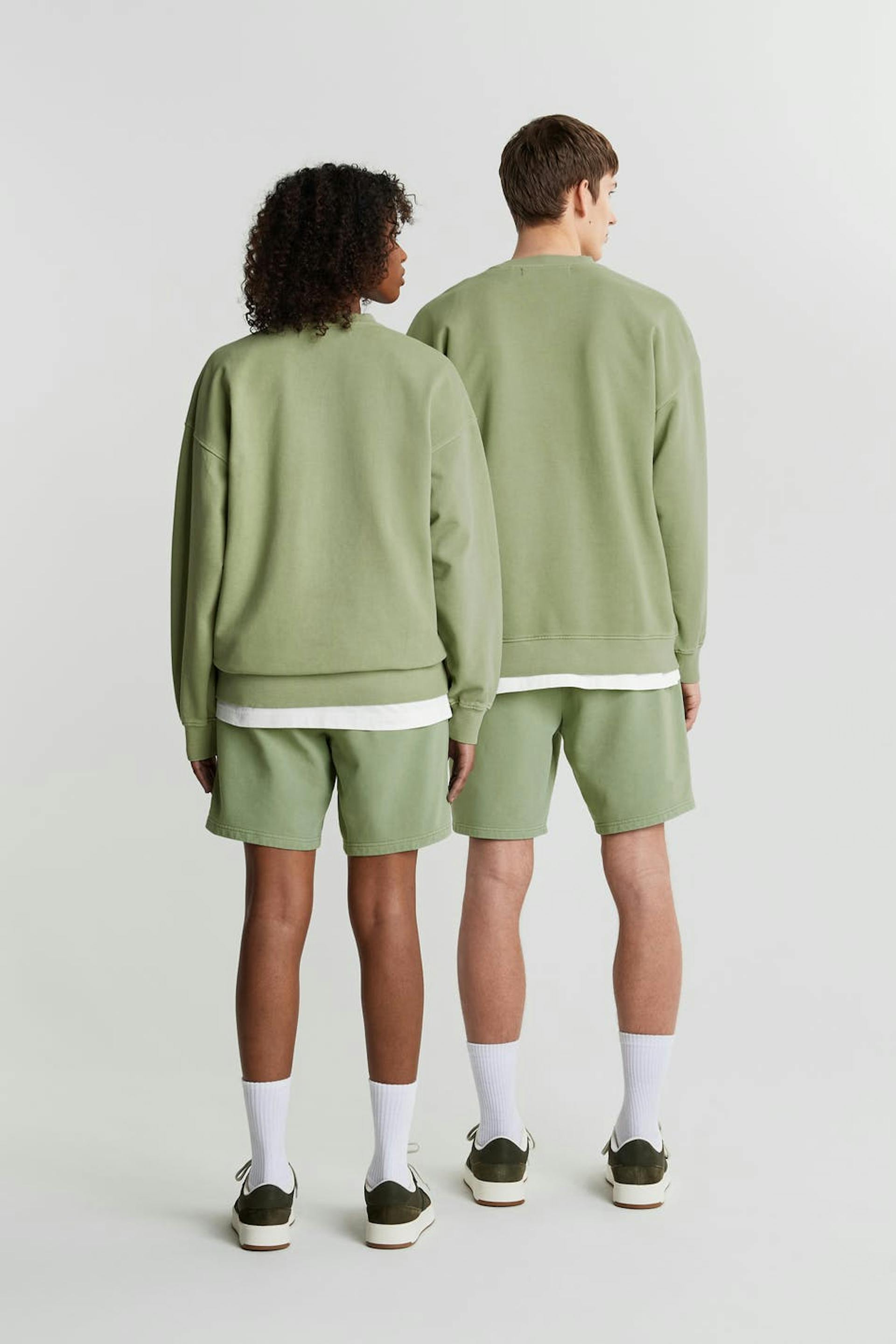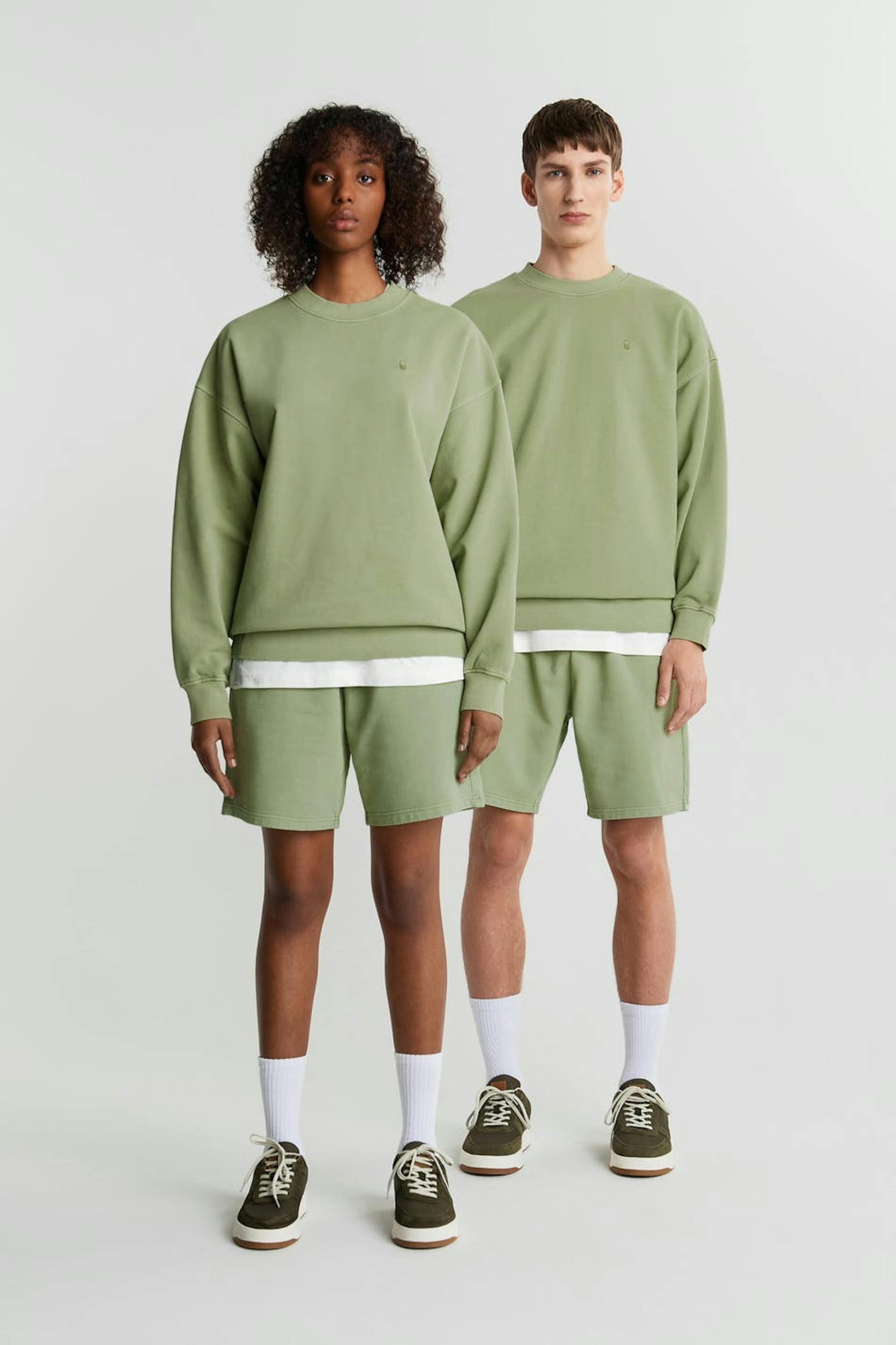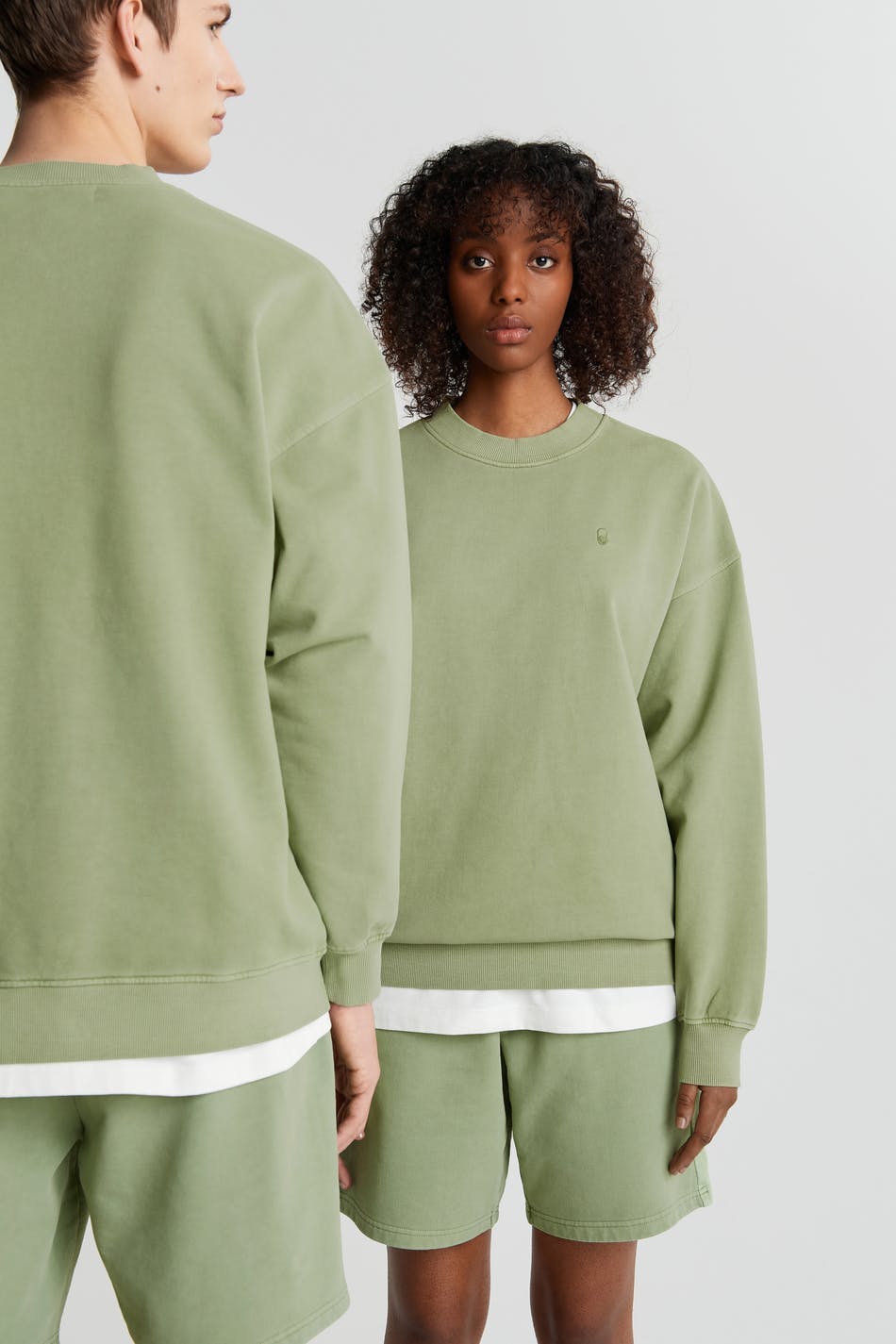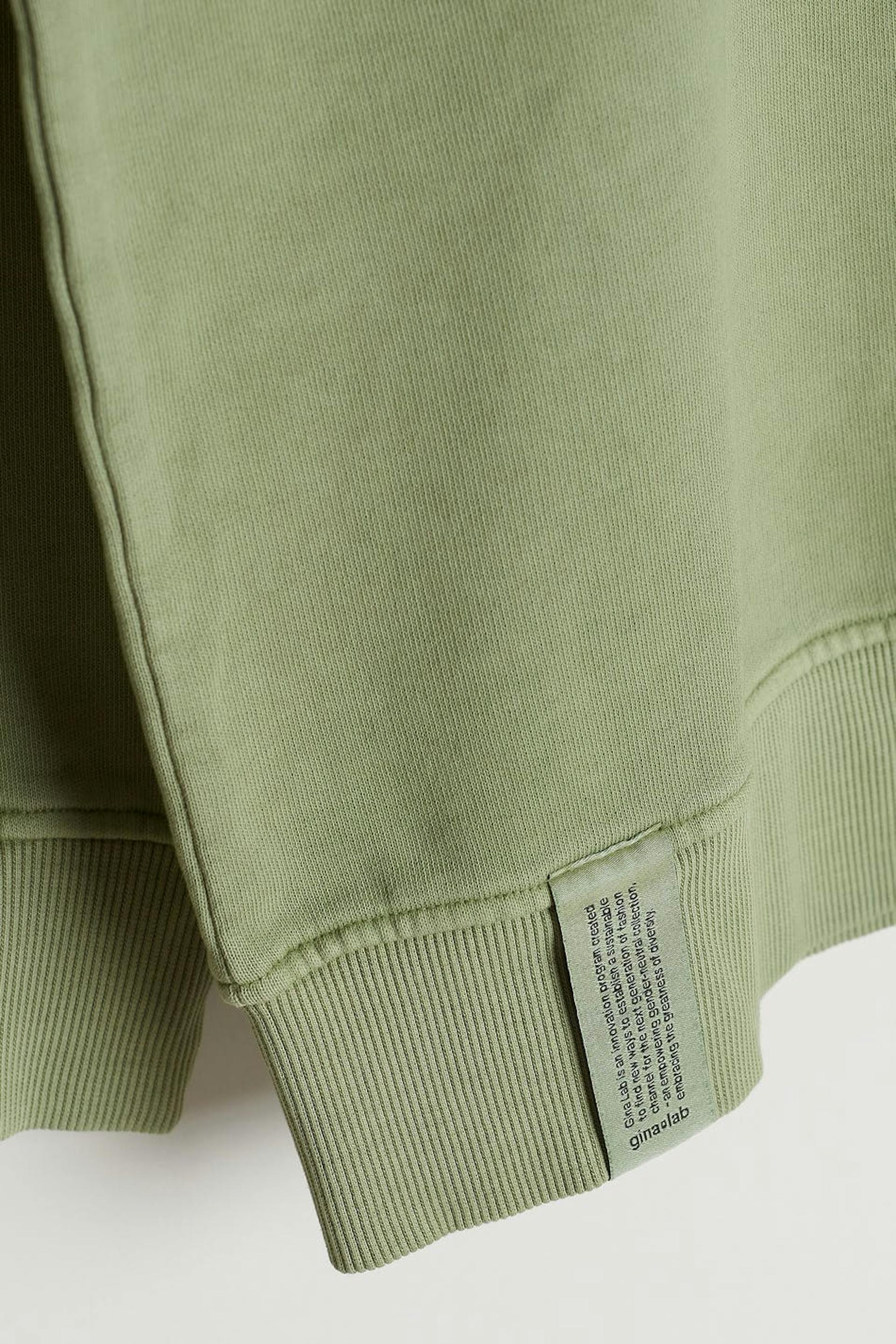 Unisex sweatshirt van Gina Lab met een overmaatse pasvorm. De sweatshirt is groen en genderneutraal en heeft een geribbelde manchet aan de uiteinden van de mouwen en in de onderste zoom. Het heeft een smalle en geborduurde logo op de borst. GOTS certified, Mineral dye.