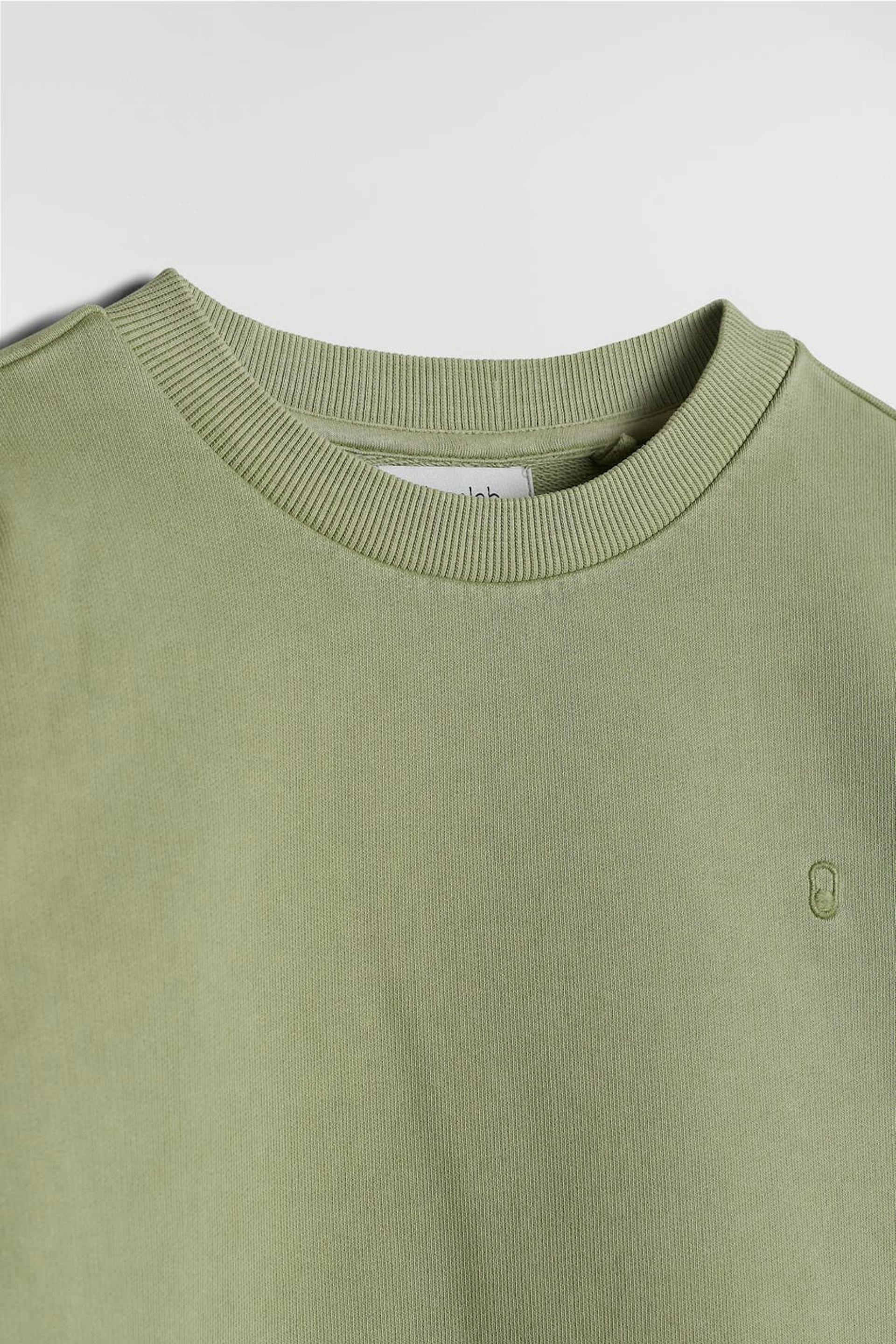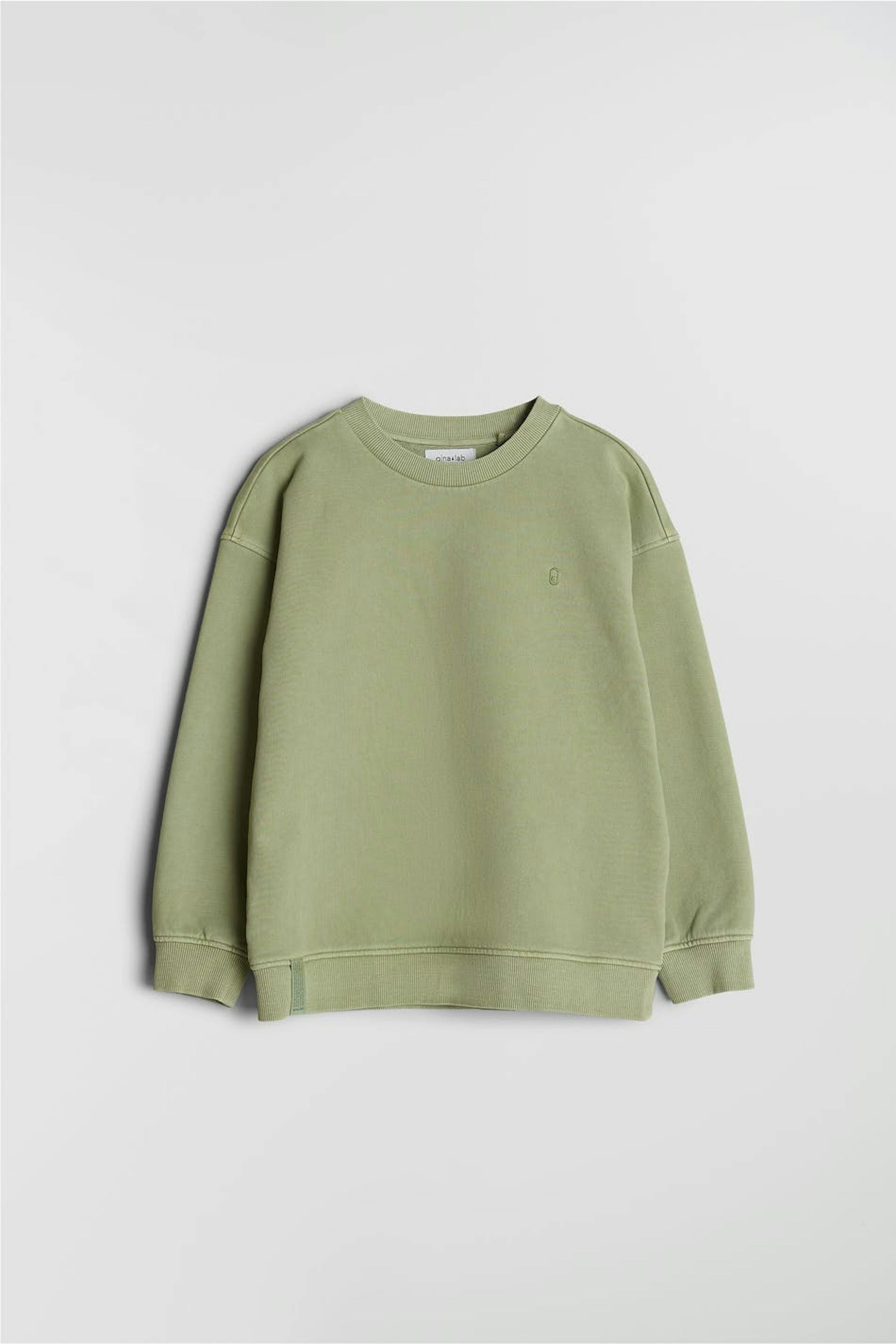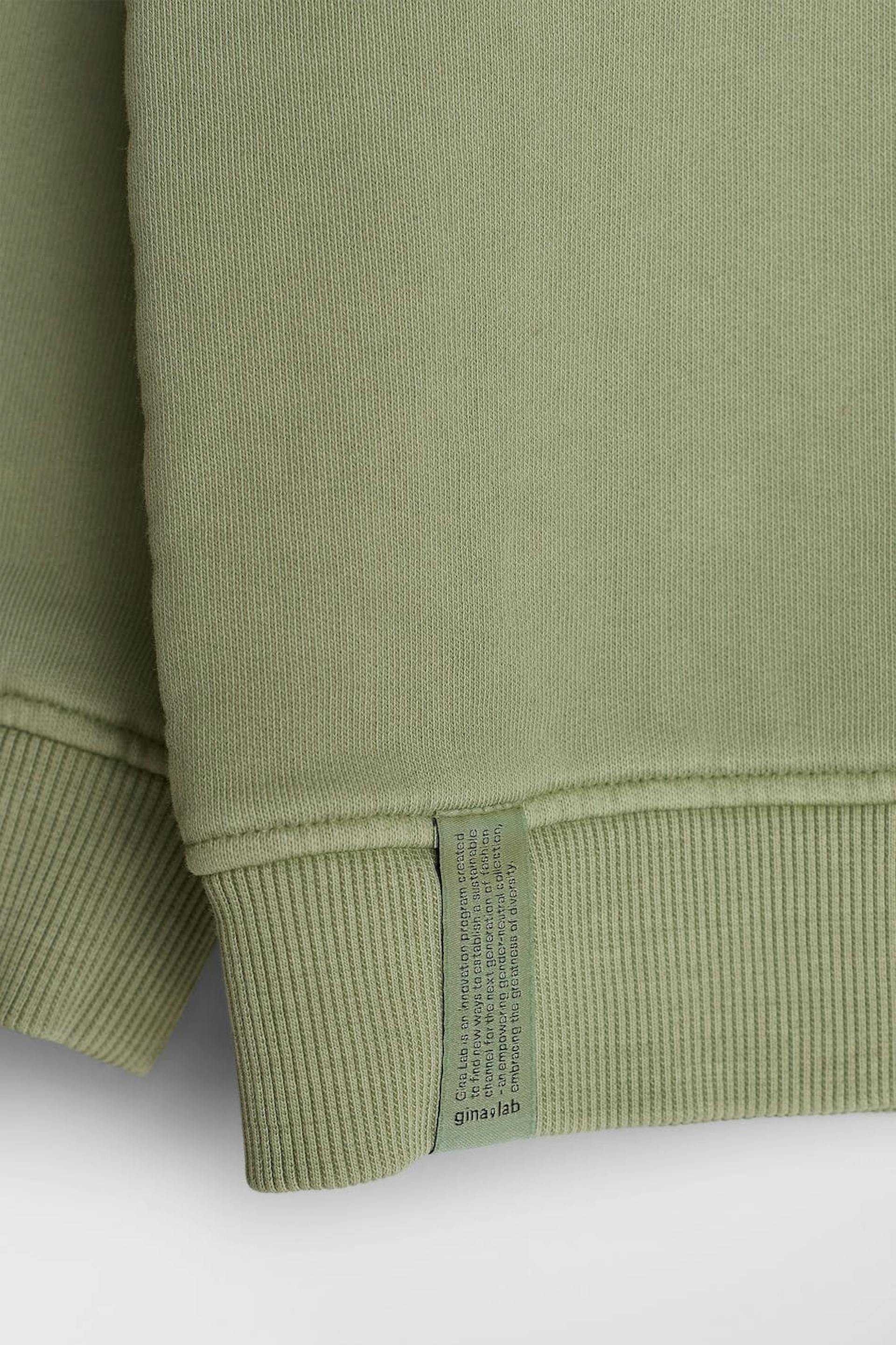 Unisex trui van Gina Lab voor kinderen met een geribbelde manchet aan de uiteinden van de mouwen en in de onderste zoom. De trui is groen en genderneutraal en heeft een smalle en geborduurde logo op de borst. GOTS certified.