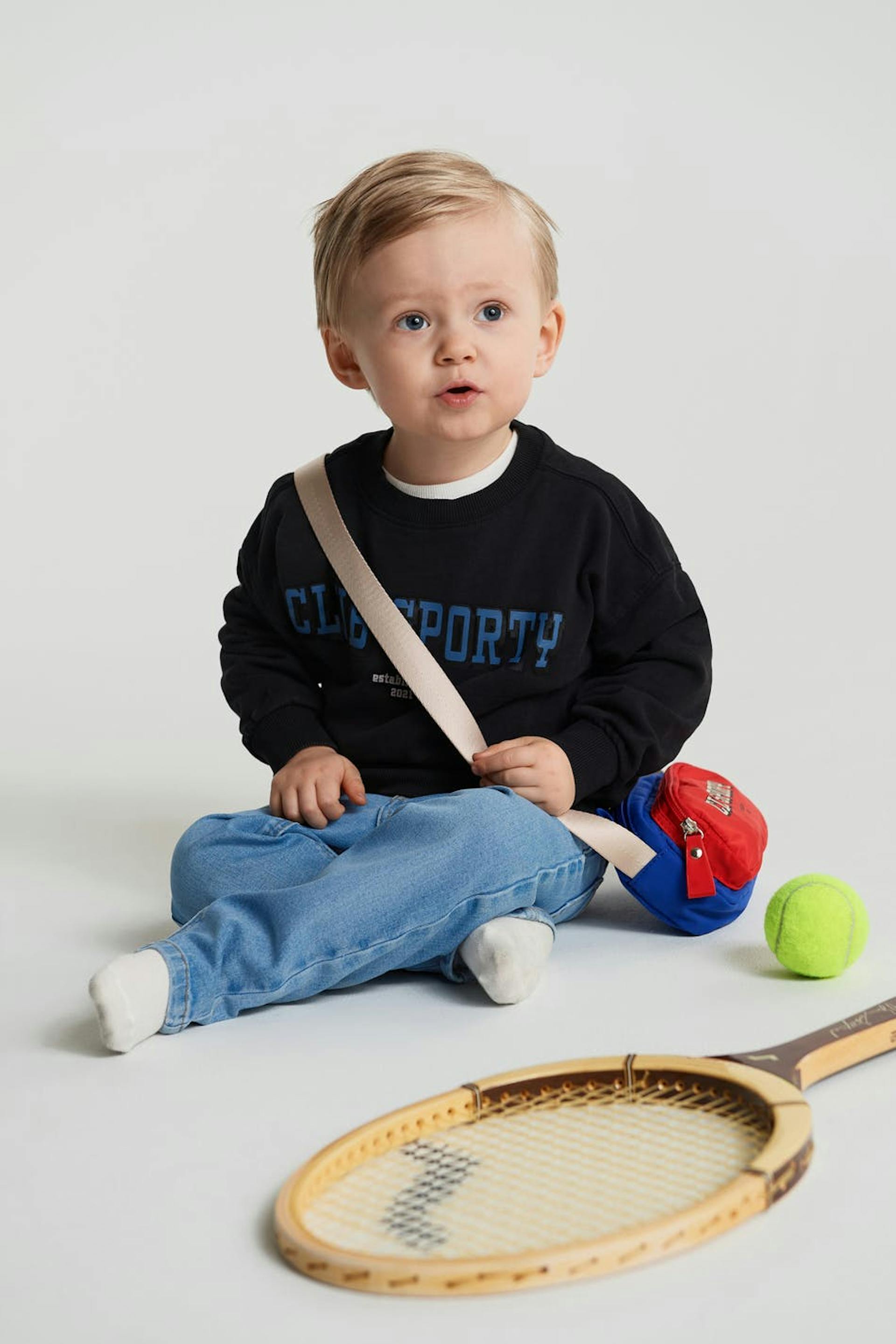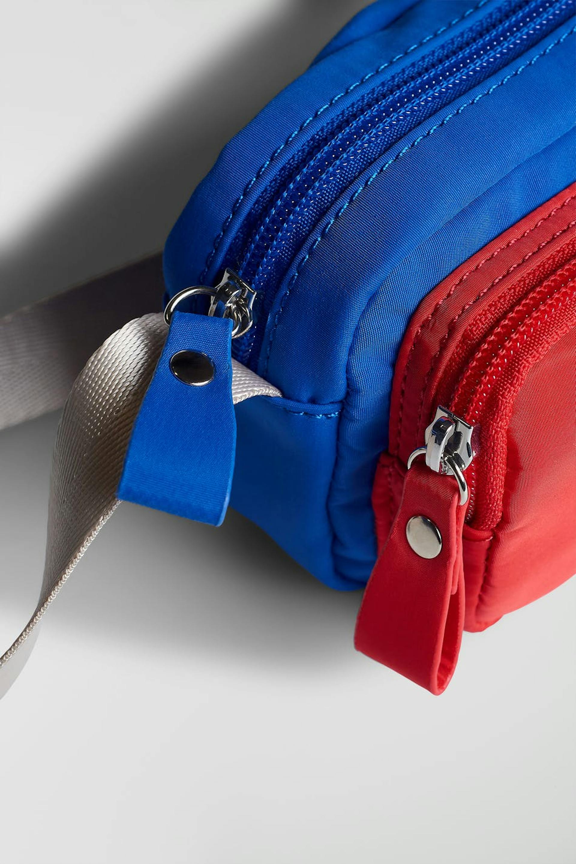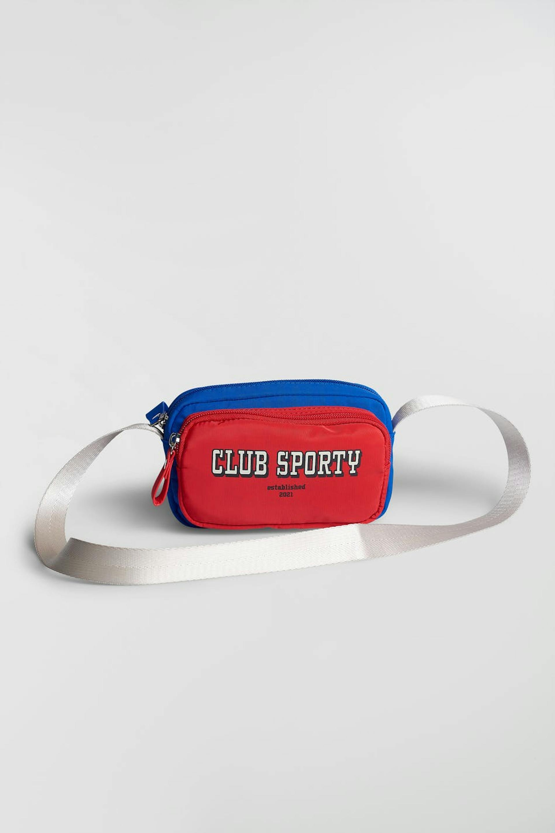Smalle schoudertas voor kinderen met een gedrukte tekst aan de voorkant. De tas is rood en blauw en heeft een verstelbare schouderband. Het heeft twee gedeeltes met een rits bovenop.