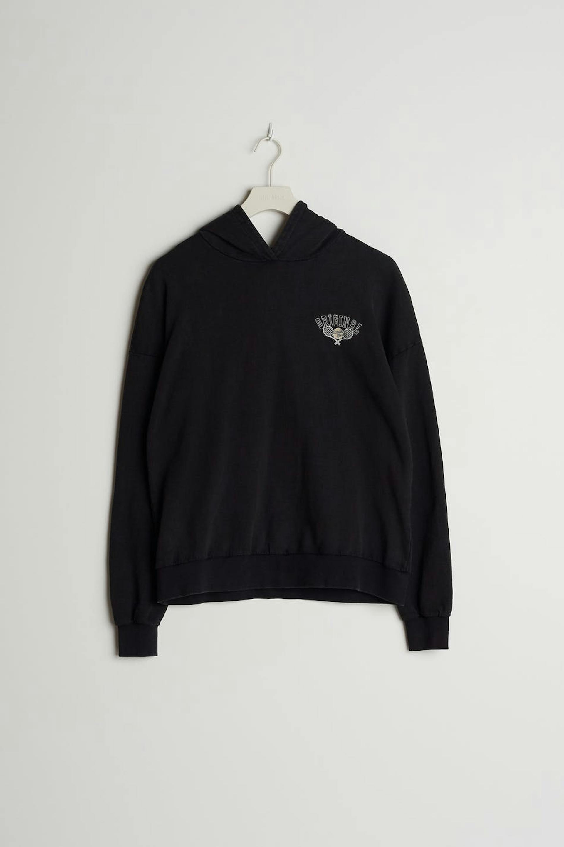 Unisex hoodie met een overmaatse pasvorm. De sweater is zwart en heeft een smalle print op de borst. Het heeft een geribbelde manchet aan de uiteinden van de mouwen en aan de zoom en een capuchon.