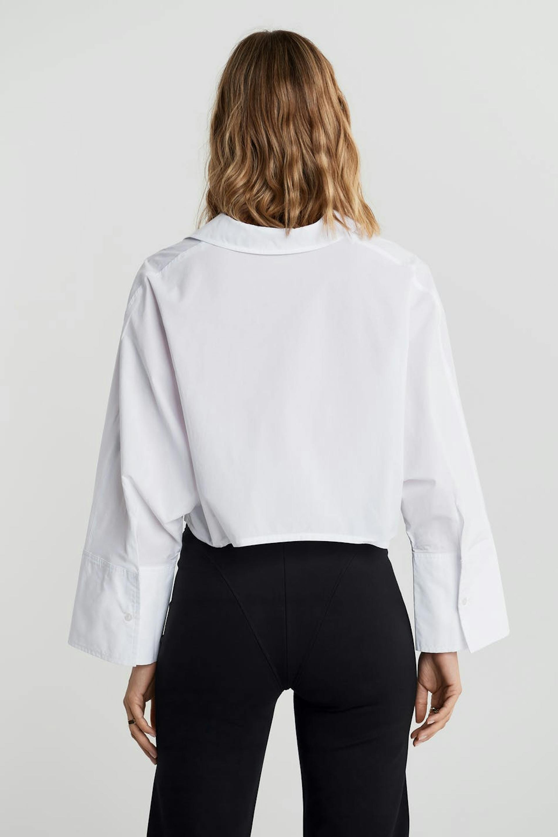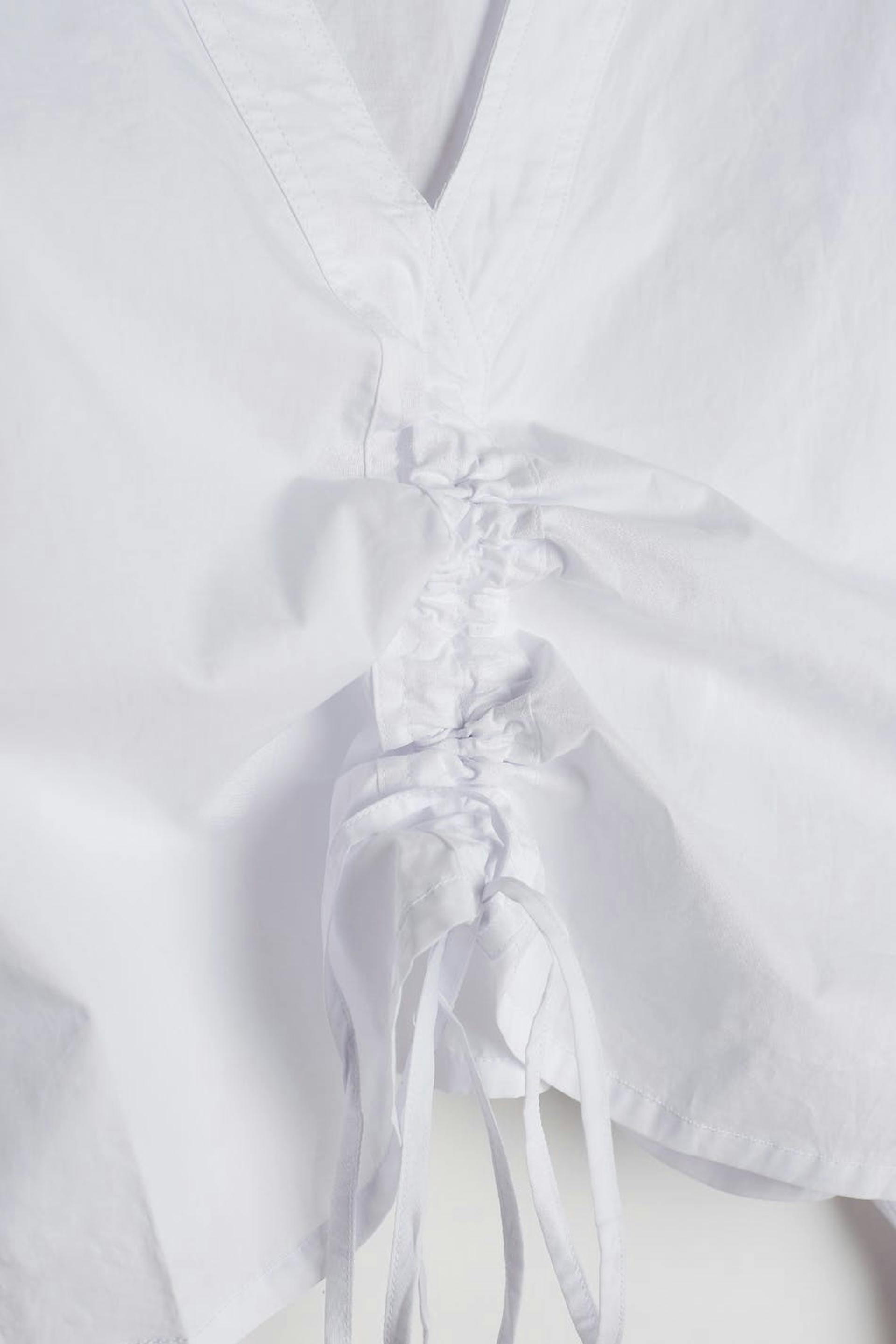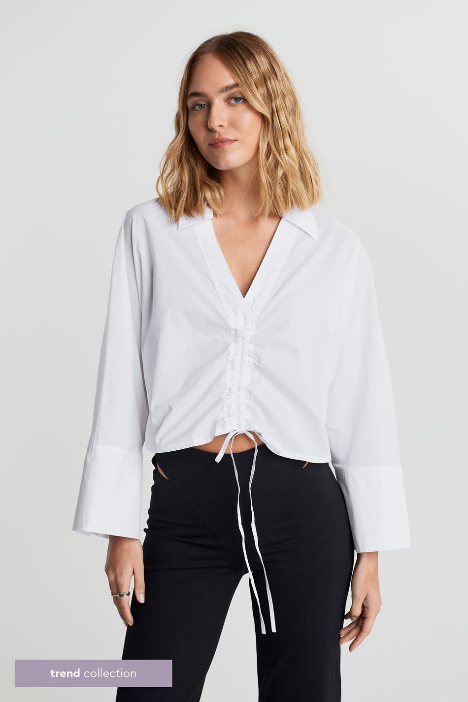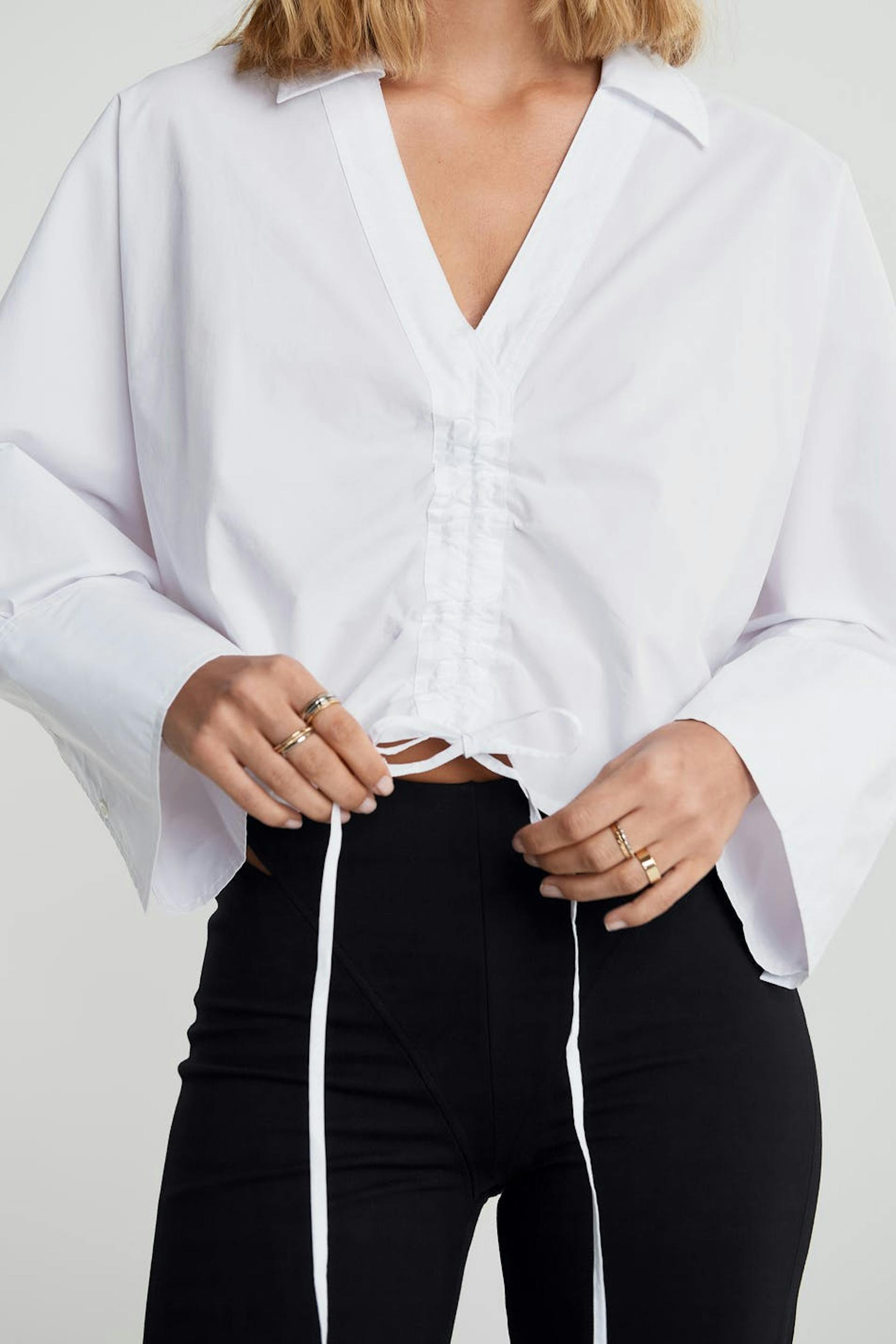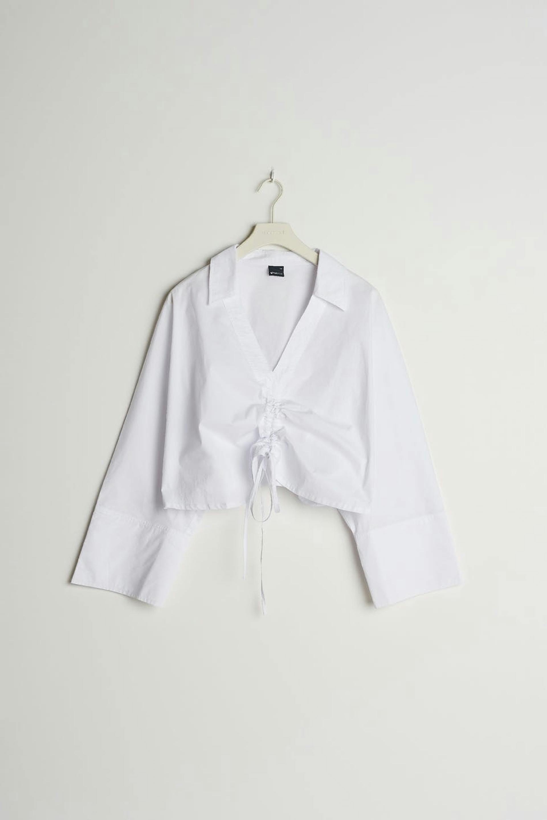 Afgesneden bloes met vergaring aan de voorkant met een trekkoord met een zelfbinder aan de zoom. De bloes is wit en heeft een v-necksnit. Het heeft lange en brede mouwen en een kraag.