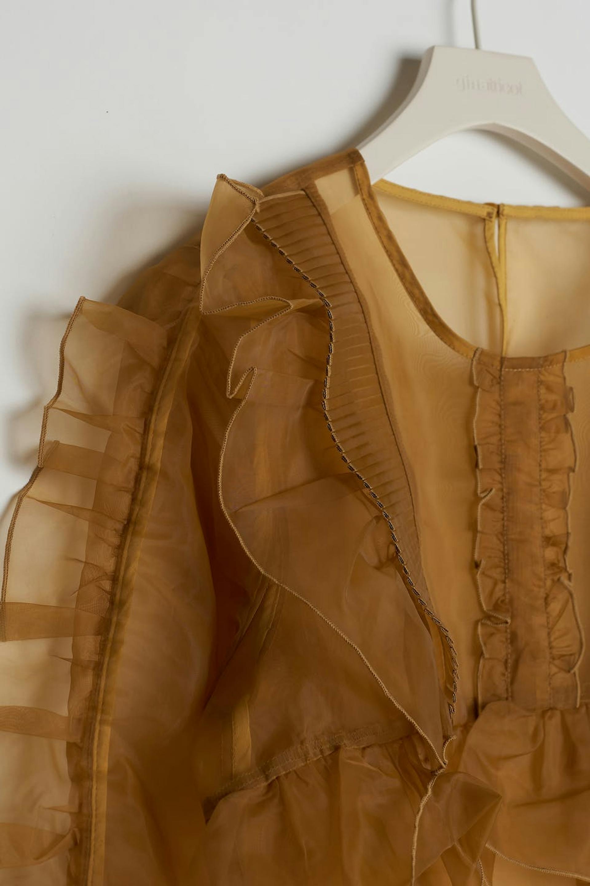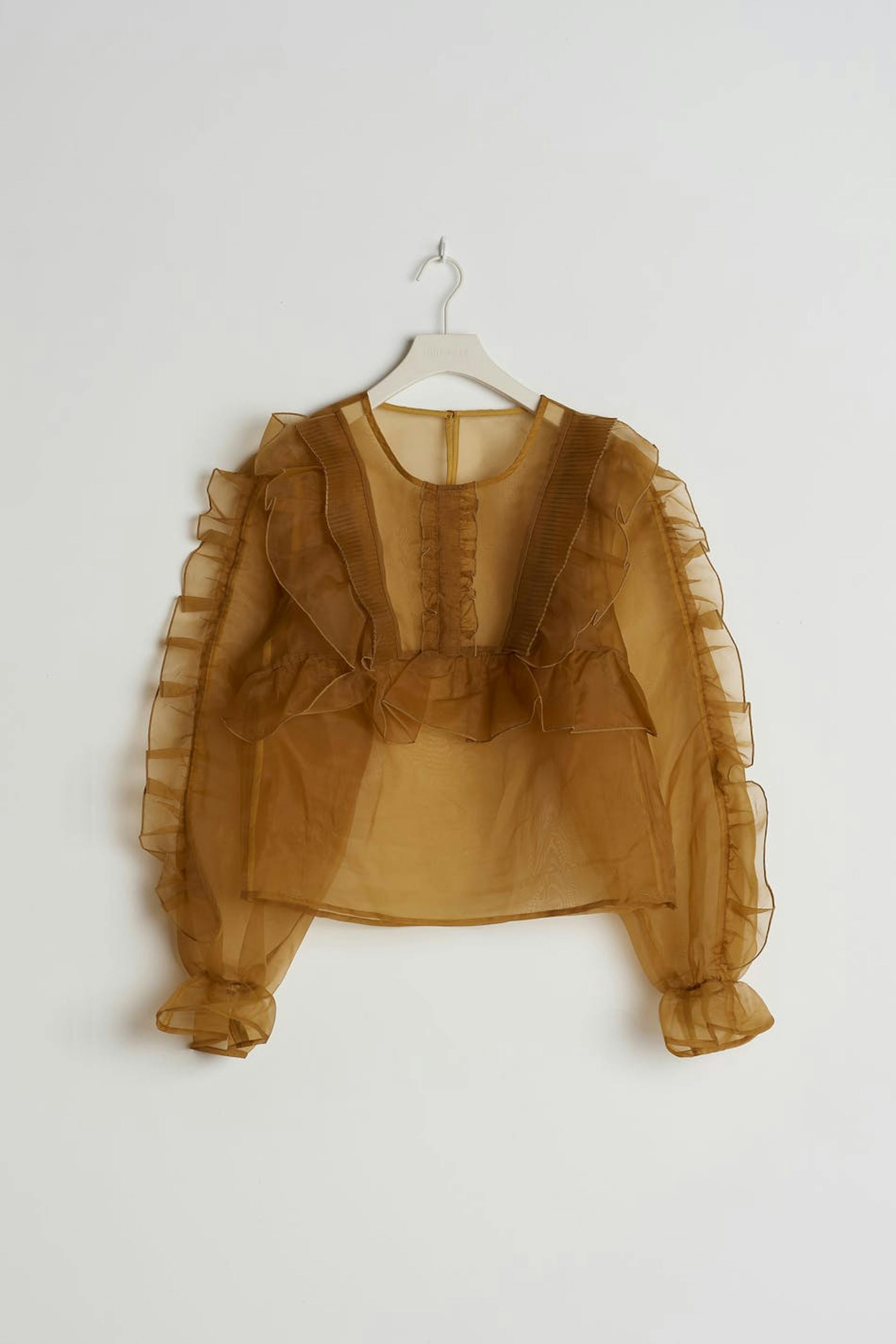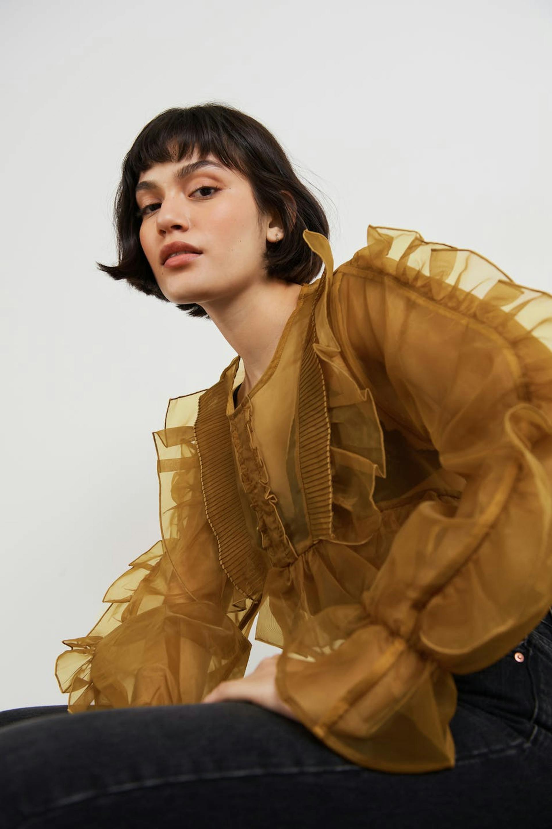 Volumineuze bloes met ruches aan de voorkant en langs beide mouwen. De bloes is geel en heeft een luchtig geweven stof. Het heeft een knooppas achter.