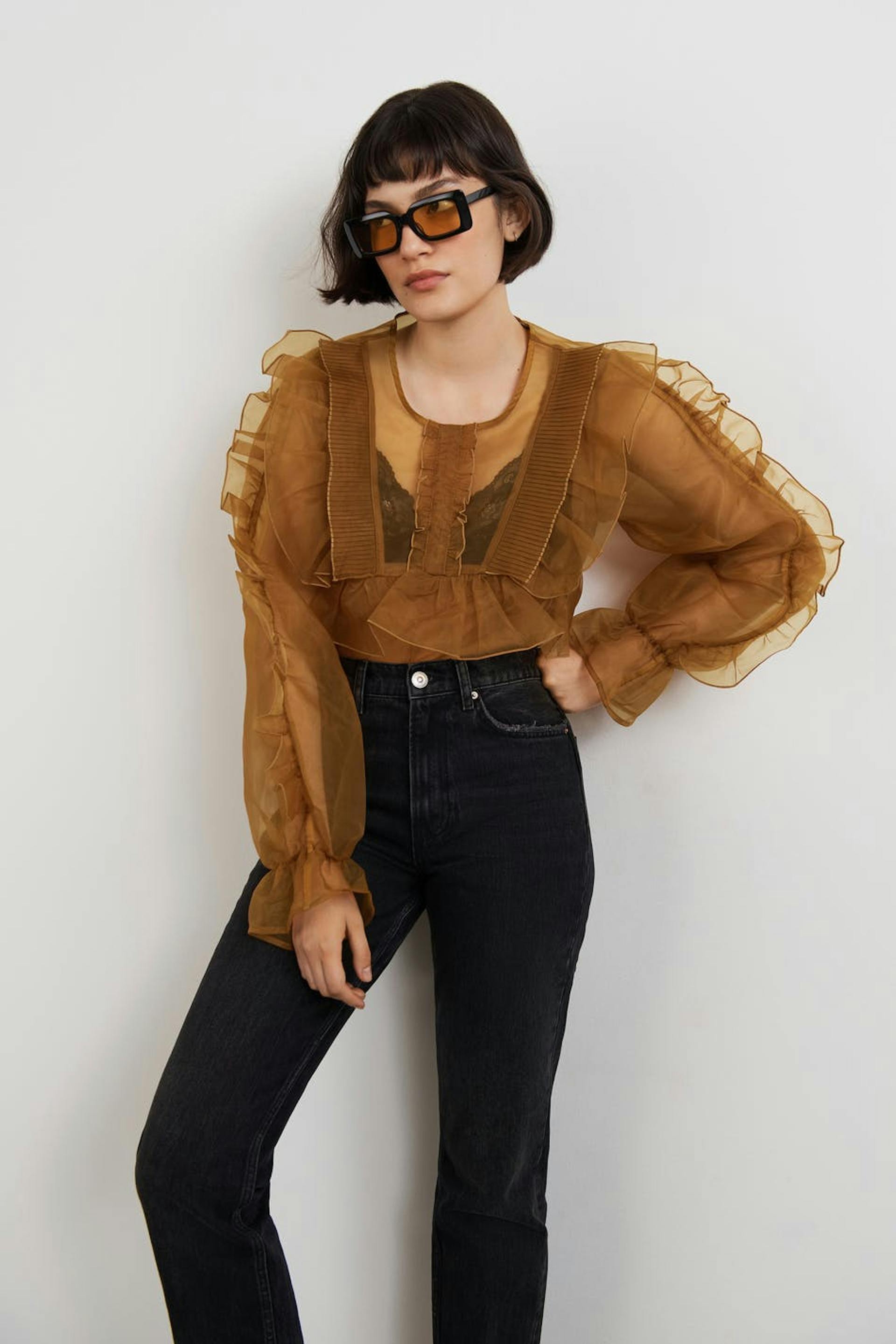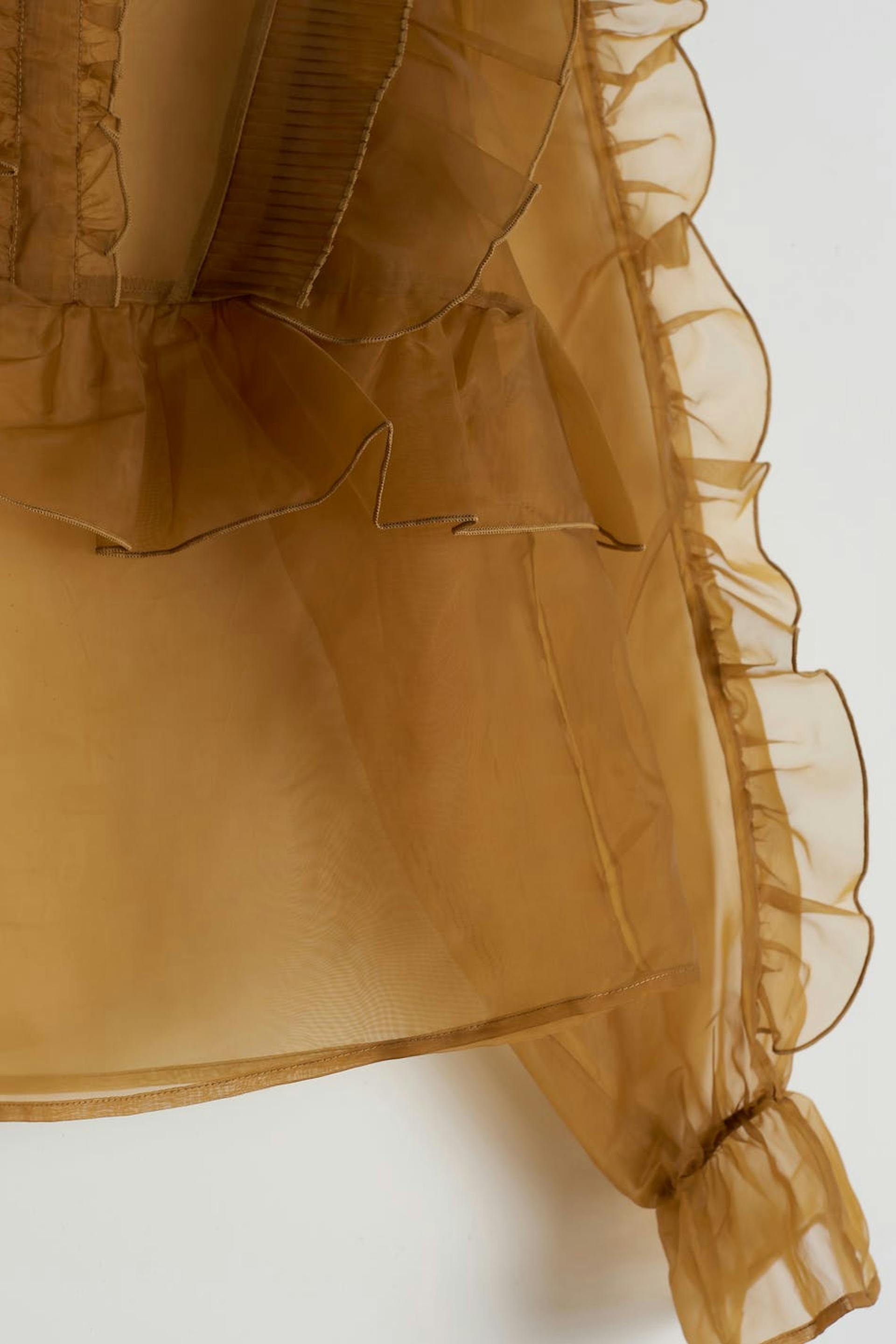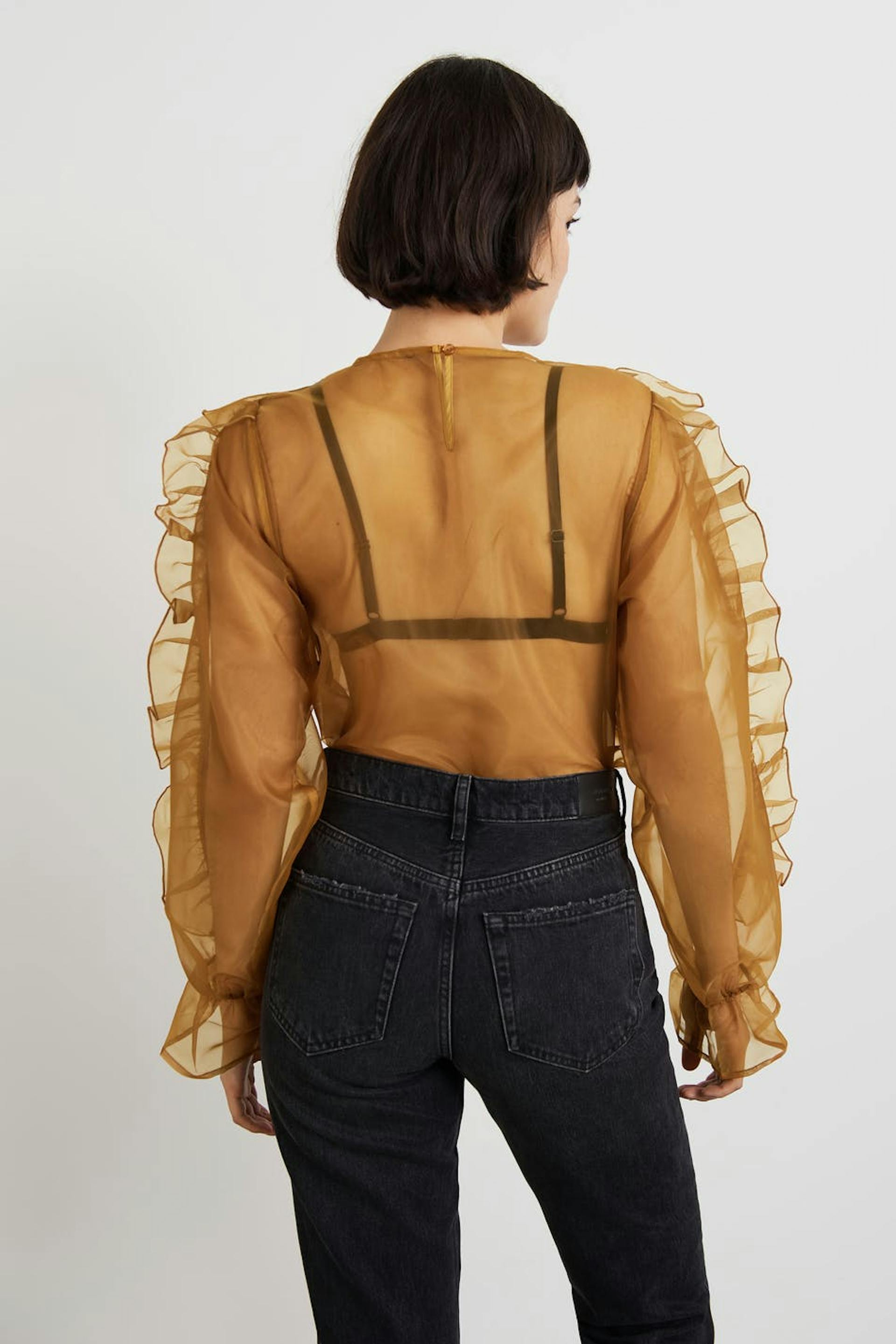 Volumineuze bloes met ruches aan de voorkant en langs beide mouwen. De bloes is geel en heeft een luchtig geweven stof. Het heeft een knooppas achter.
