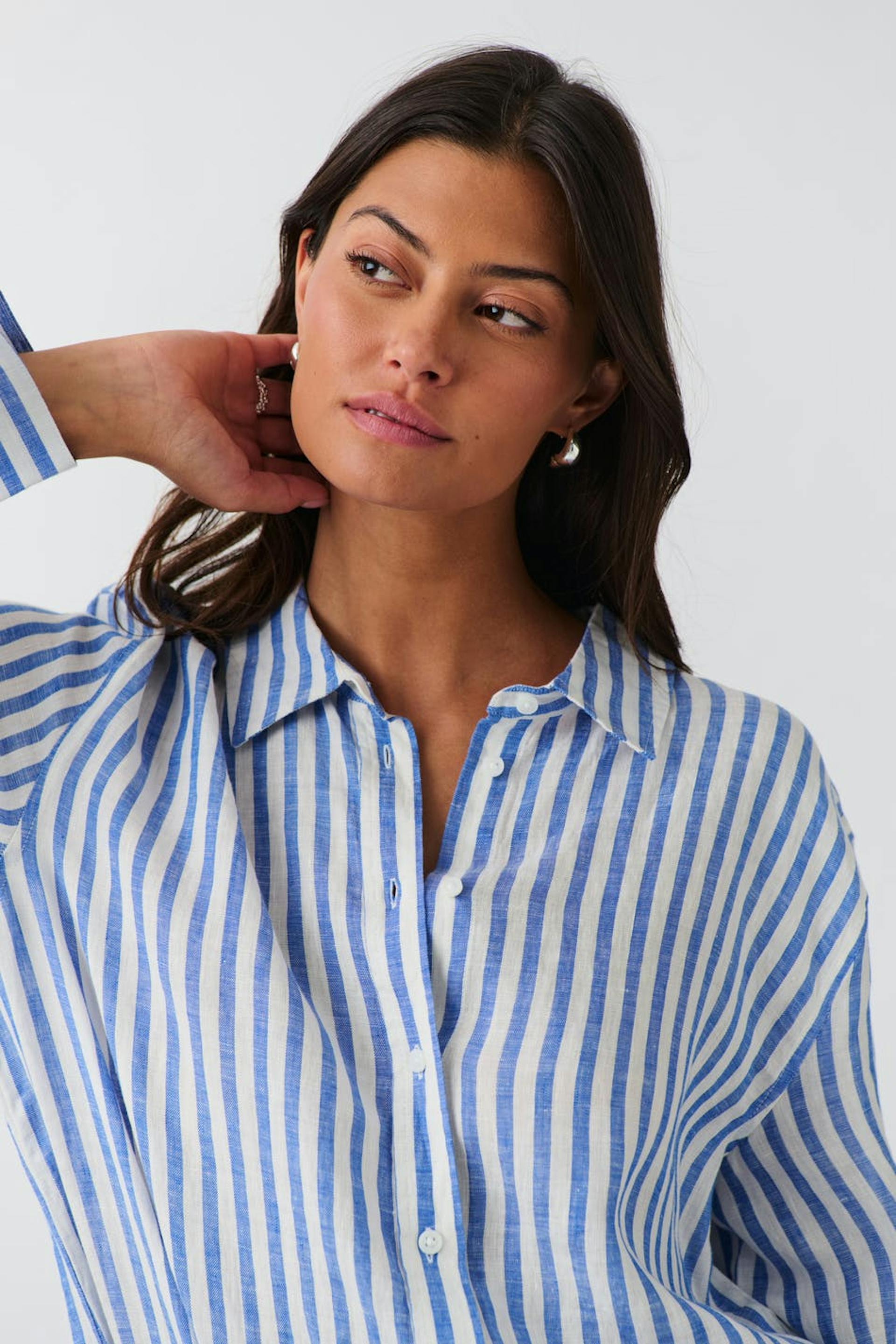Gestreept linnen shirt met overmaatse pasvorm. Het hemd is blauw en heeft dichtknopen aan de voorkant. Het heeft kraag, juk met plooien op het achterpand en lange mouw met knop en manchet.