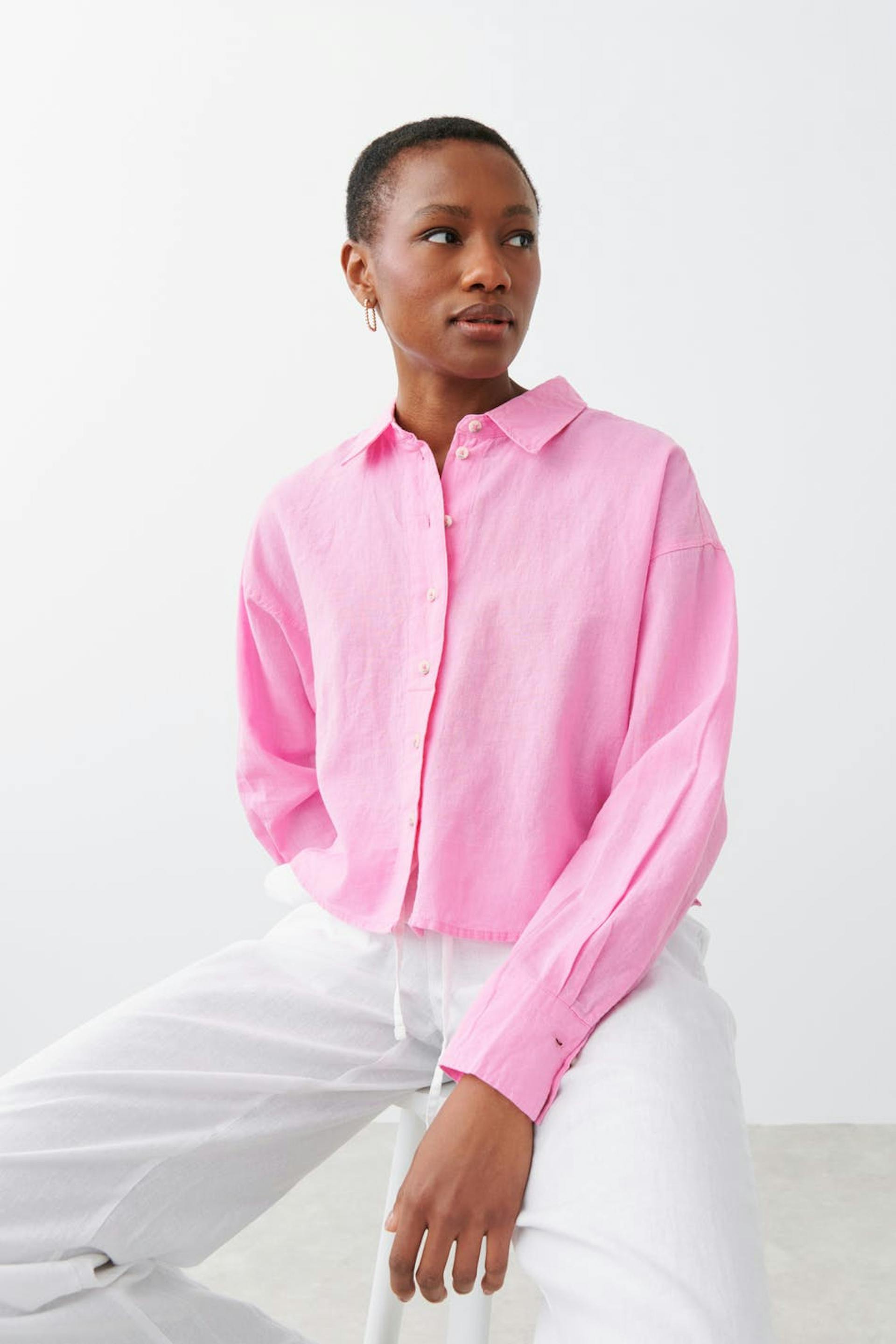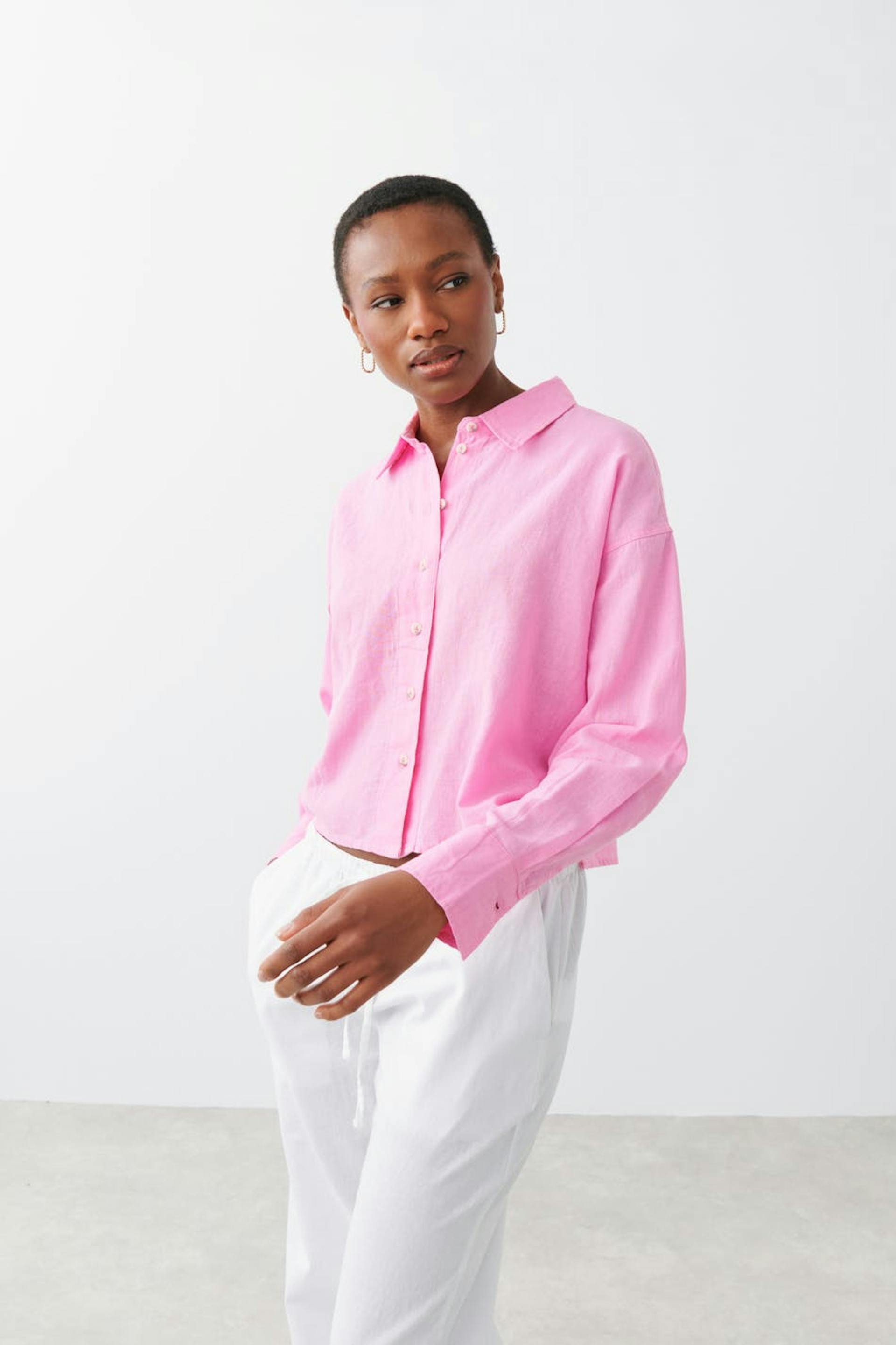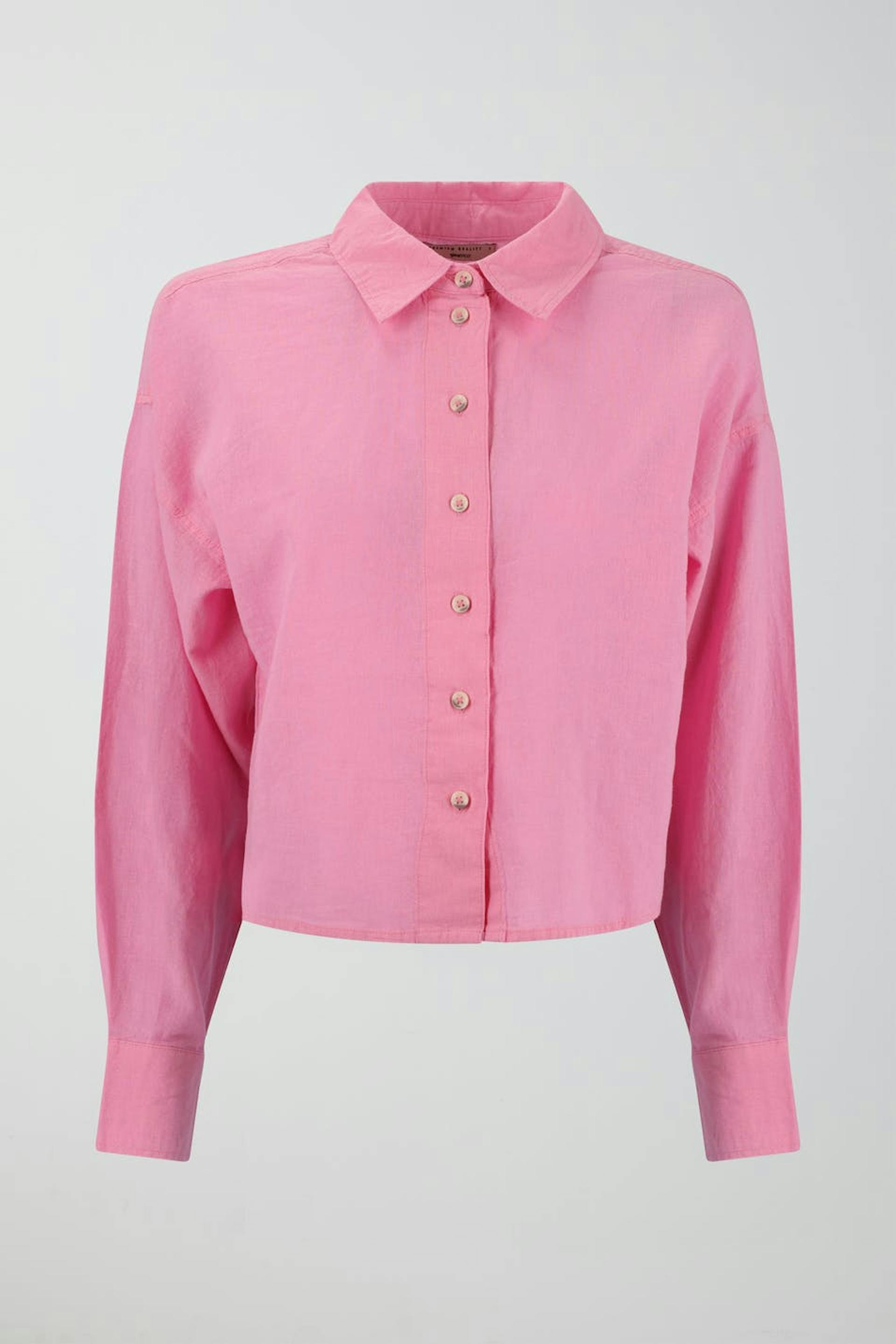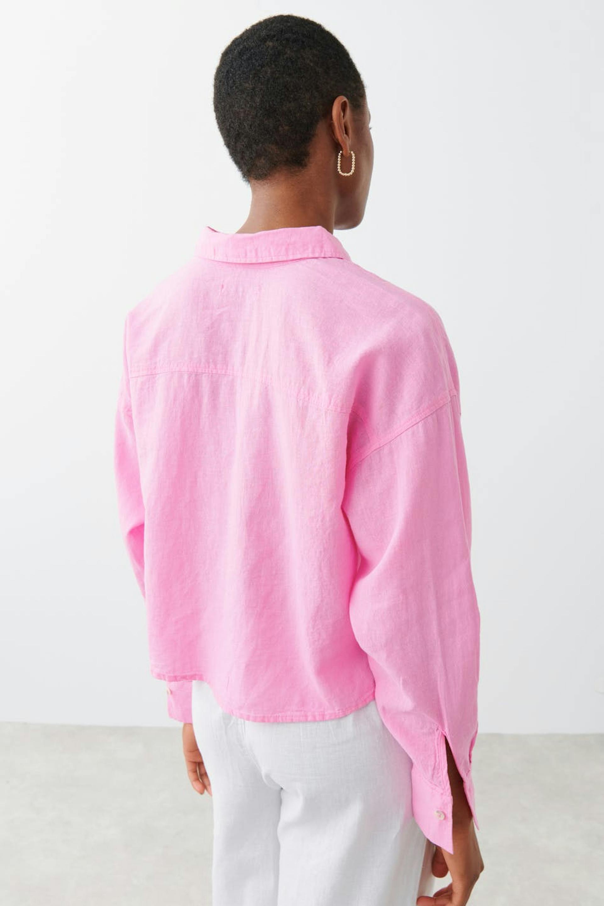 Afgesneden linnen shirt met relaxte pasvorm. Het hemd is roze, gevlochten en met lange mouwen. Het heeft kraag, knooppas aan de voorkant en lange mouw met knop en manchet.