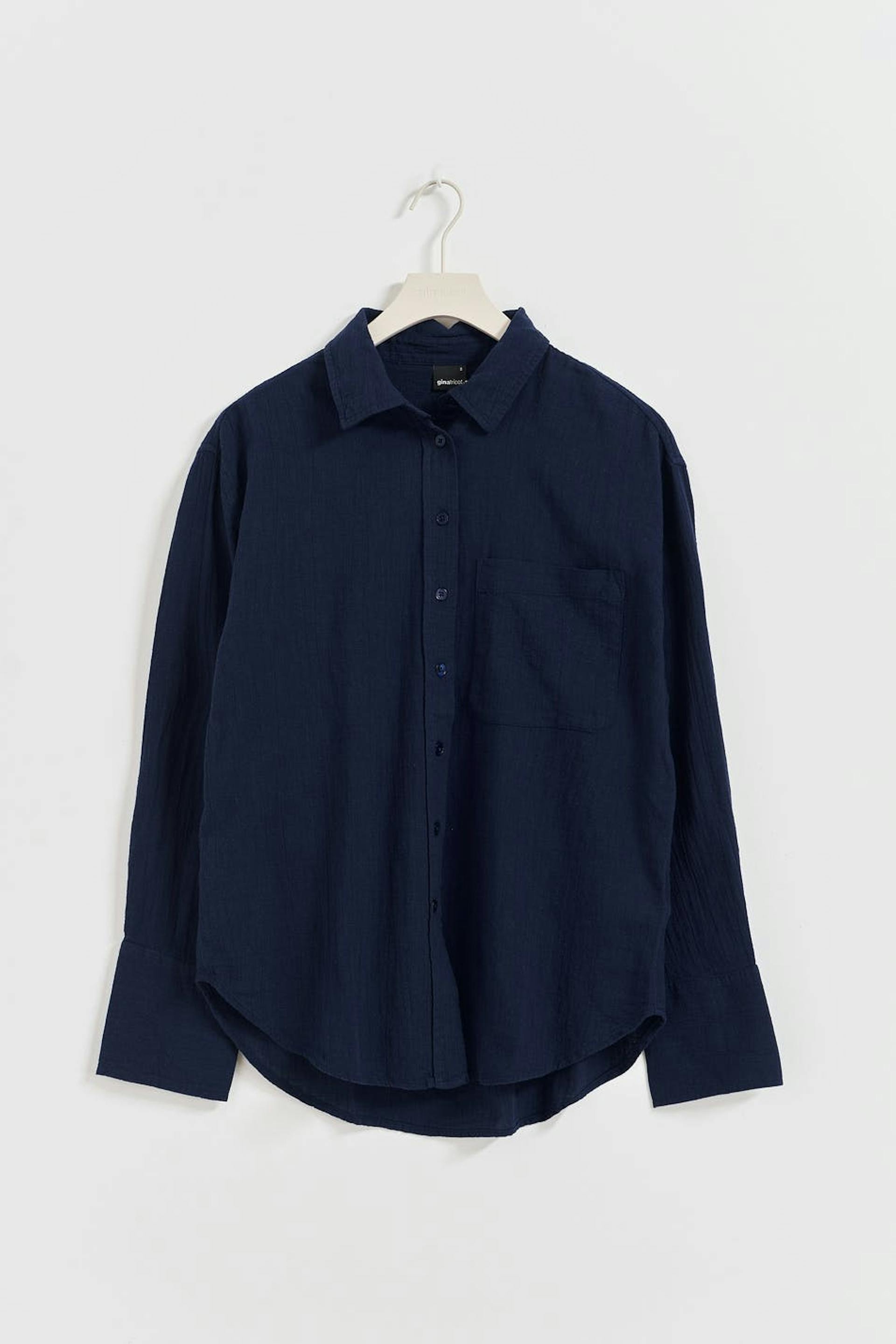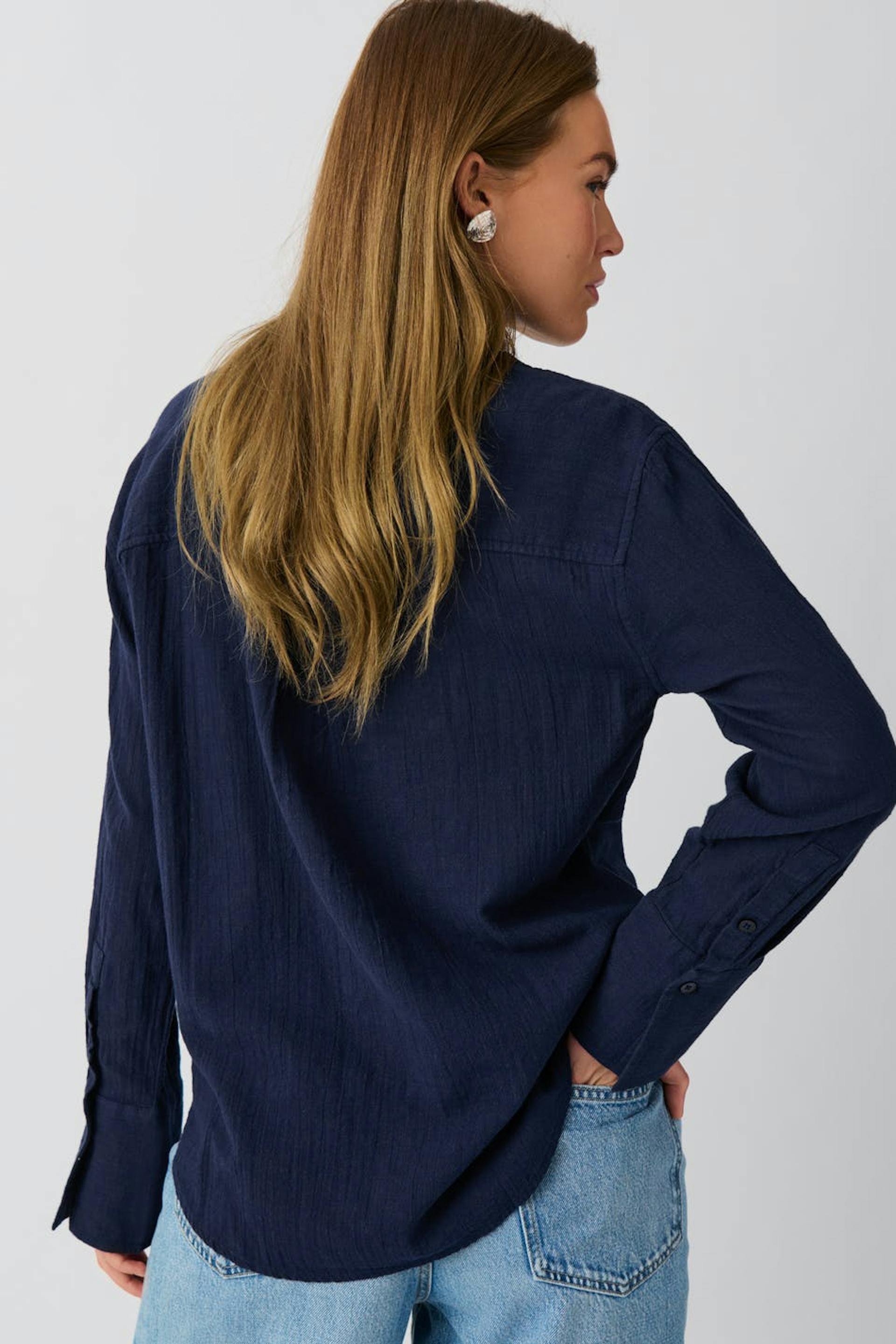 Hemd van katoen met overmaatse pasvorm. Het hemd is marine en heeft dichtknopen aan de voorkant. Het heeft borstzak, kraag, juk met plooien op het achterpand en lange mouw met knop en manchet.