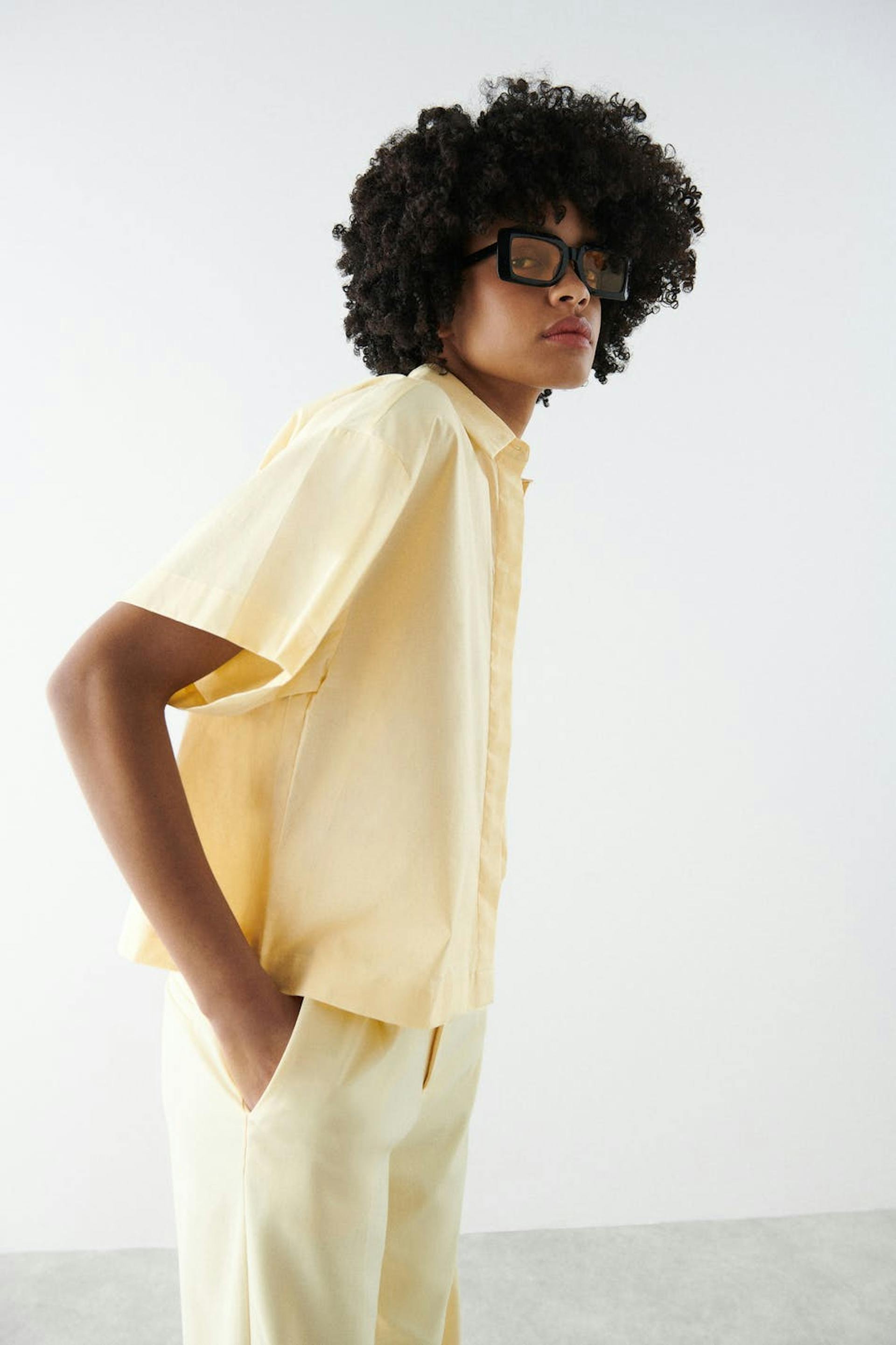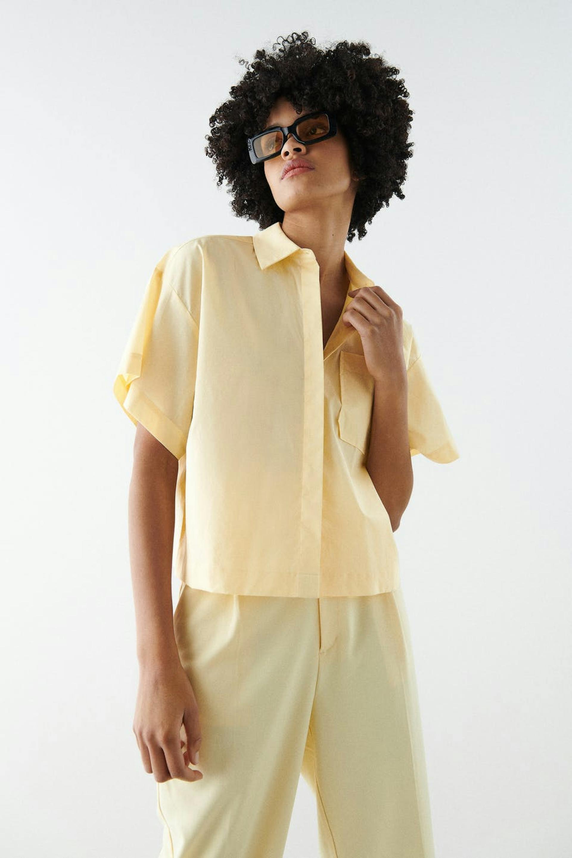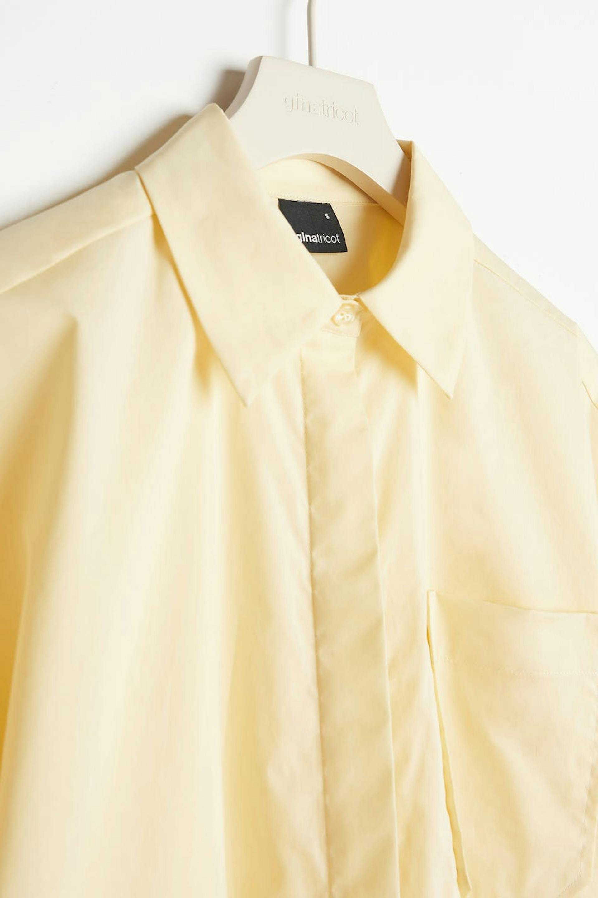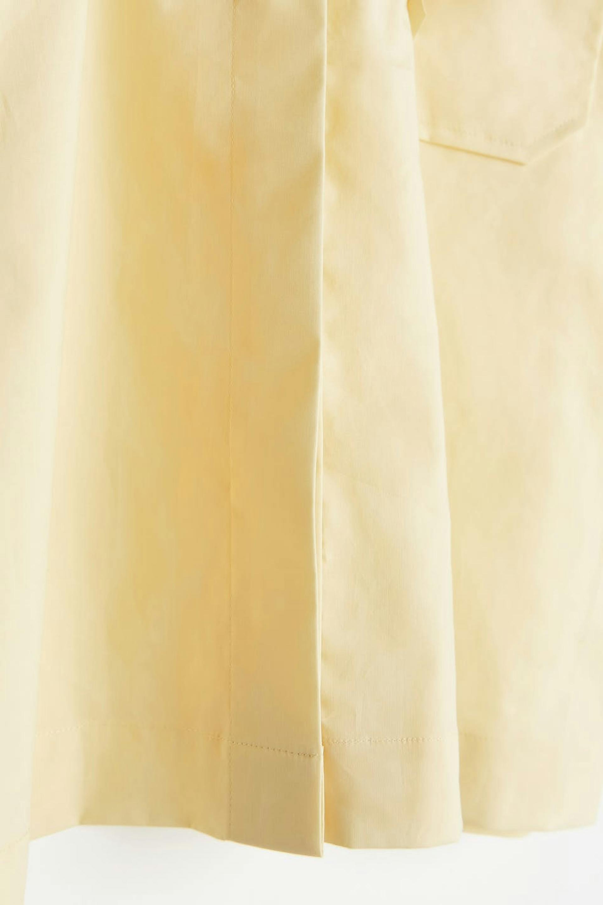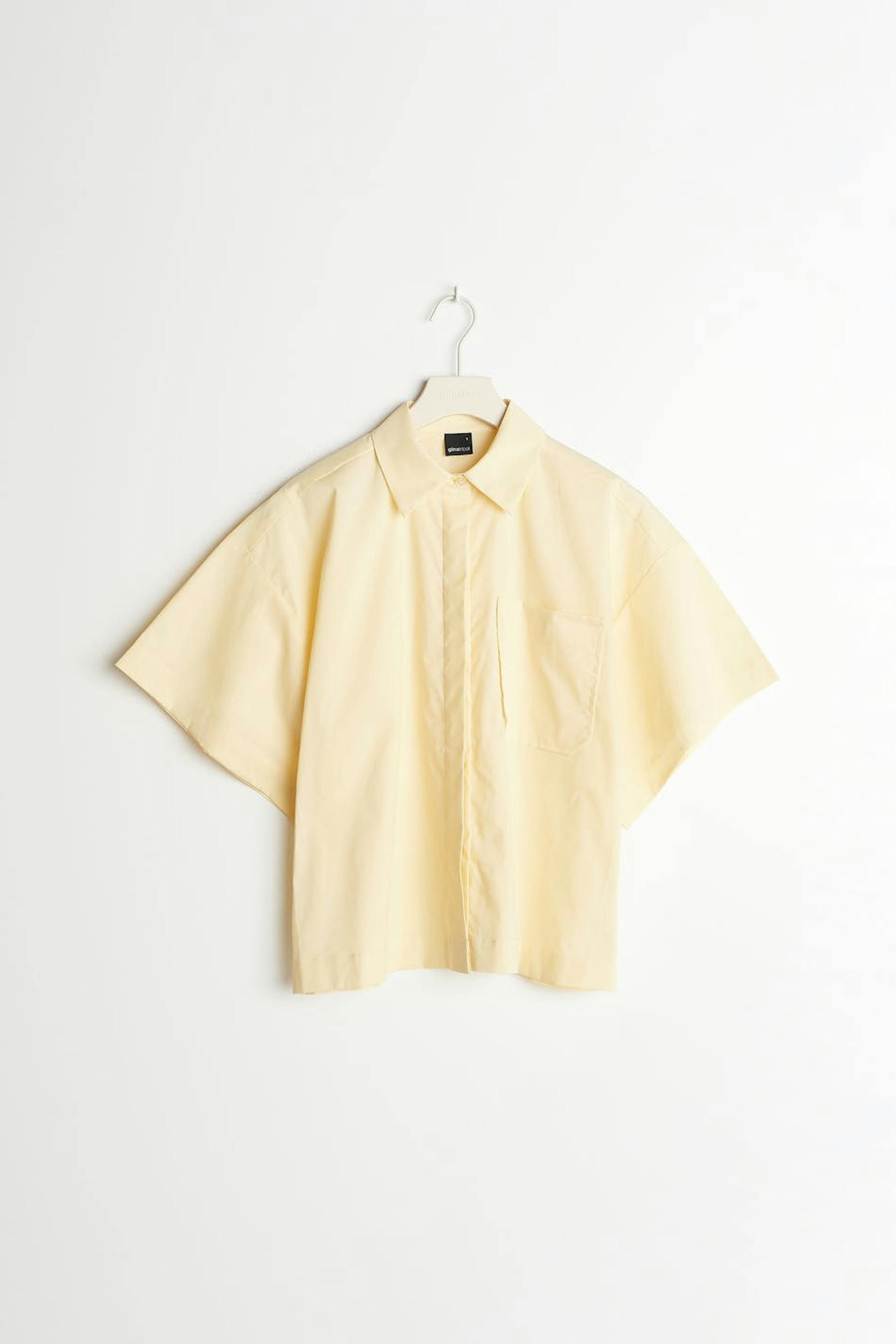Hemd met korte mouwen met boxy pasvorm. Het hemd is geel en heeft een knisperend kwaliteit van popelin katoen. Het heeft verborgen sluitknoop aan de voorzijde, T-shirtmouwen en een borstzak.
