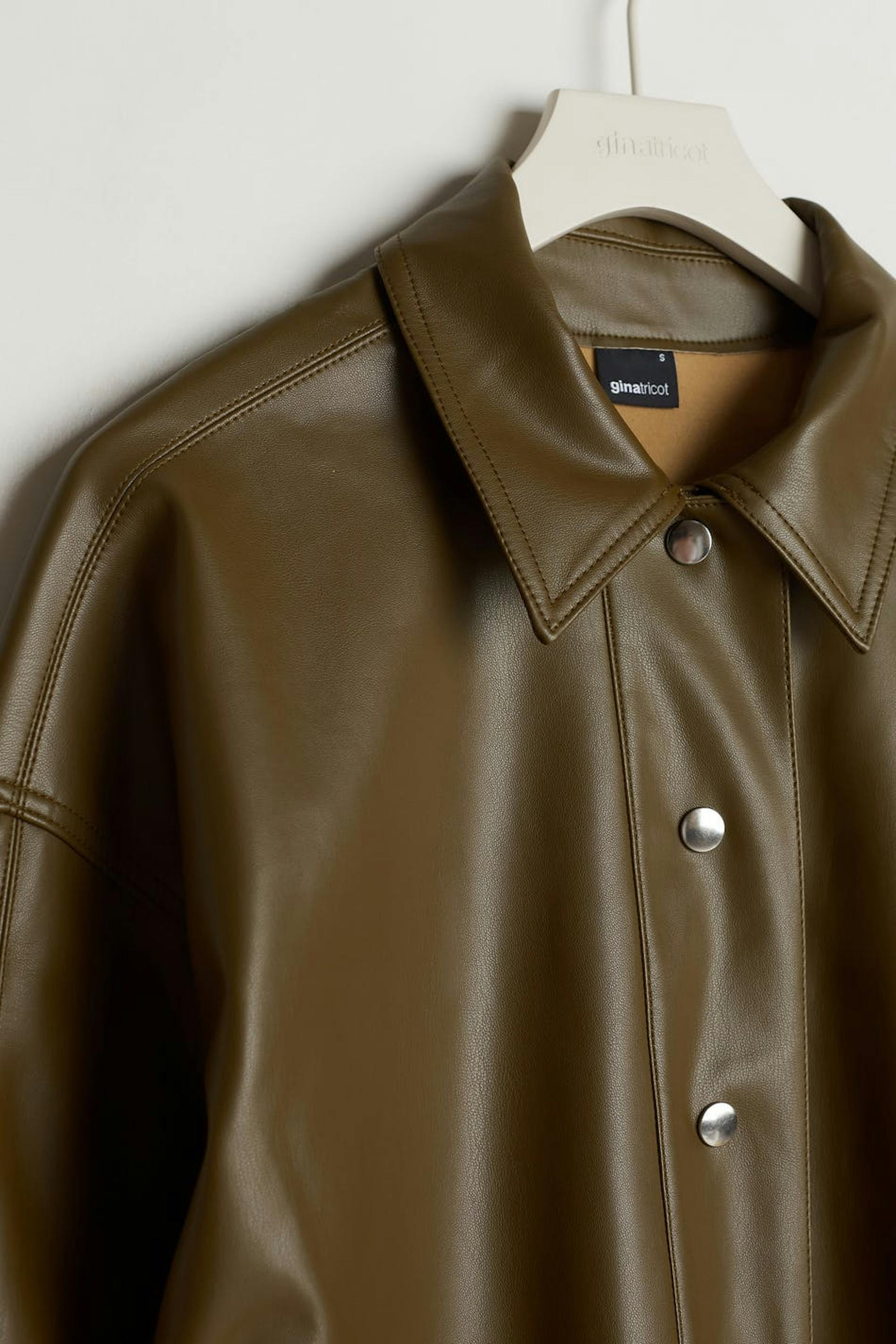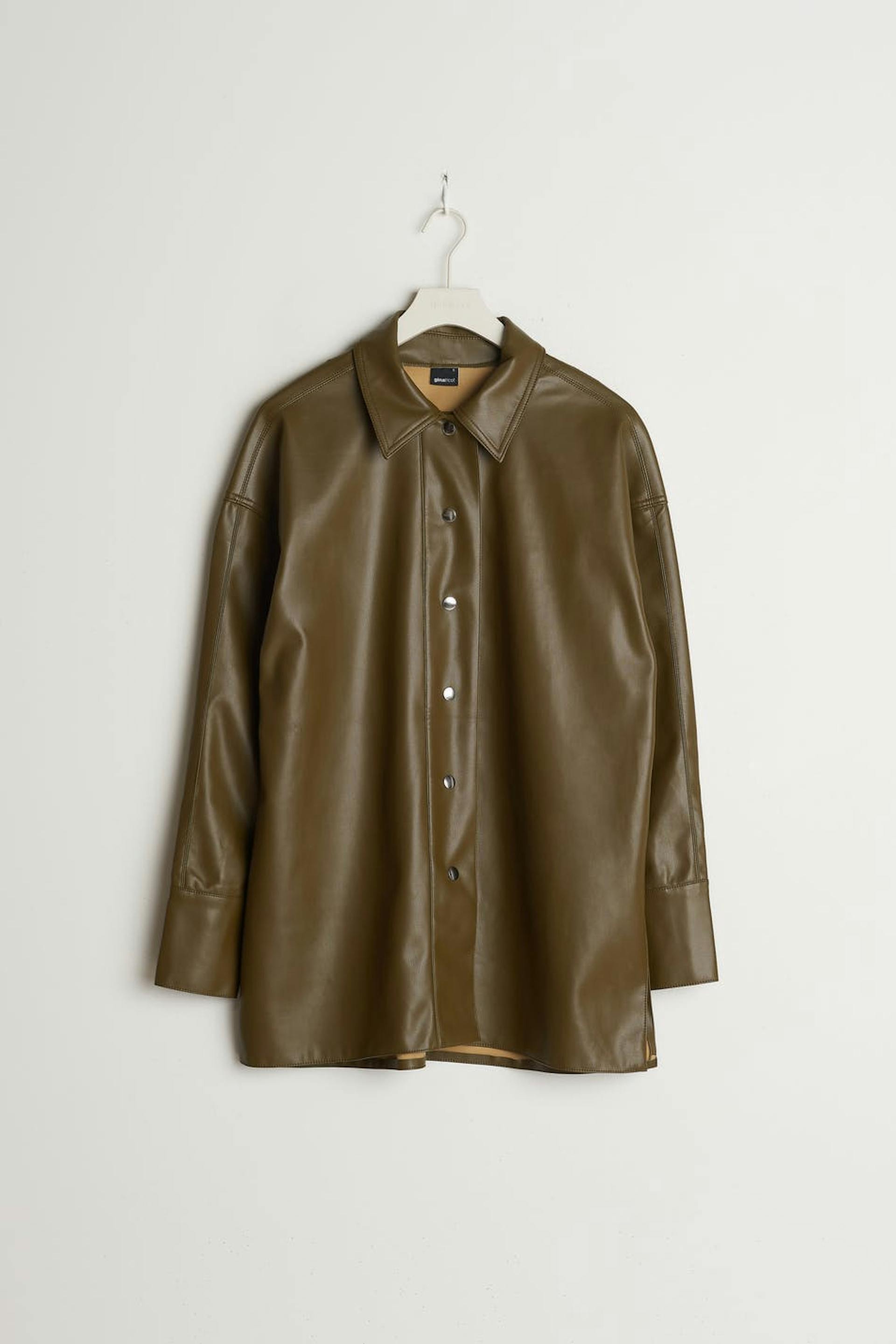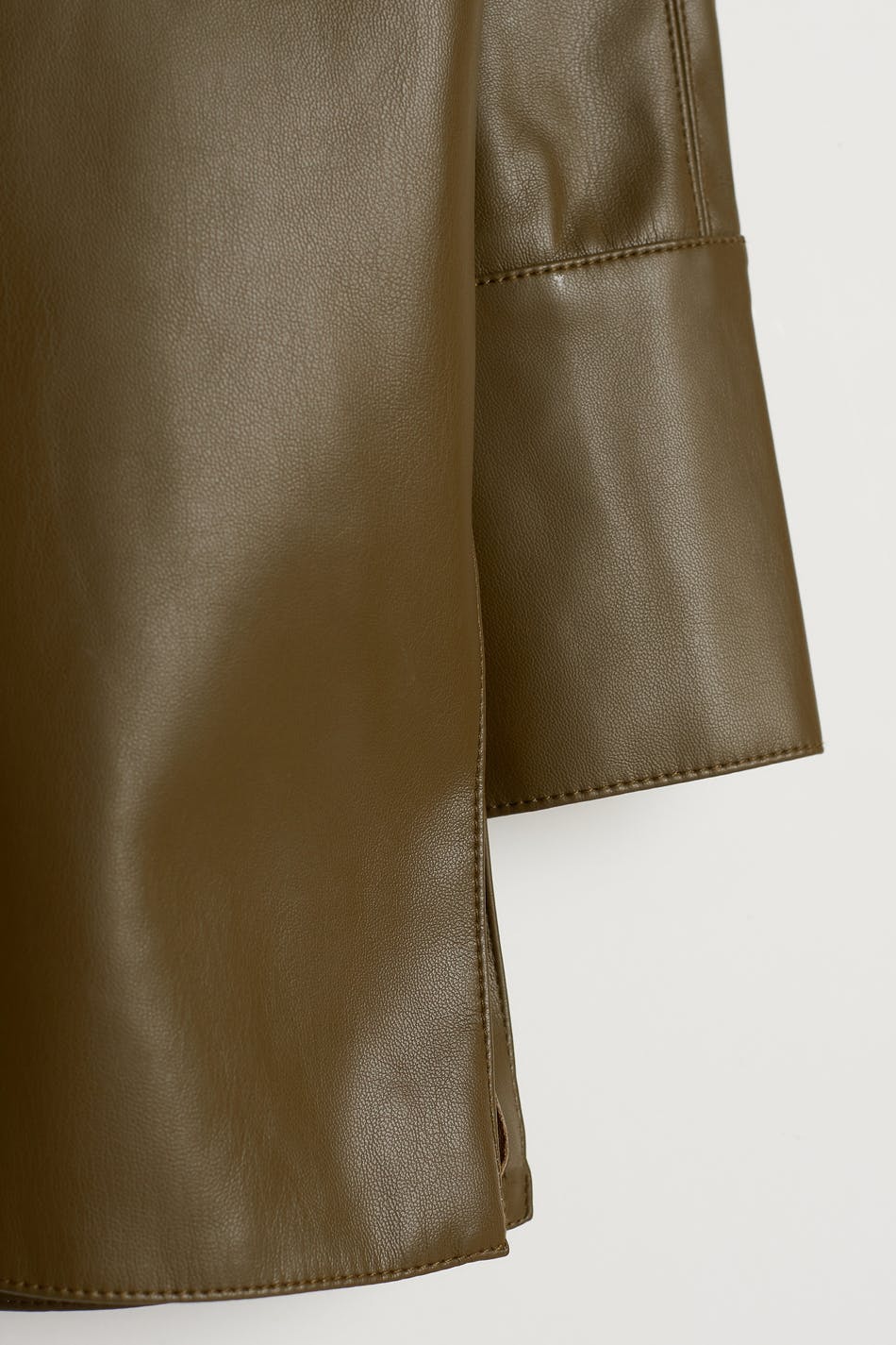 Hemd met een glimmend materiaal uit namaakleer. Het hemd is groen en heeft een sluitknoop aan de voorkant. Het heeft een spleet aan de zijkanten en knoppen aan de manchetten.