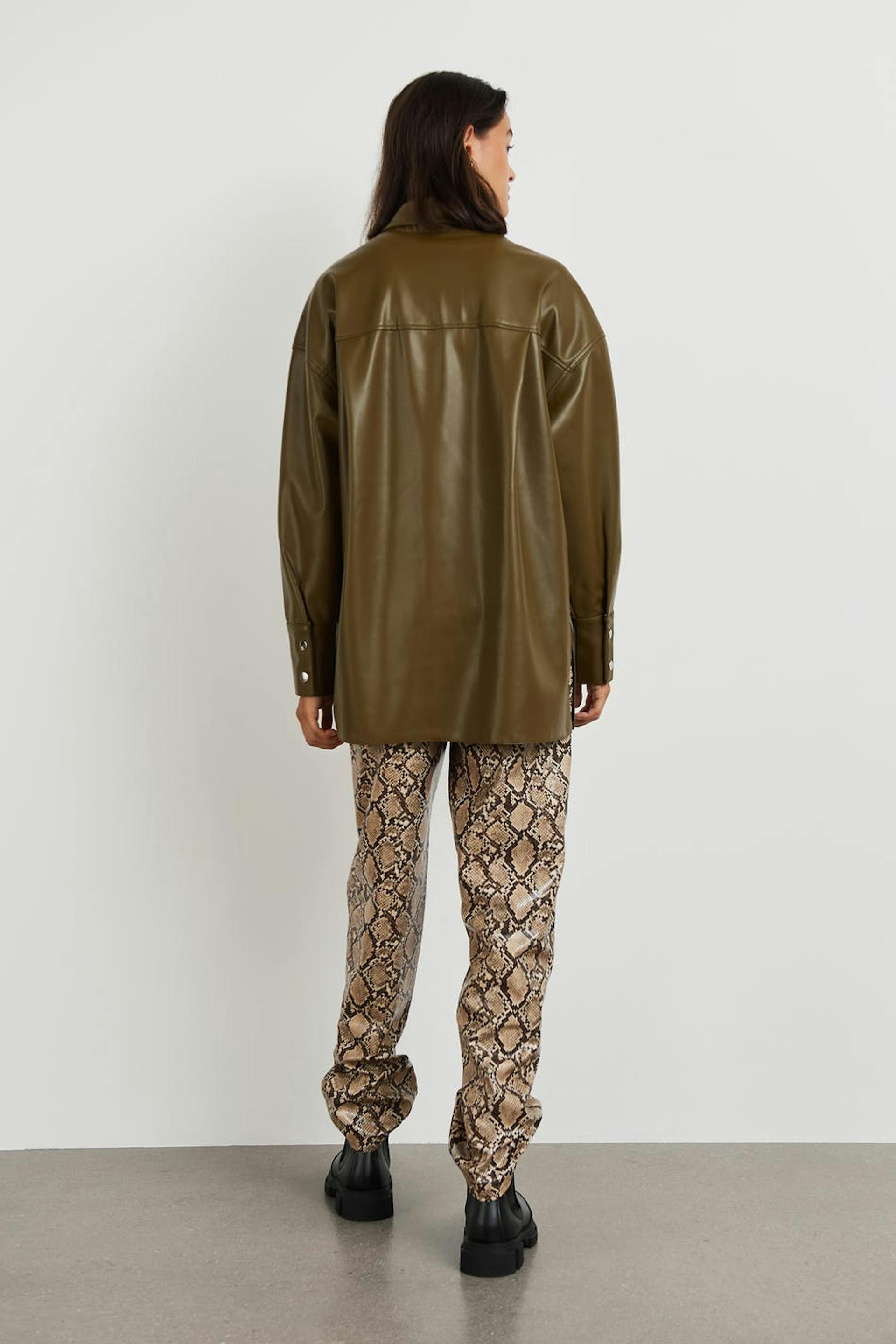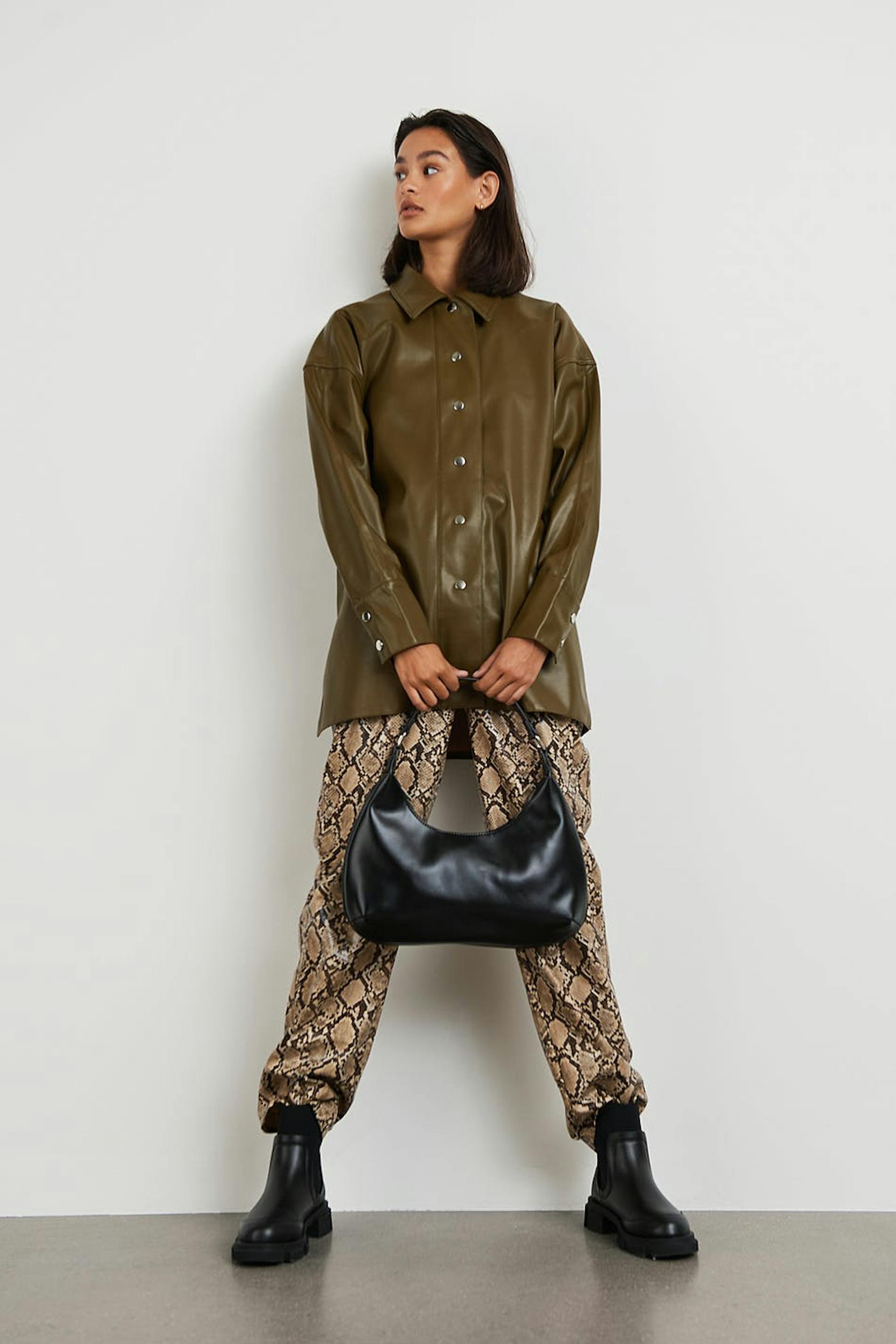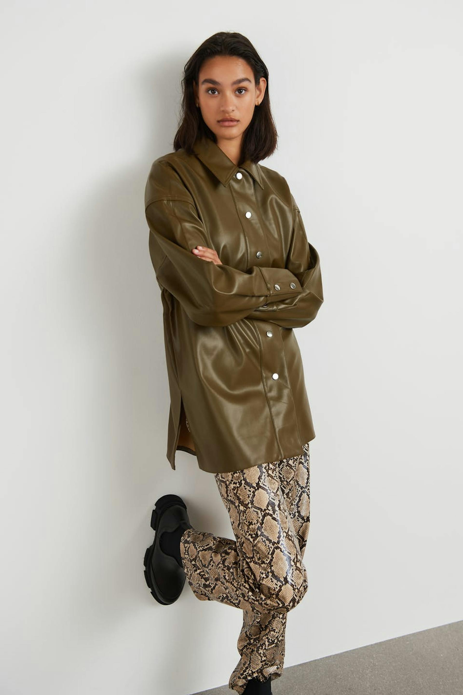 Hemd met een glimmend materiaal uit namaakleer. Het hemd is groen en heeft een sluitknoop aan de voorkant. Het heeft een spleet aan de zijkanten en knoppen aan de manchetten.