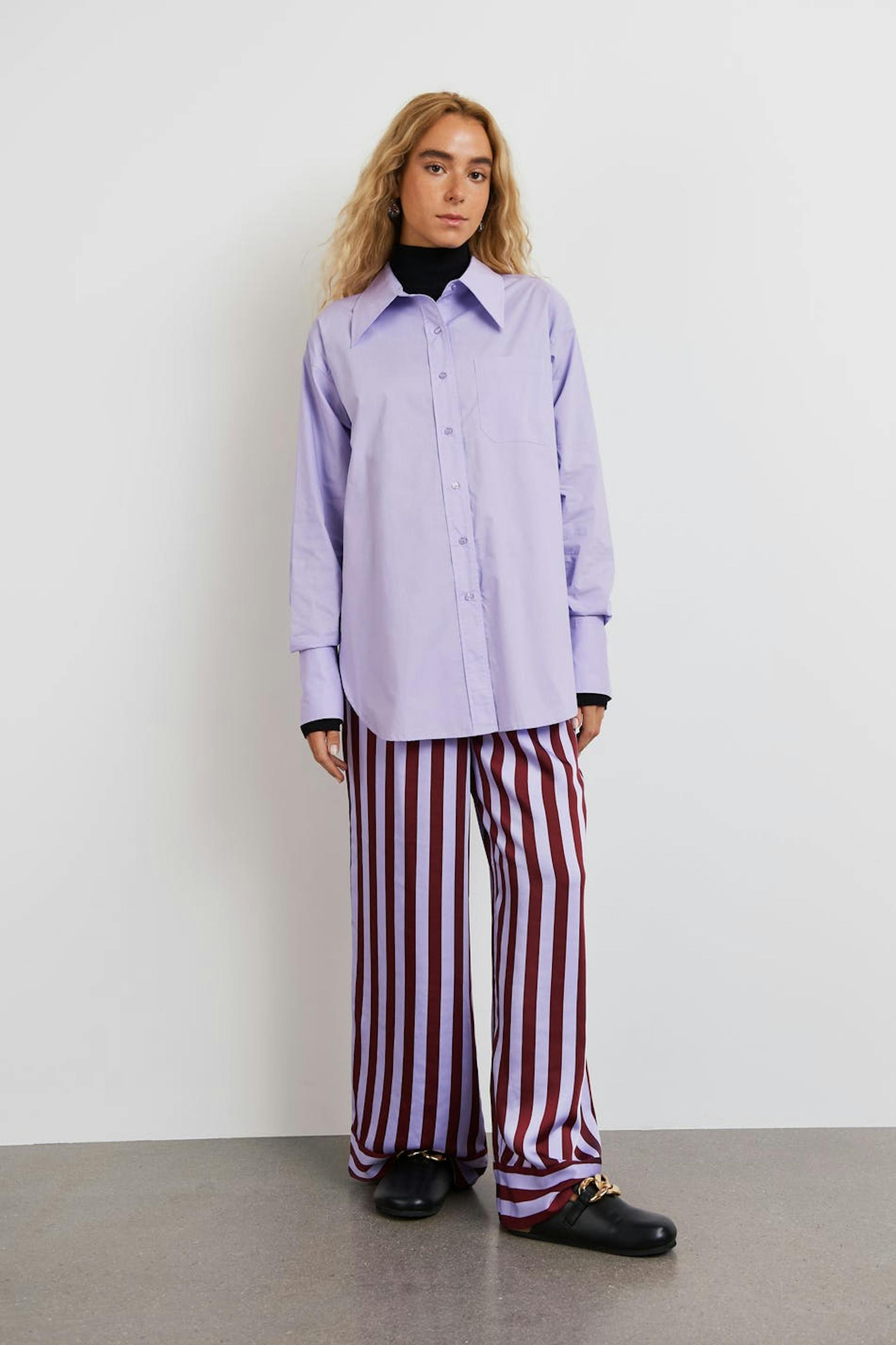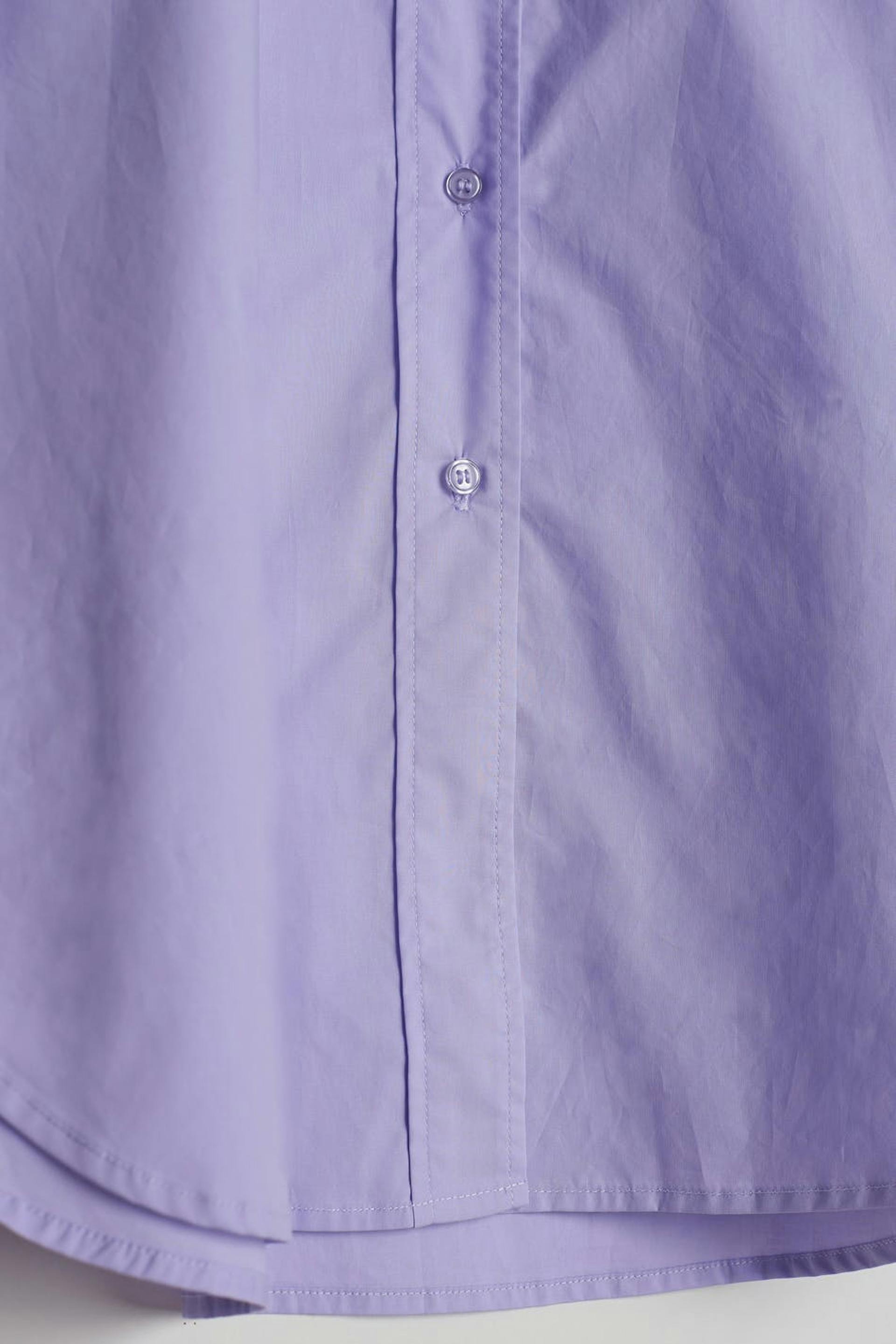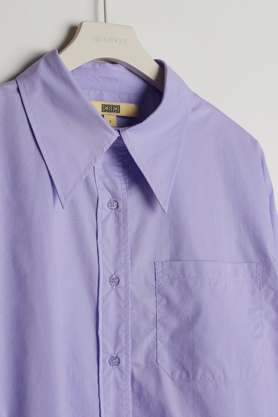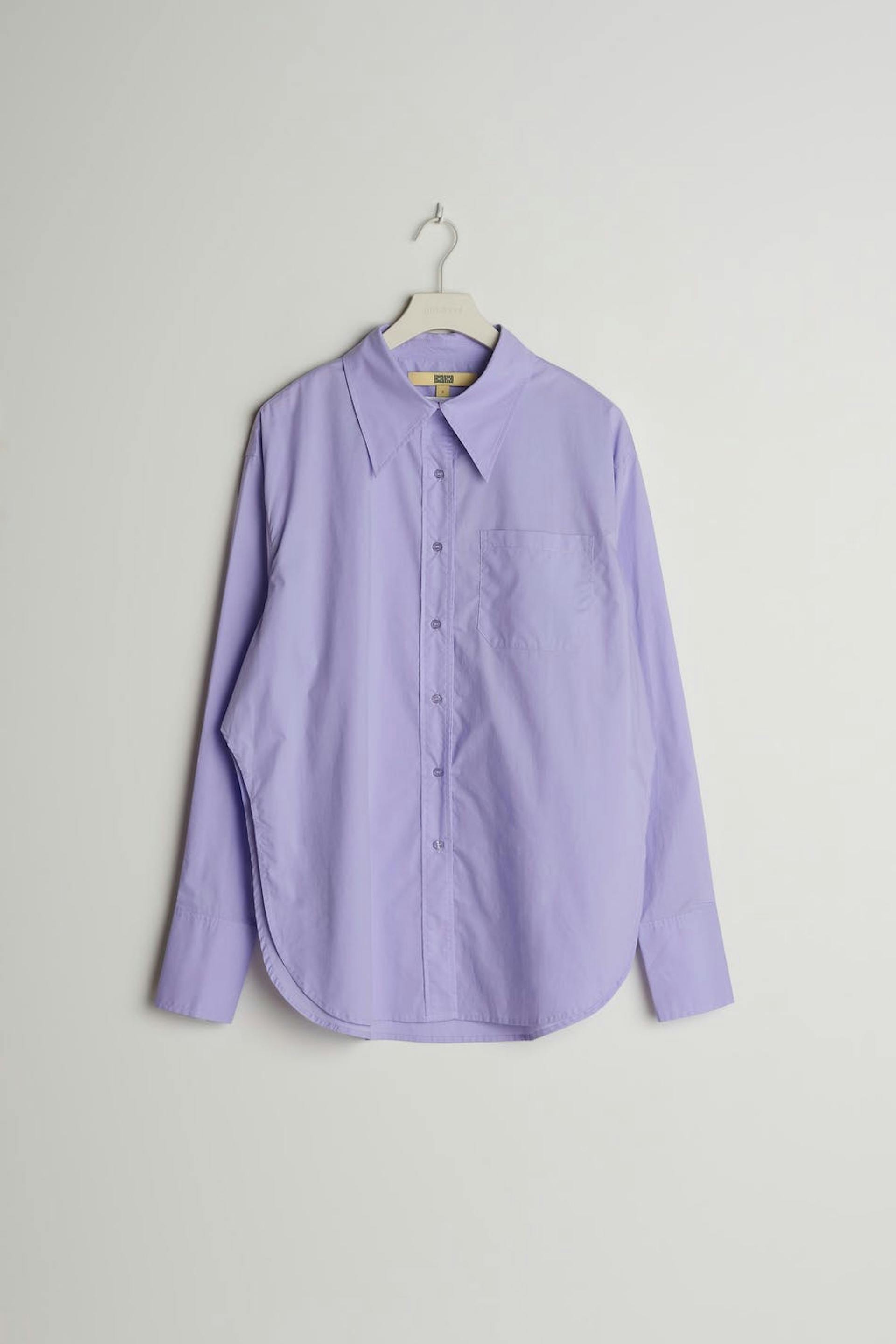 Hobnob X Gina Tricot. Oversized poplin shirt met puntige kraag. Het hemd is paars en heeft een borstzak aan de voorkant. Het heeft hoge manchetten en spleet aan de zijkanten.