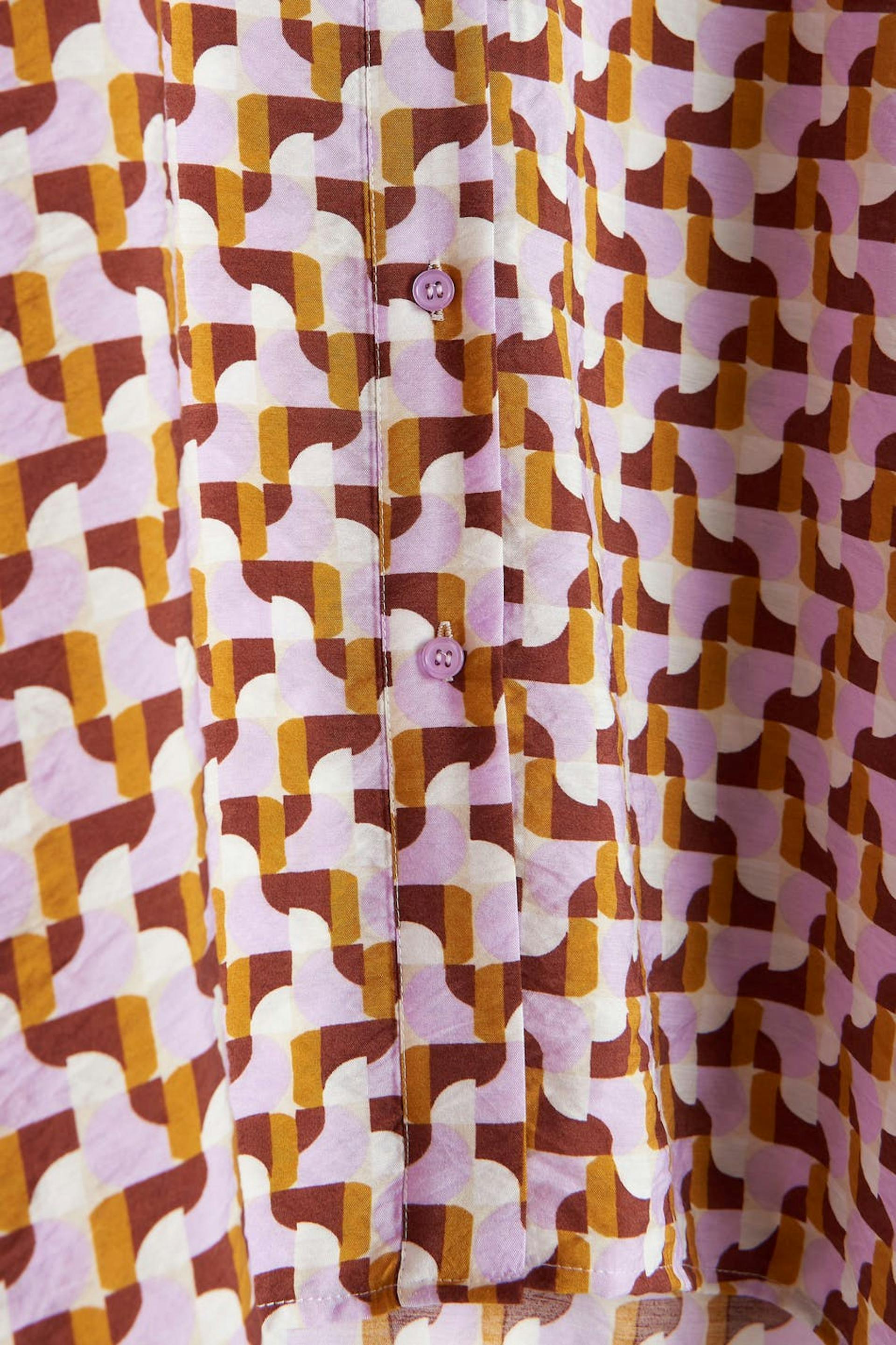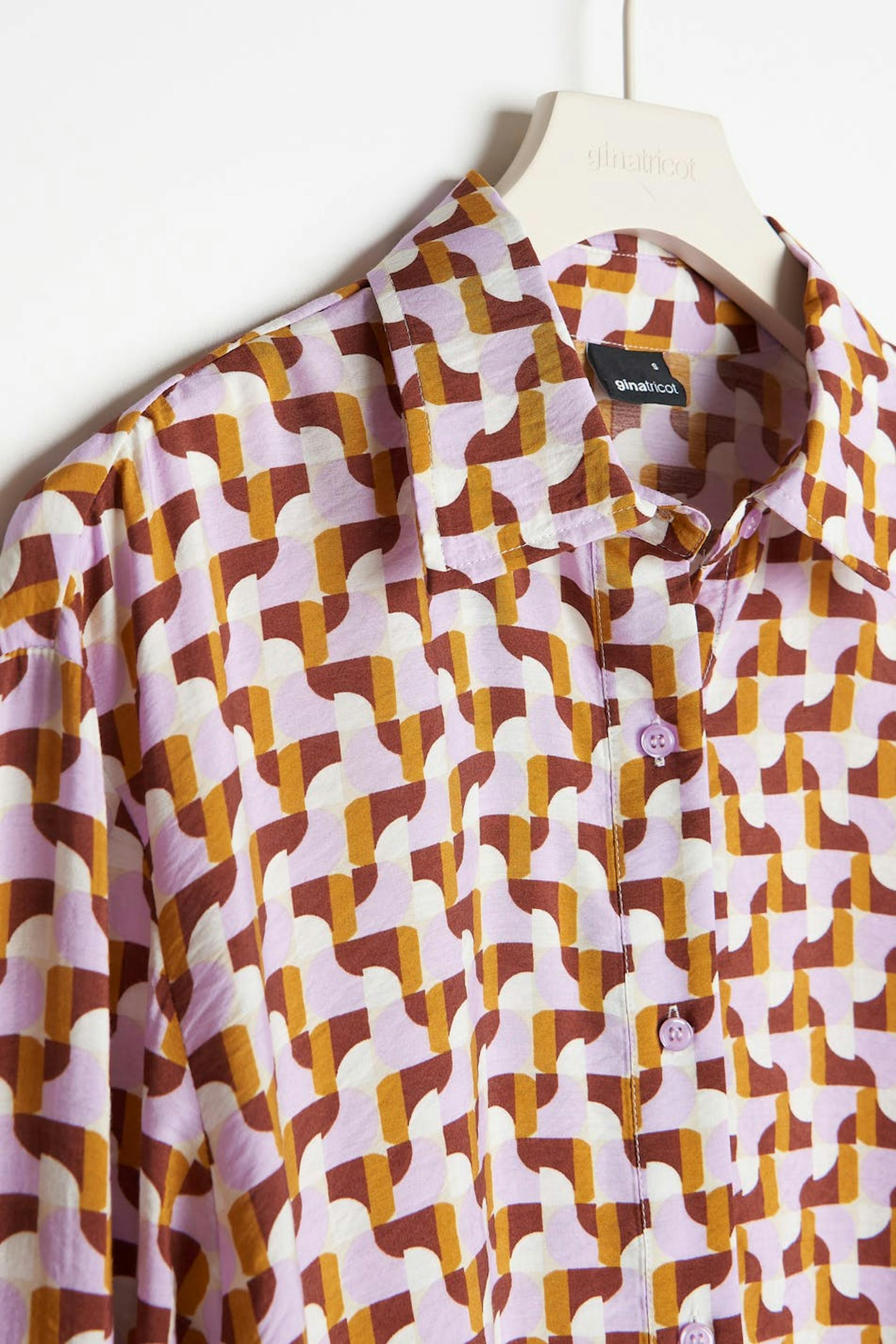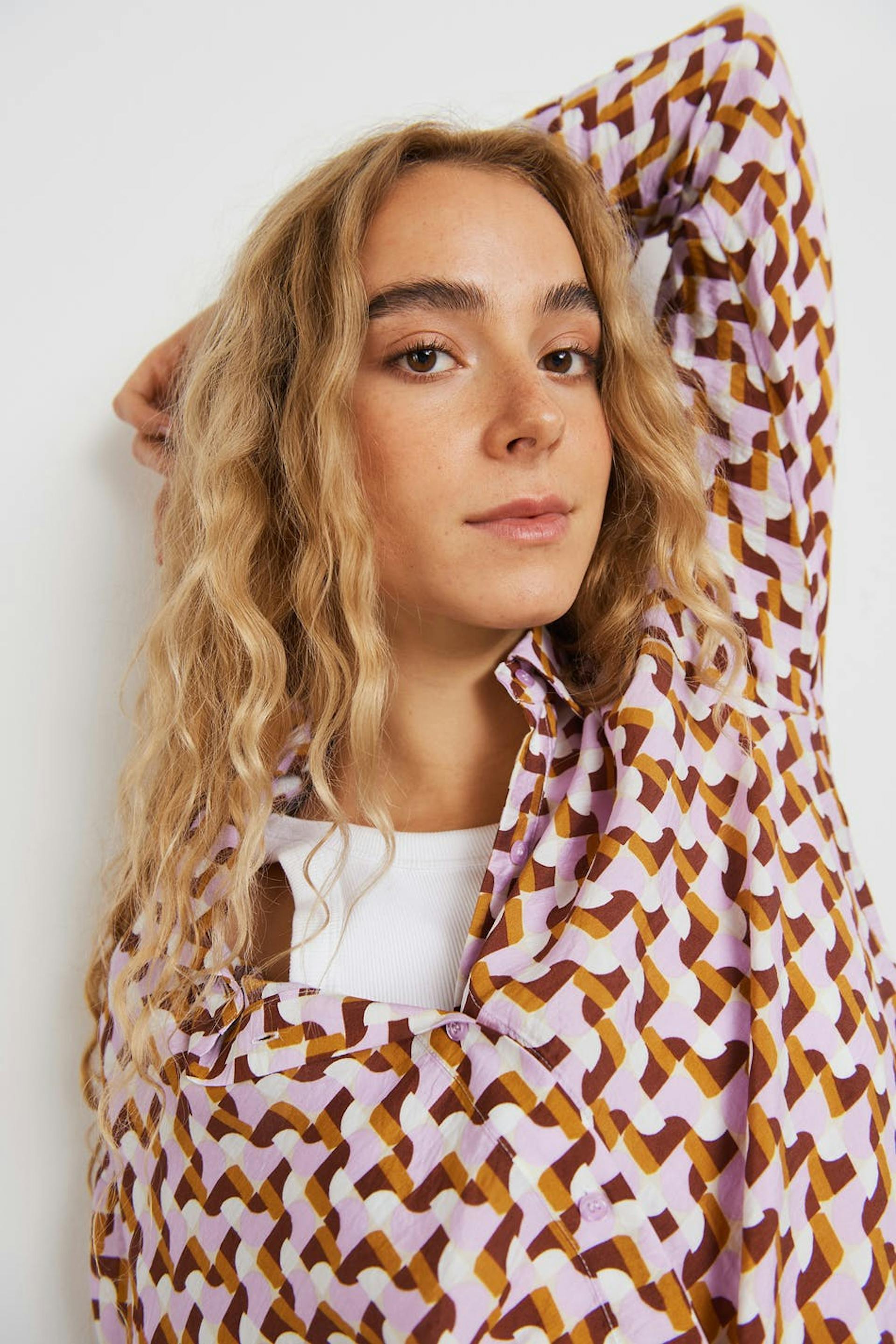 Hemd met patroon met een overmaatse pasvorm. Het hemd is paars en heeft knooppas aan de voorzijde. Het heeft een kraag en manchetten met zelfbinder.