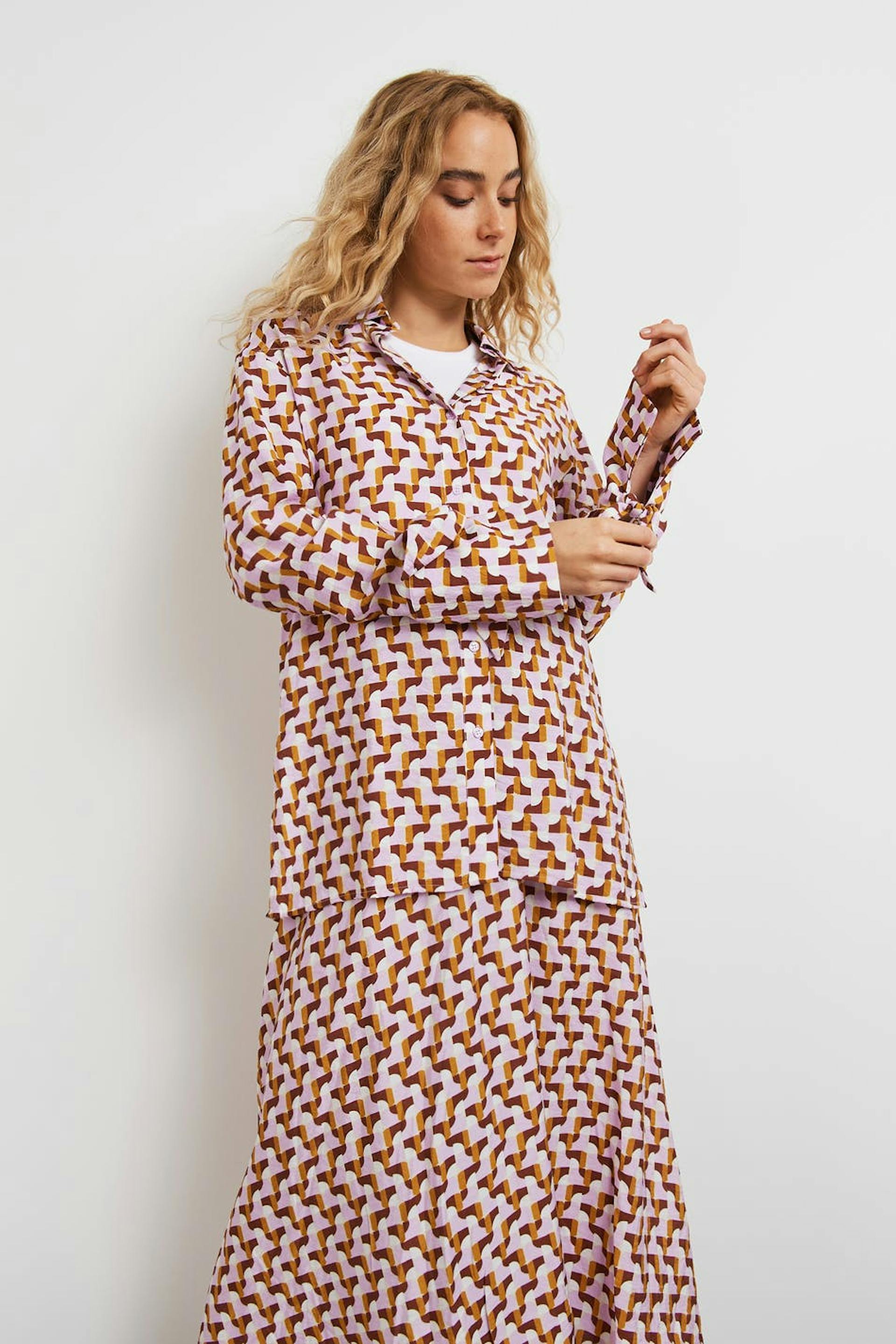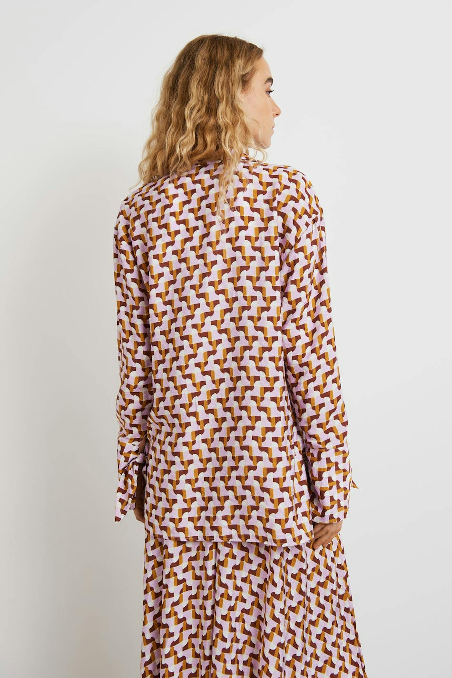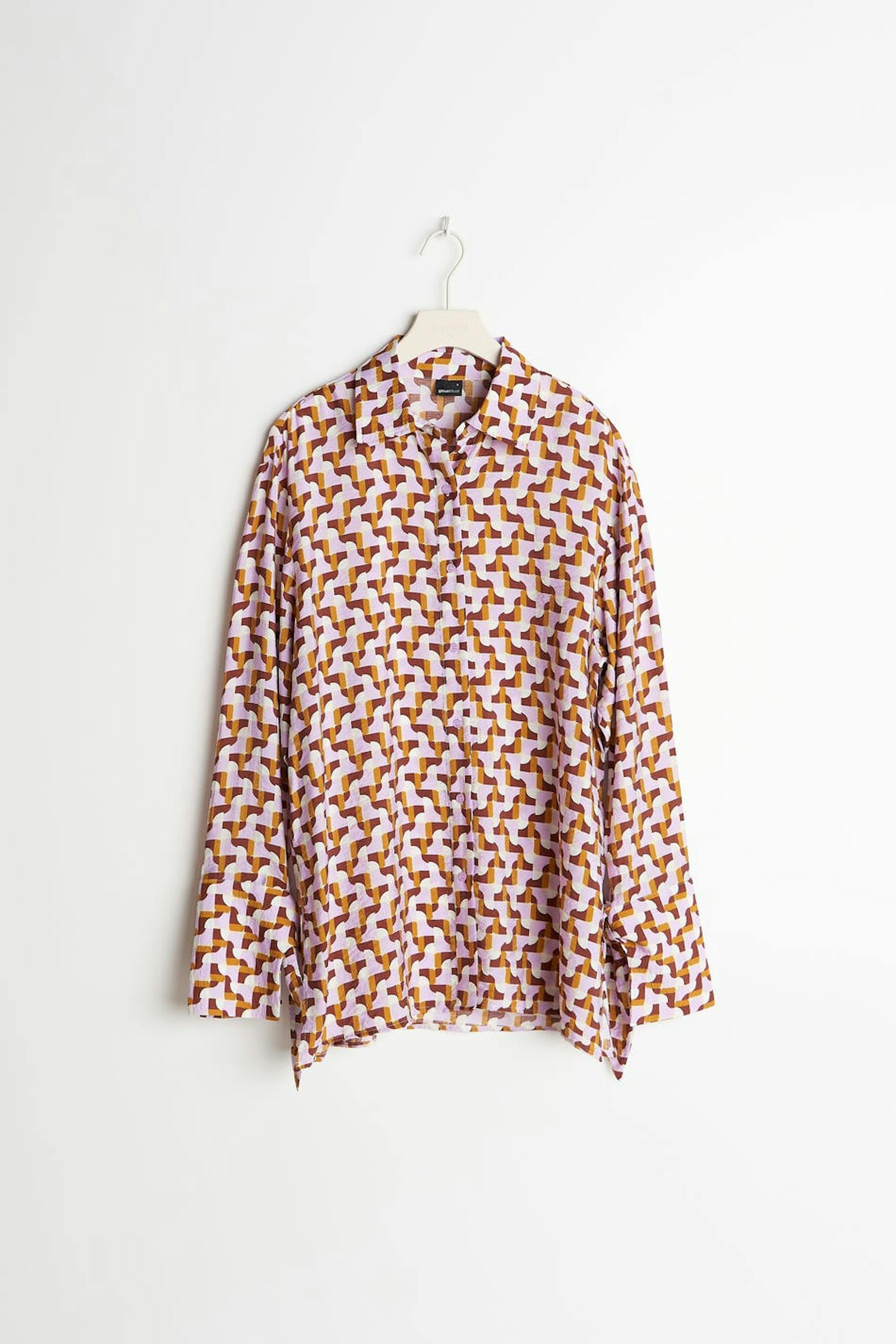 Hemd met patroon met een overmaatse pasvorm. Het hemd is paars en heeft knooppas aan de voorzijde. Het heeft een kraag en manchetten met zelfbinder.